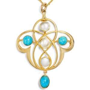 Hier nun steht ein schöner Peridot im Zentrum eines typisch britischen Schmuckstücks aus den ersten Jahren des 20. Jahrhunderts. Der Stein wurde in ovalem Facettenschliff geformt, der durch Lichteinfall verschiedene Grünnuancen hervorbringt. Der Edelstein ist am Ende eines beweglichen Pendels in einem Lorbeerkranz aus feinen Naturperlen eingehängt. Ein weiteres Pendel mit einem kleineren Peridot schließt die Komposition nach unten ab. Eine zusätzliche Feinvergoldung über dem Gold der Fassung lässt das Schmuckstück besonders samtig leuchten und verstärkt so die Farbwirkung der grünen Edelsteine.