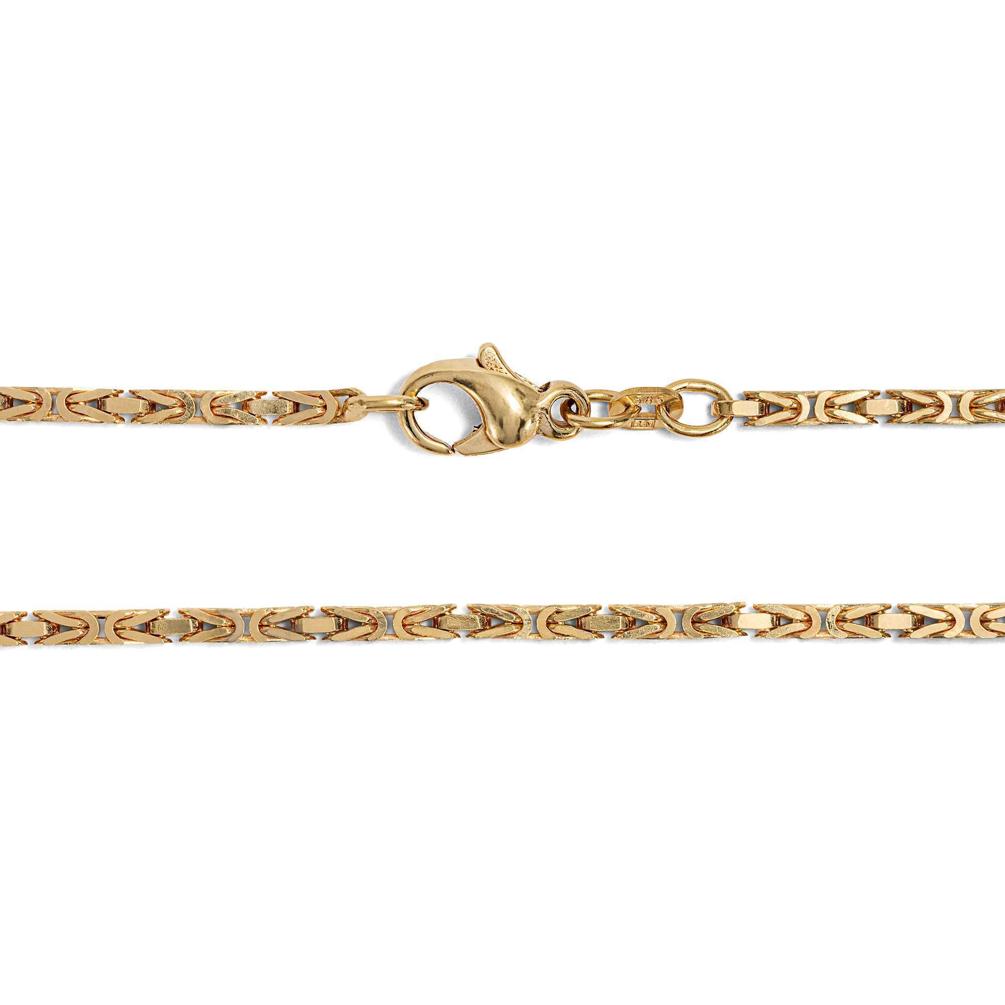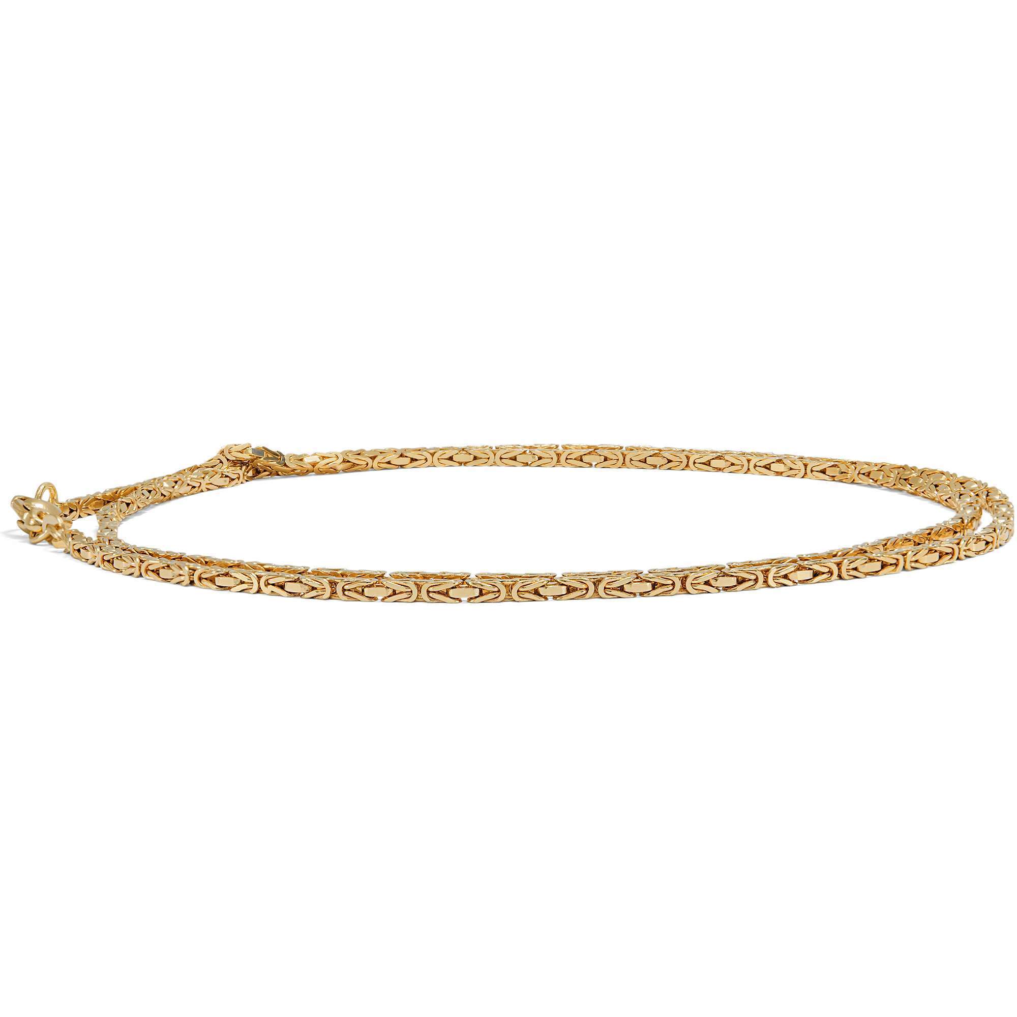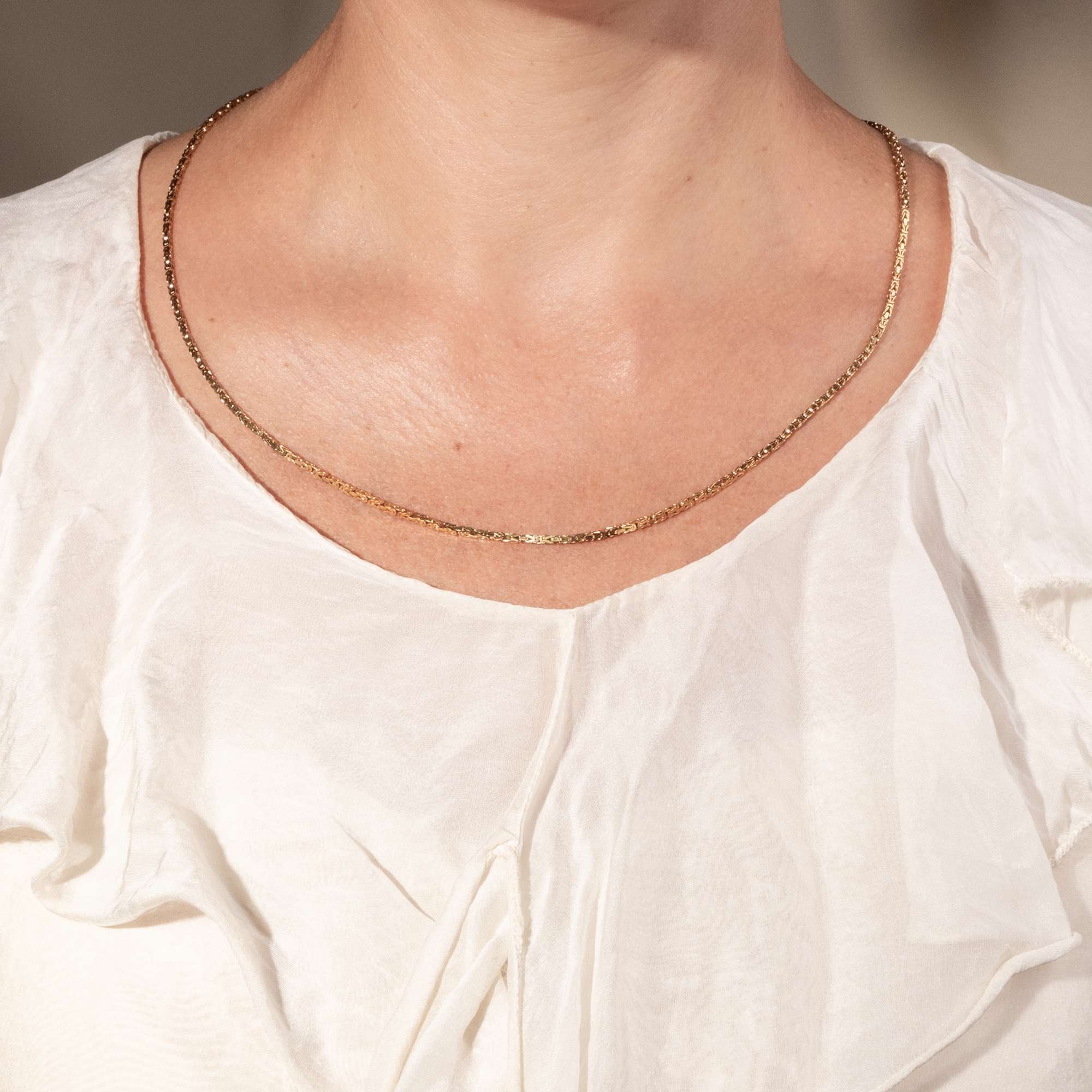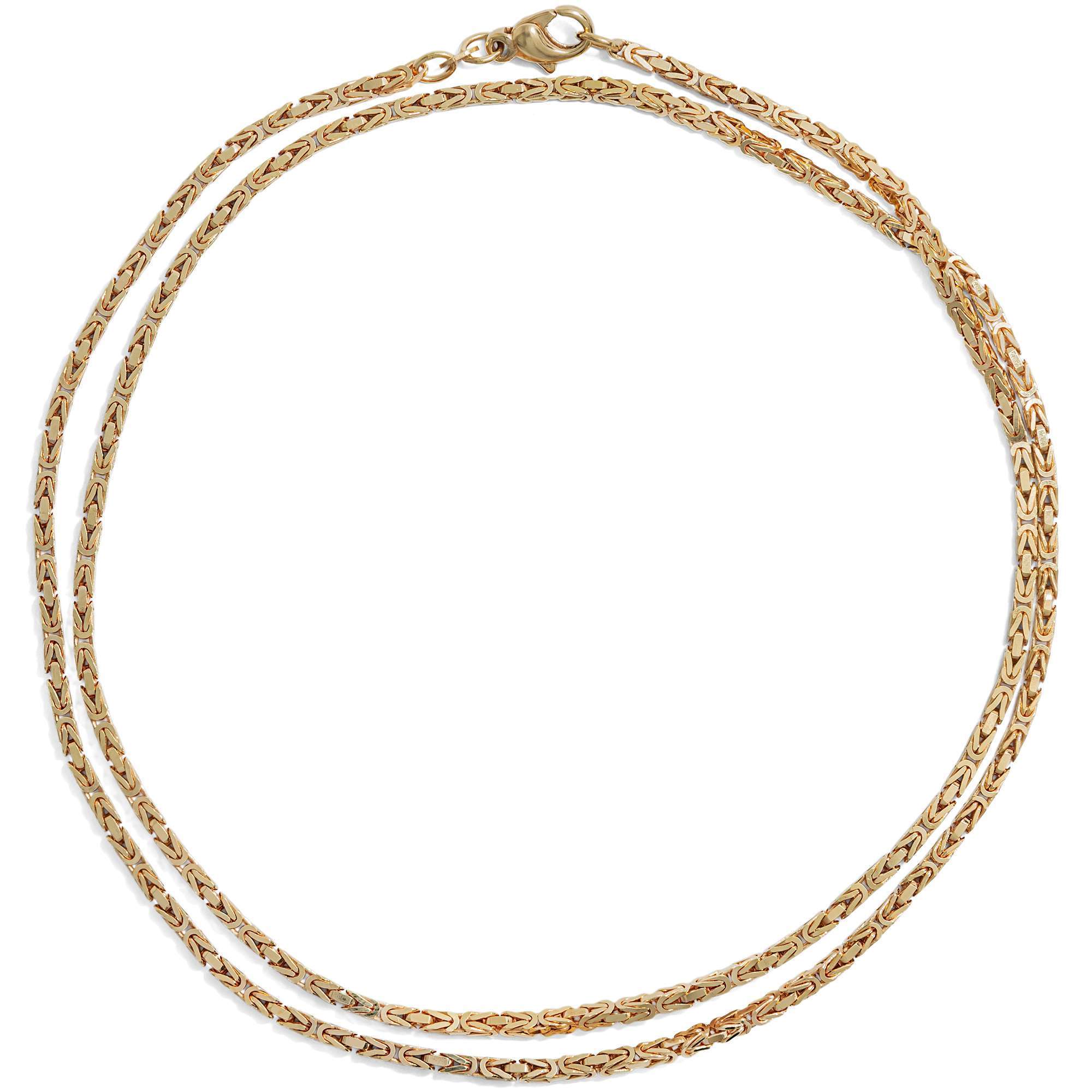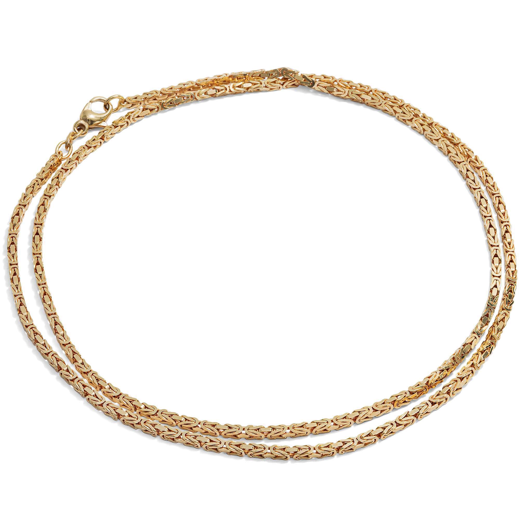 Die Kette ist ein schönes Beispiel für einen Schmuckentwurf, der nie aus der Mode gekommen ist. Das in den Jahren um 1990 in der Manufaktur von Friedrich Binder in Mönsheim gefertigte Schmuckstück besteht aus leicht rötlichem, 14-karätigem Gold. Die Kette zeigt sich im klassischen Königskettenmuster aus kunstvoll verschlungenen Gliedern. Mit ihrer Länge von 60 Zentimetern ist sie ein schöner Blickfang am Hals.