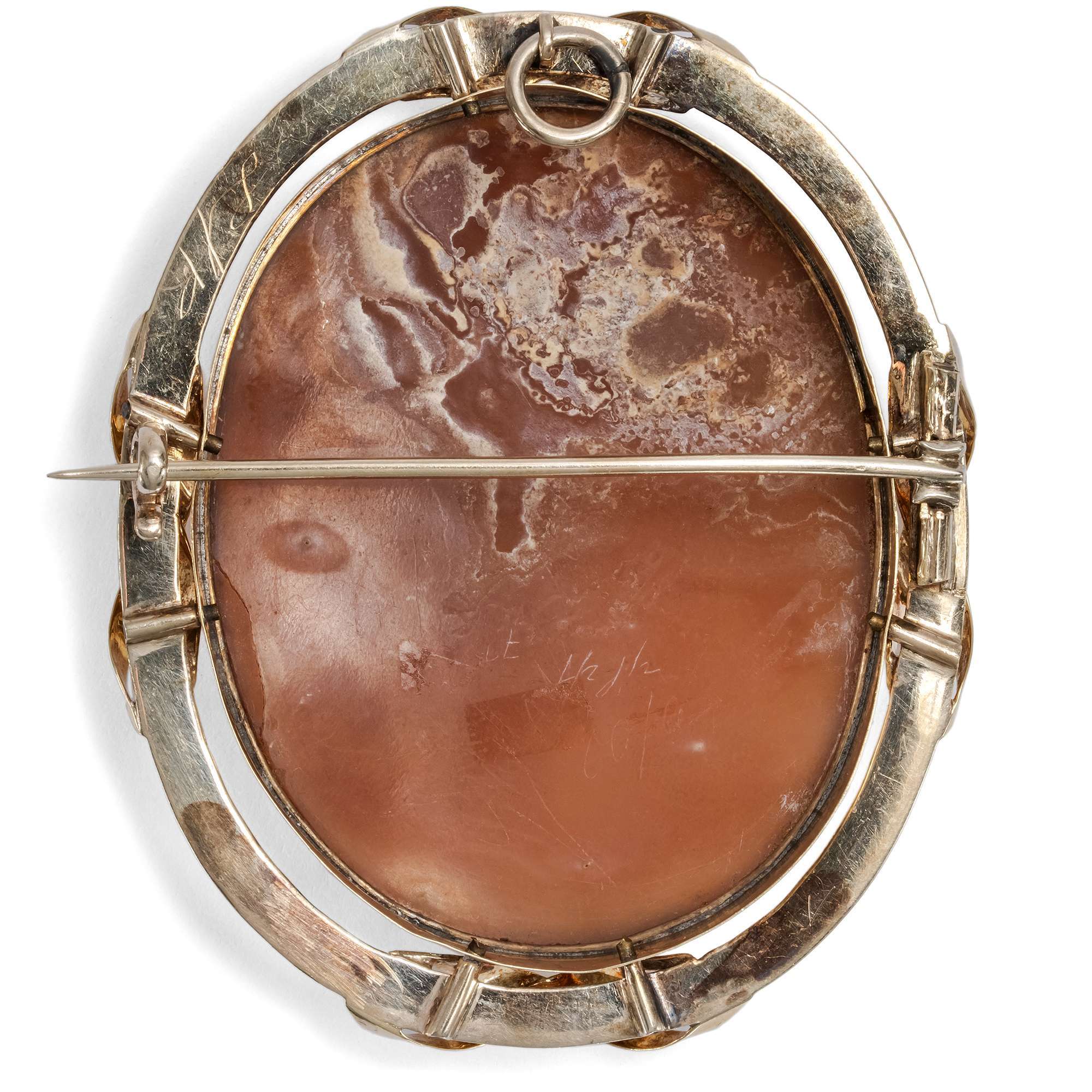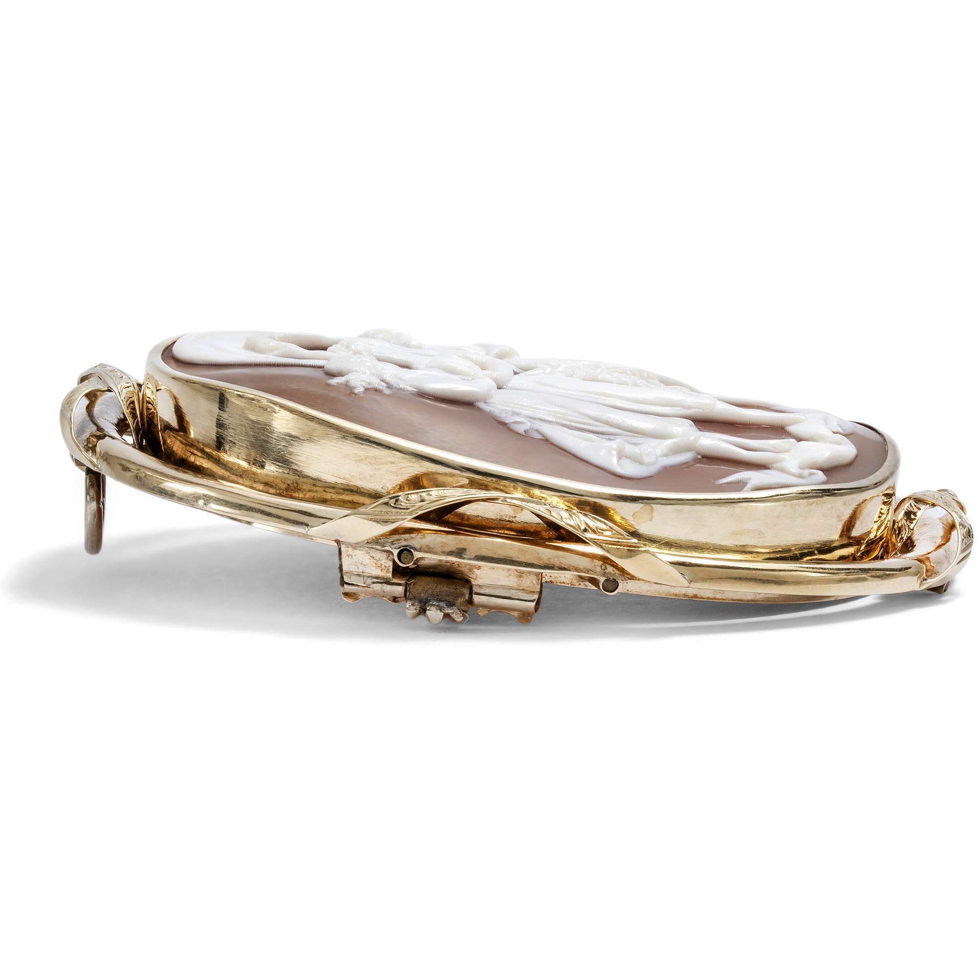 Material: Eine Kamee aus der Schale einer Helmschnecke (Cassis madagascariensis), ca. 49,8 x 38,3 mm Gold 625/000, entspricht 15 Karat