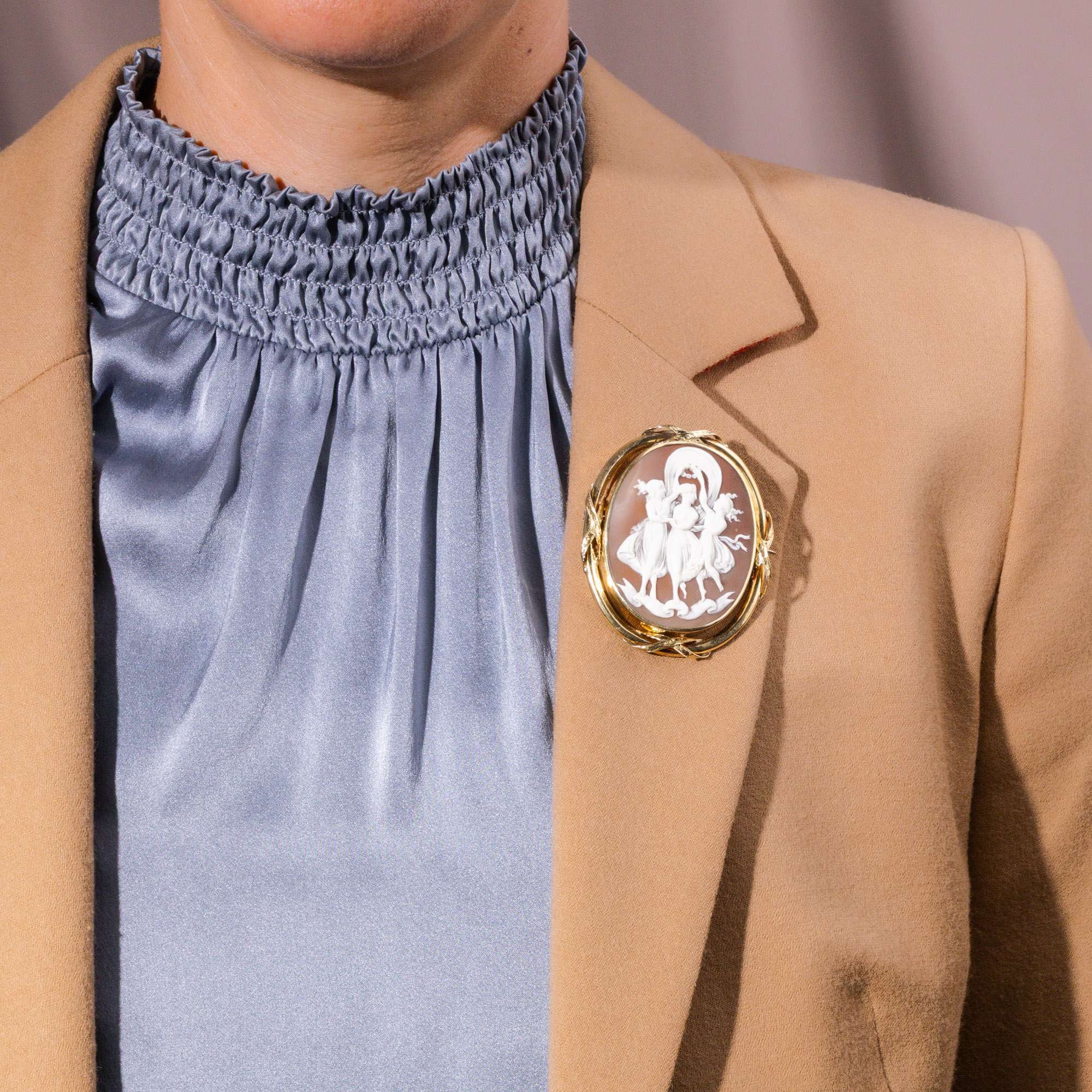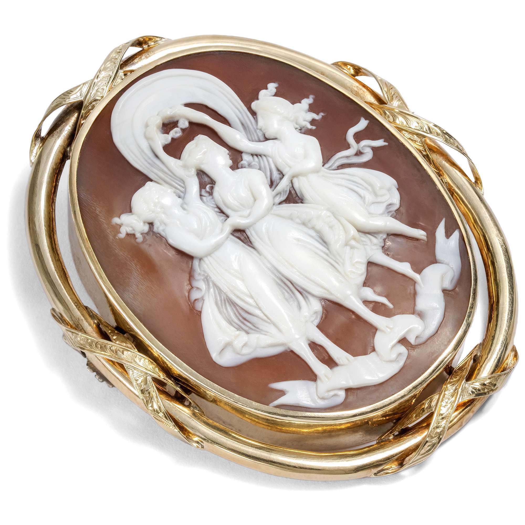 Das Schmuckstück ist Ausdruck einer ungebrochenen Antikenbegeisterung, die im 19. Jahrhundert ihren Höhepunkt erreichte. Die schlichte Goldfassung der Gemme mit gravierten Kreuzbändern entstand vermutlich in England und besteht aus 15-karätigem Gold. Eine reizvolle Verbindung italienischer Gravierkunst mit mitteleuropäischem Goldschmiedehandwerk. Entdeckt haben wir die drei Grazien im Süden Englands und dabei sofort ins Herz geschlossen – denn wer wollte nicht gern von Anmut, Glanz und festlicher Freude begleitet sein?