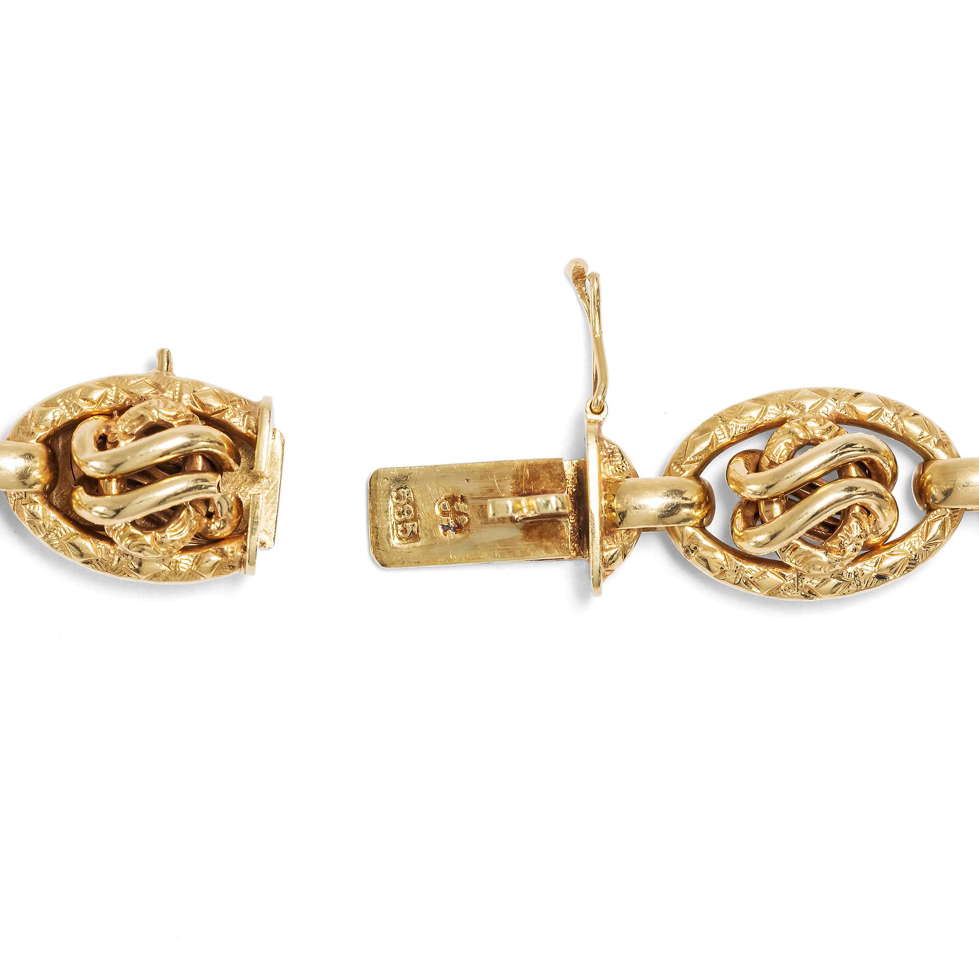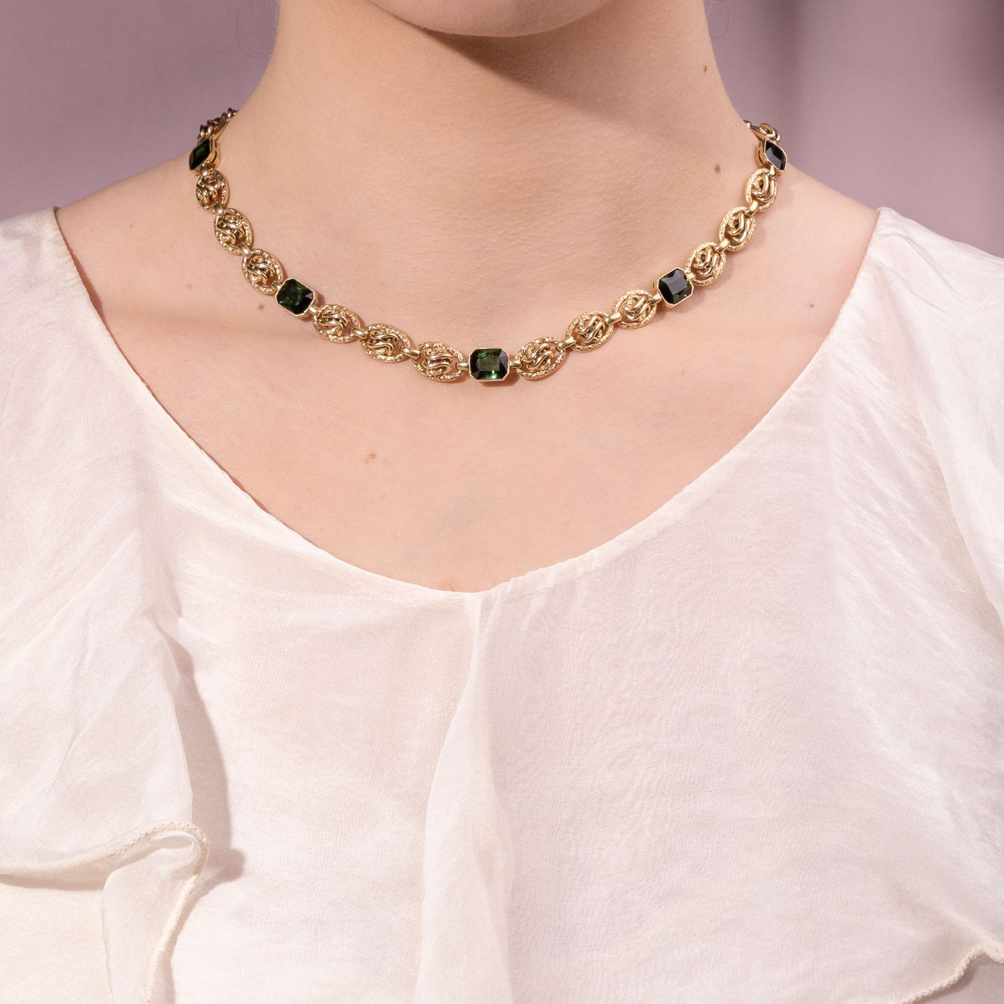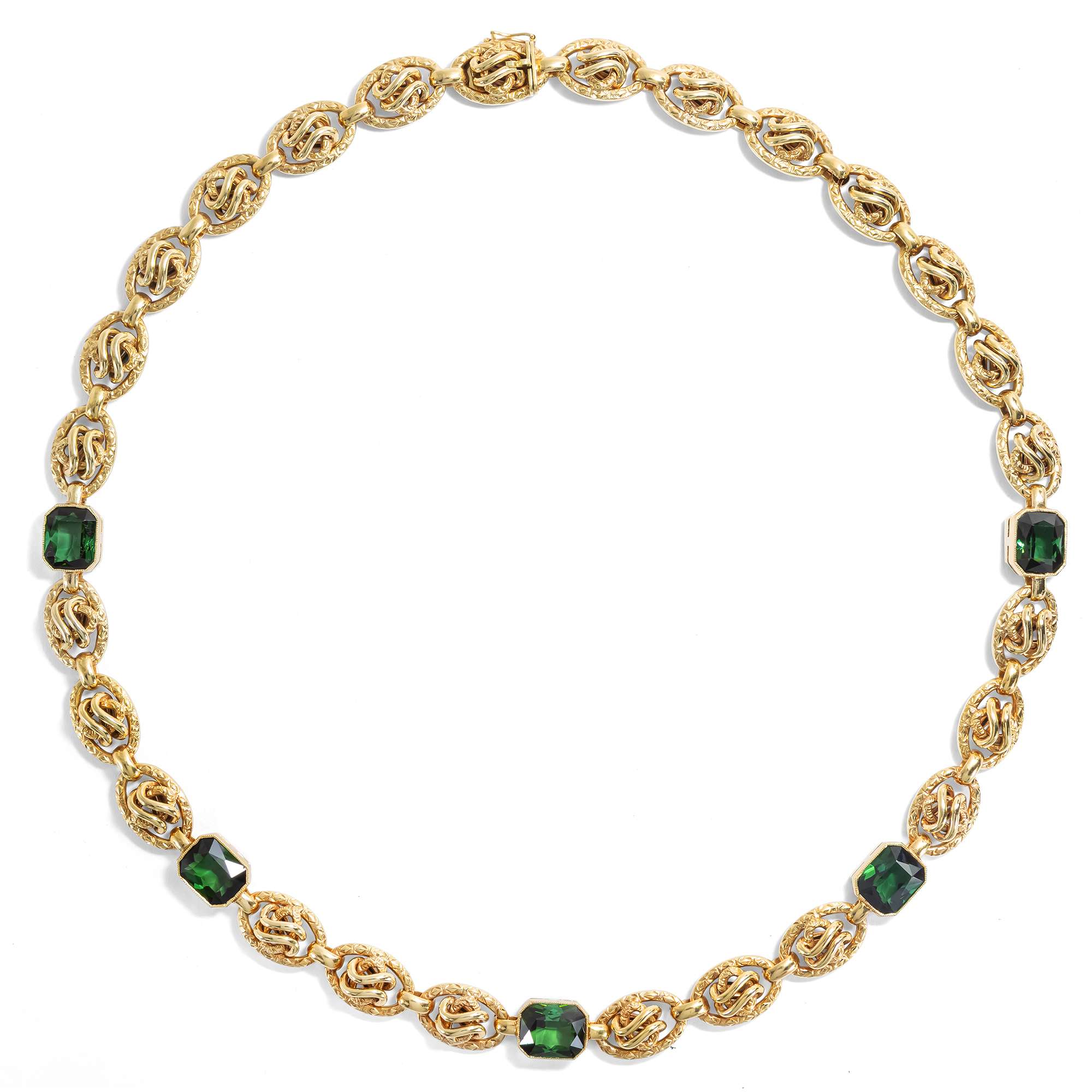 Das hier vorliegende Collier ist so ein Fall: Aus 14-karätigem Gold gefertigt, besteht das Schmuckstück aus ovalen Gliedern, denen reich ornamentierten Elemente aus voluminöse Knotenformen aufgelegt sind, die an Arbeiten der Jahre um 1840 erinnern. Stöbern Sie doch einmal in unserer Kategorie „Biedermeier“, im Reiter „Epochen“, und sie werden einige solcher Beispiele finden. Fünf natürliche grüne Turmaline, sog. Verdelithe, im achteckigen Scherenschliff sind in regelmäßigen Abständen zwischen die Goldglieder gesetzt und erfreuen mit sehr guter Reinheit und herrlicher flaschengrüner Fabigkeit.
