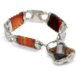 Der vorliegende Armschmuck legt hiervon beredtes Zeugnis ab. Er entstand um 1850 und vereint all die oben genannten Stilmerkmale. Als breiter, mittig ausschwingender Reif gestaltet, ist er durchbrochen gearbeitet und wirkt so trotz aller Präsenz nicht zu schwer. Gravierte, dem Barock entlehnte Voluten und vegetabil anmutende Ranken und Blüten laufen um den gesamten Reif herum. Im Zentrum des Entwurfes steht ein großer Almandin-Granat in einem ungewöhnlichen rechteckigen Cabochonschliff. Er wird von Perlen gerahmt, wobei die Eckpunkte durch Fleur-de-Lis-Ornamente aus Silber mit Diamantbesatz zusätzlich betont werden.