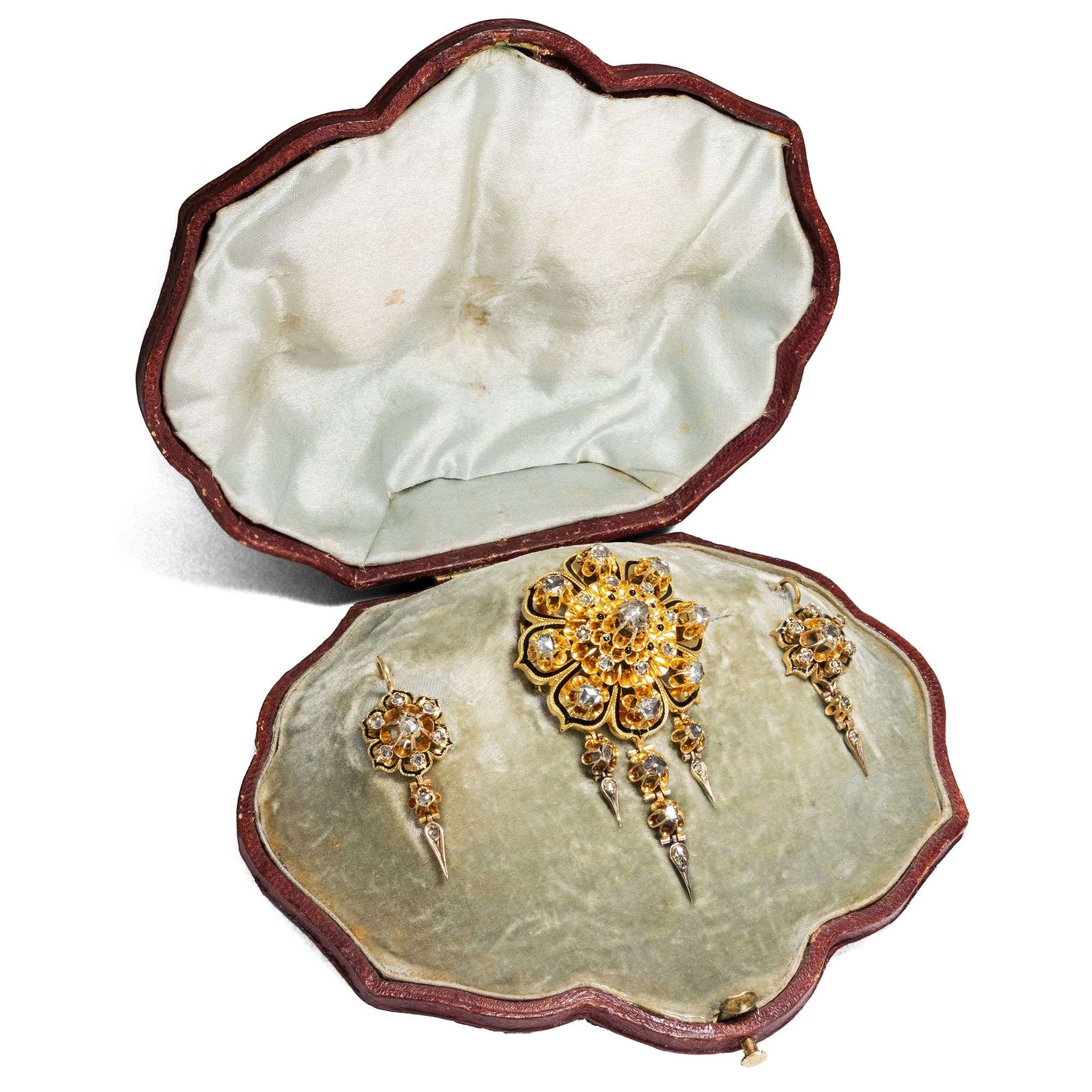 Insgesamt sind etwa 3,00 ct Diamanten in hochkarätiges Gold gefasst. Das schöne Set hat sich in seinem passenden Etui erhalten, ausgeschlagen mit lindgrünem Samt und ebensolcher Seide. Damals wie heute ist es ein Begleiter zu vielerlei Gelegenheiten.