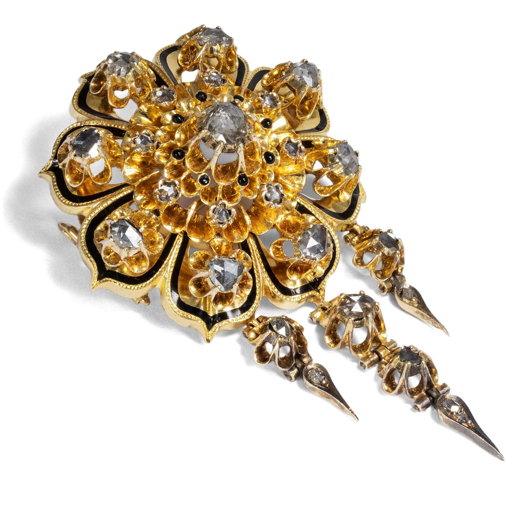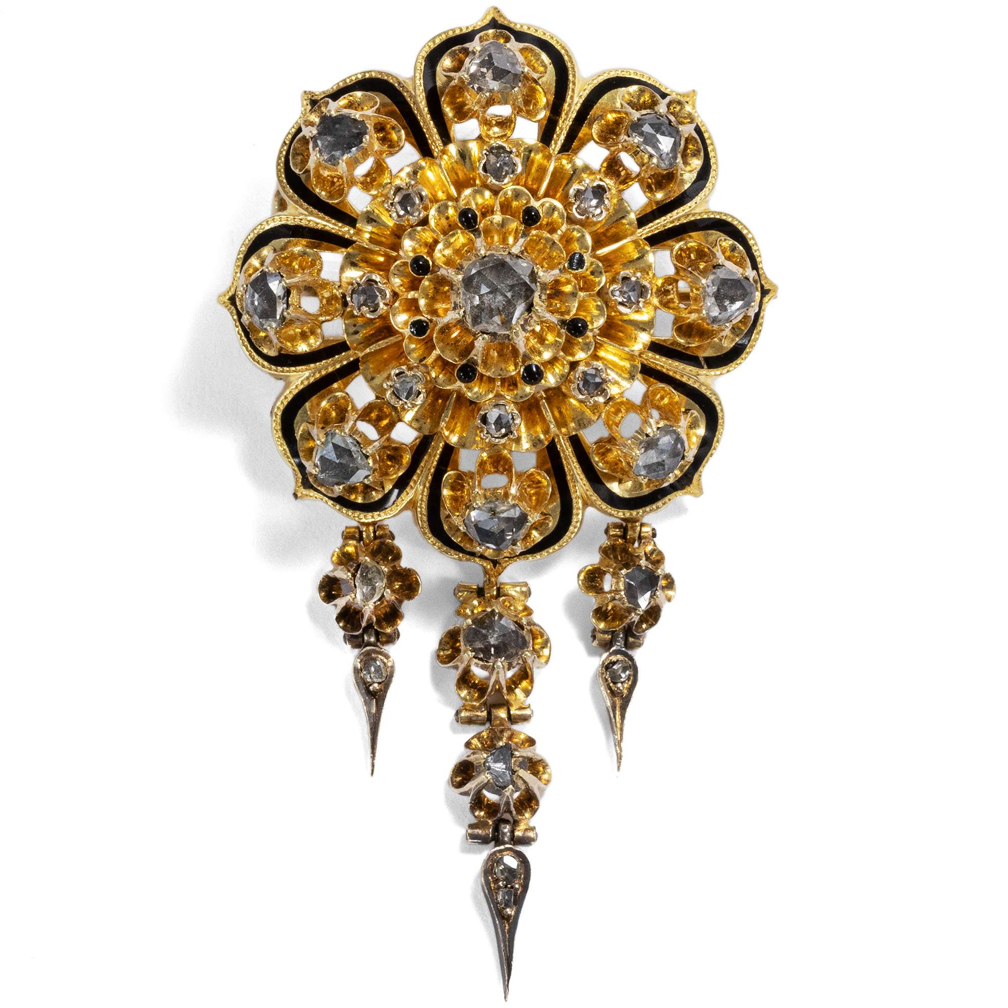 | Material: | 43 Diamanten im Rosenschliff, zus. etwa 3,00 ct, max. 4,3 mm Durchmesser, mittlere bis untere Farbe und Reinheit Gold 750/000, entspricht 18 Karat Schwarzes Email |