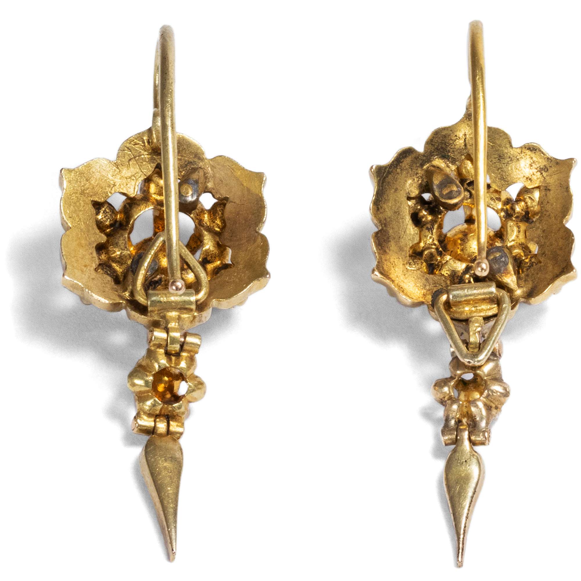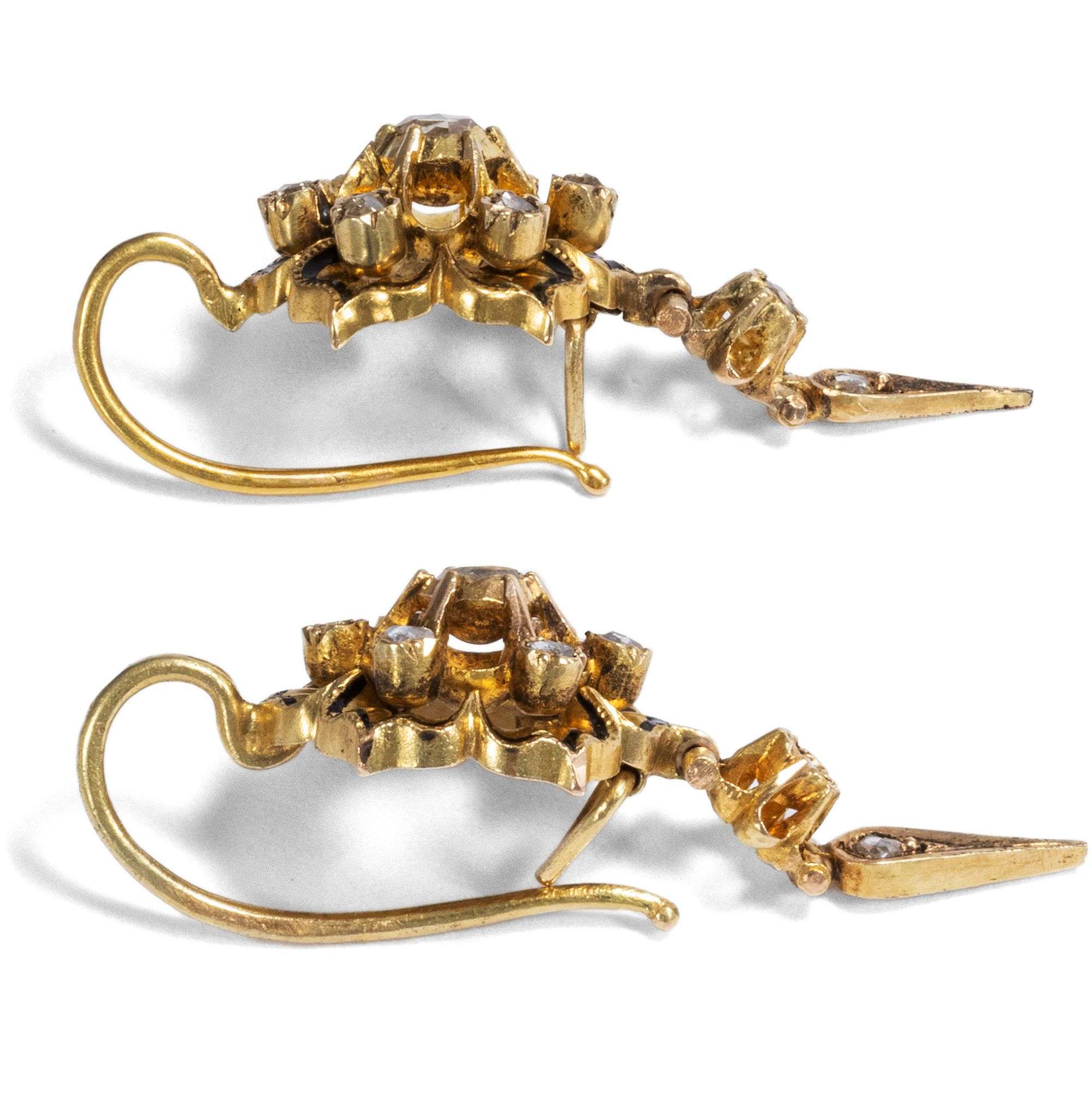 Das vorliegende Set entspricht mit seinen abgehängten Fransen und den schwarzen Emailakzenten auf Gold geradezu perfekt der Mode der Jahre um 1870. Auch die Stempel bestätigen diese Datierung: Das antike Set trägt Goldpunzen, die zwischen 1867 und 1872 in Österreich-Ungarn verwendet wurden.