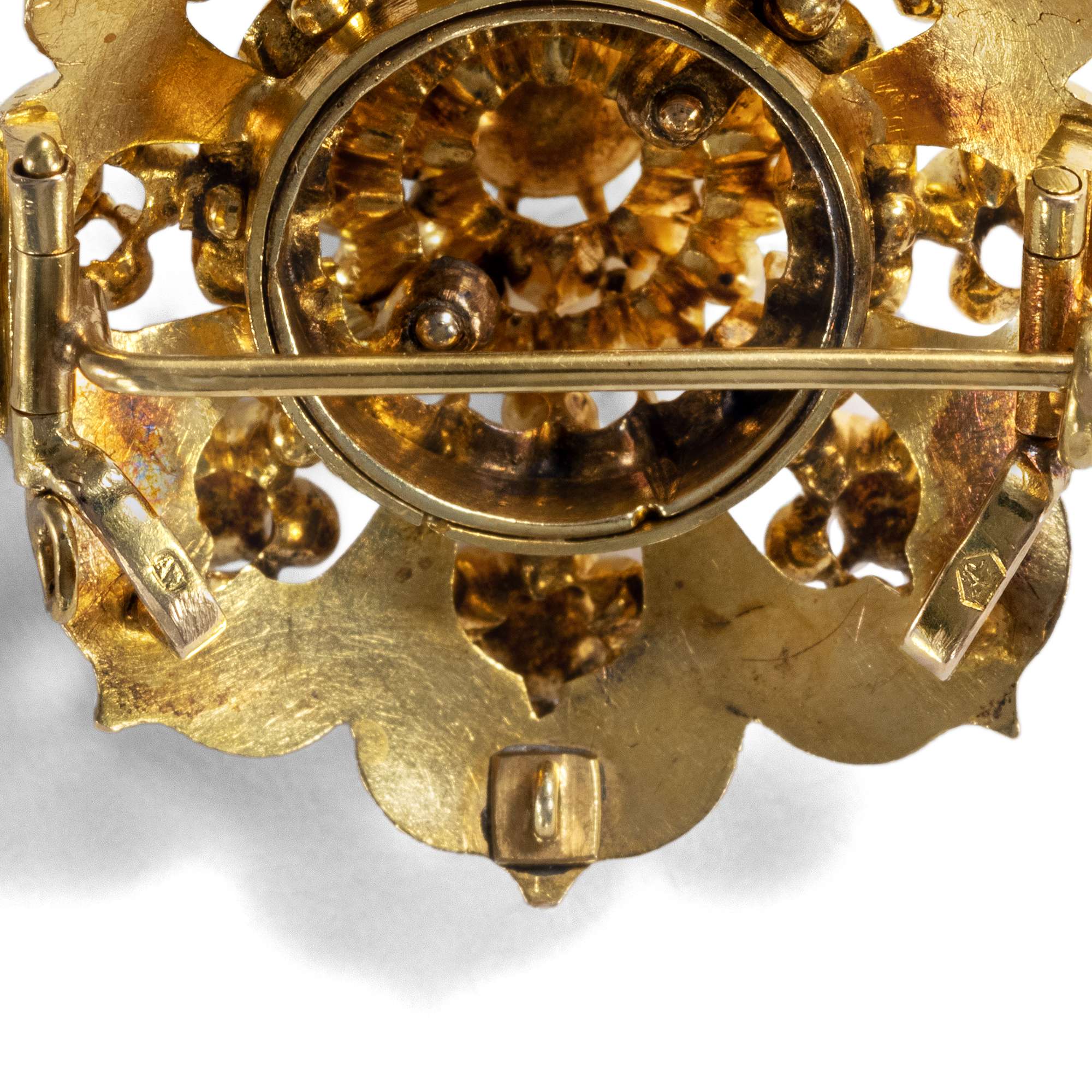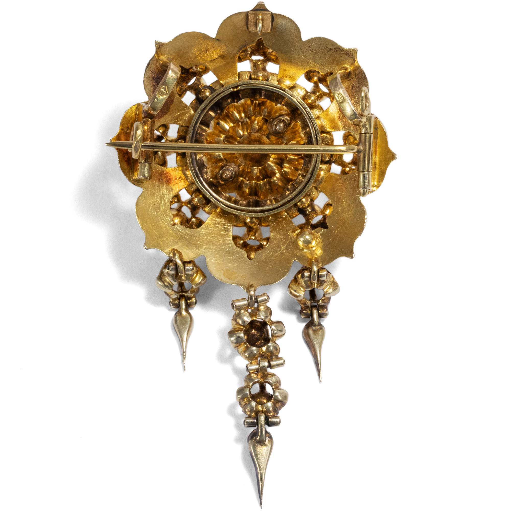 | Stempelungen: | Auf der Rückseite der Anhänger-Brosche mit österreichisch-ungarischer Feingehaltsmarke Widderkopf „4“ (in Gebrauch 1867–1872) sowie Meistermarke „AW“ im Oval |
