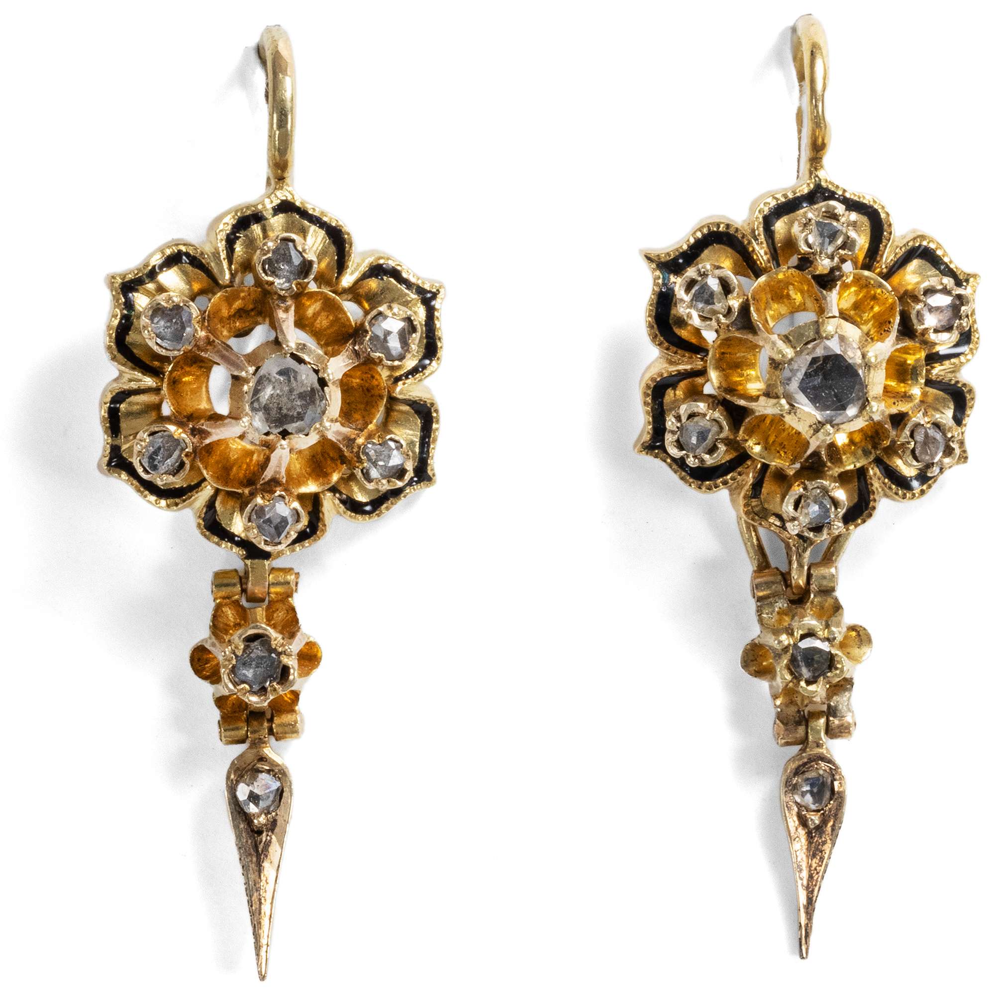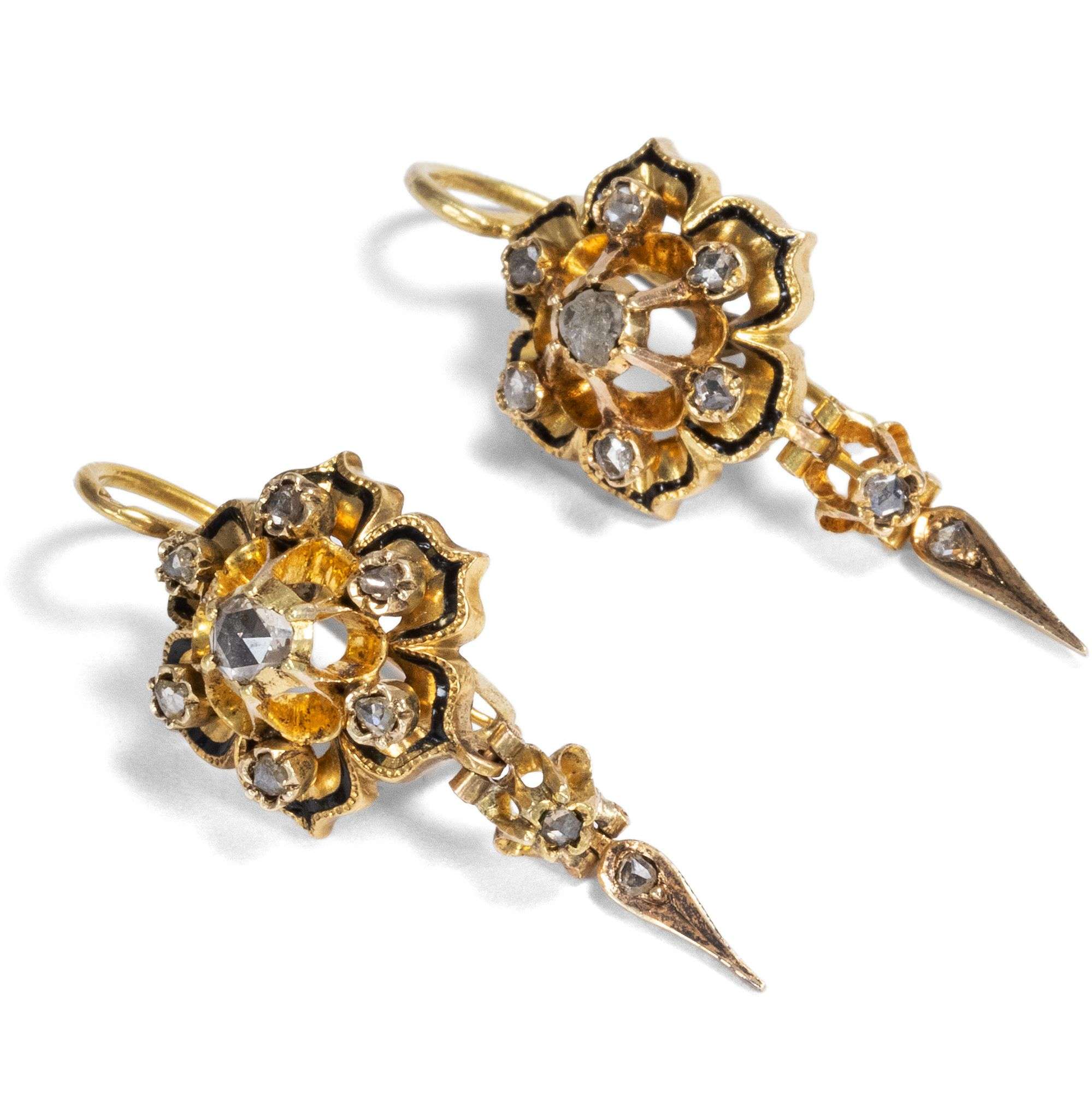 Die Ohrringe sind als kleinere reduzierte Version desselben Motivs gestaltet. Auch sie bestehen aus Gold, schwarzem Email und Diamanten. Ein bewegliches Pendel schließt auch hier das Blütenmotiv nach unten ab.