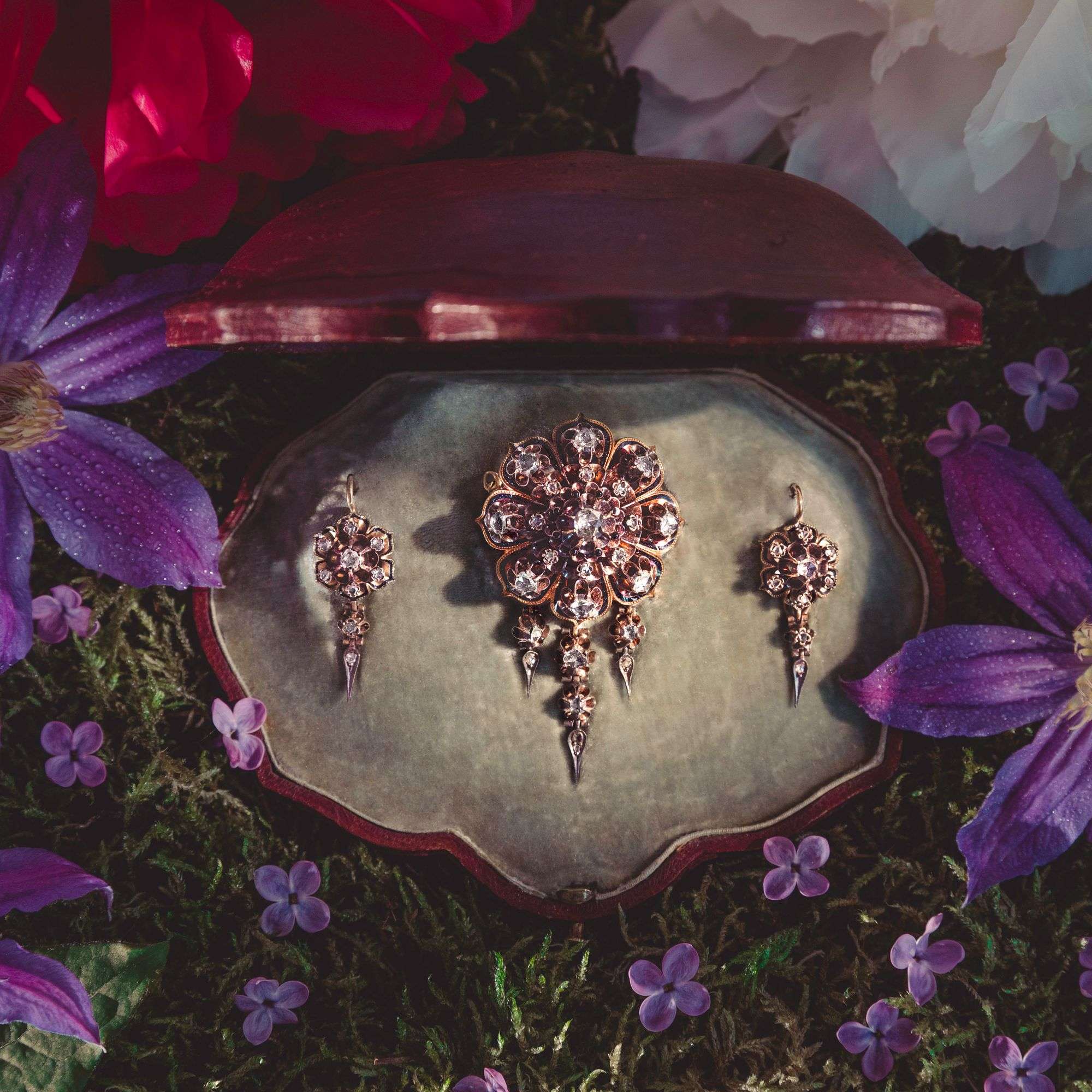 Antike Demi-Parure mit Diamantrosen in emailliertem Gold, Österreich-Ungarn um 1870