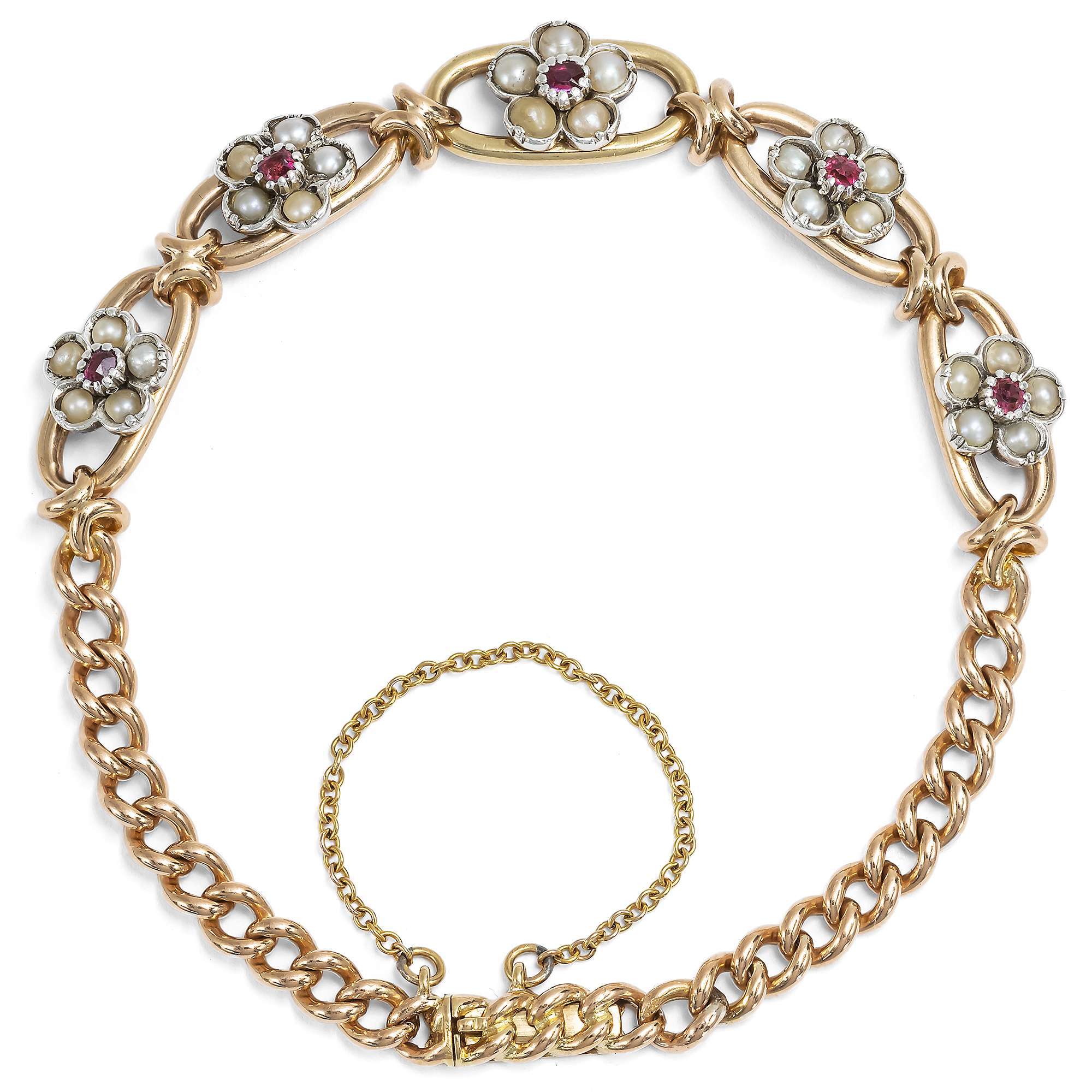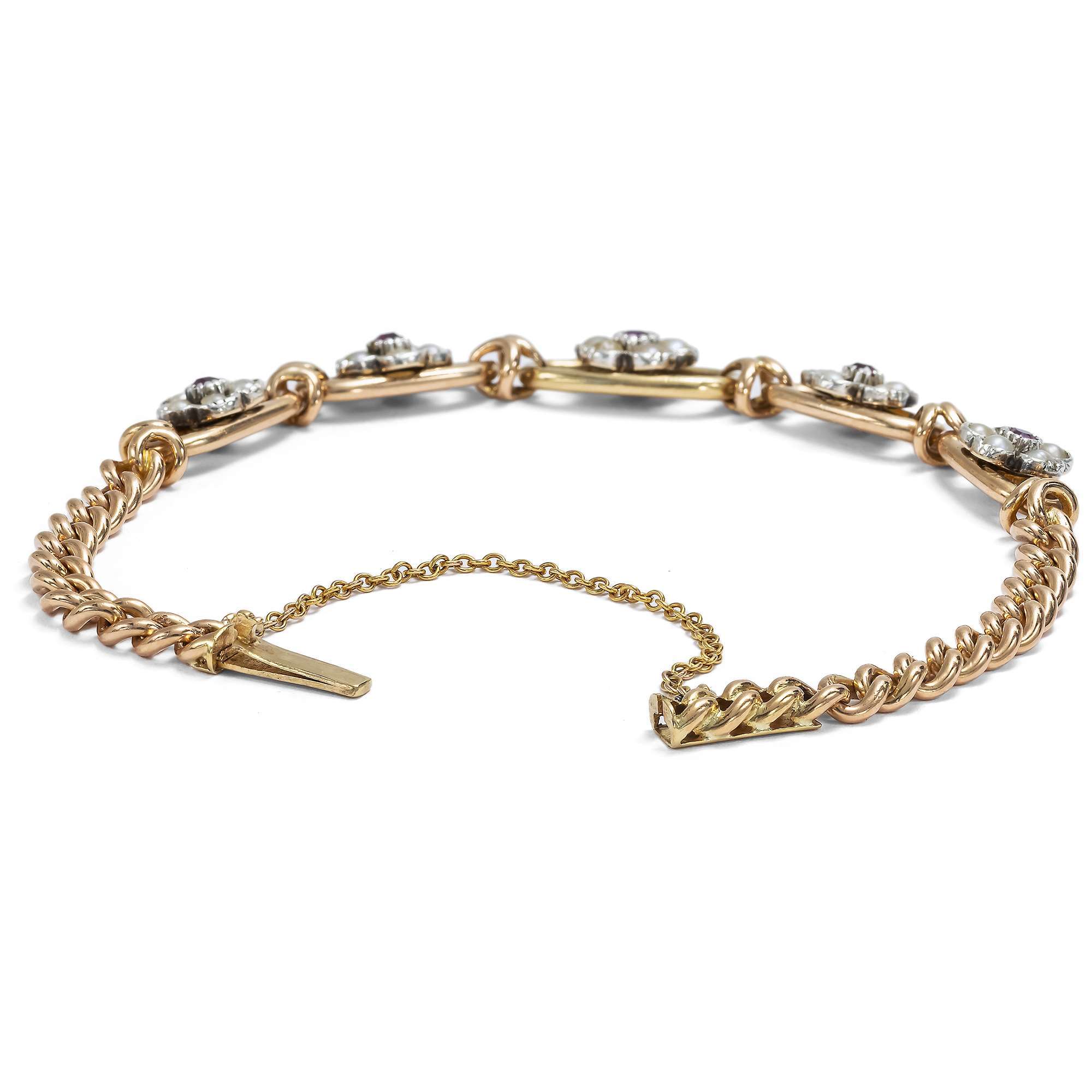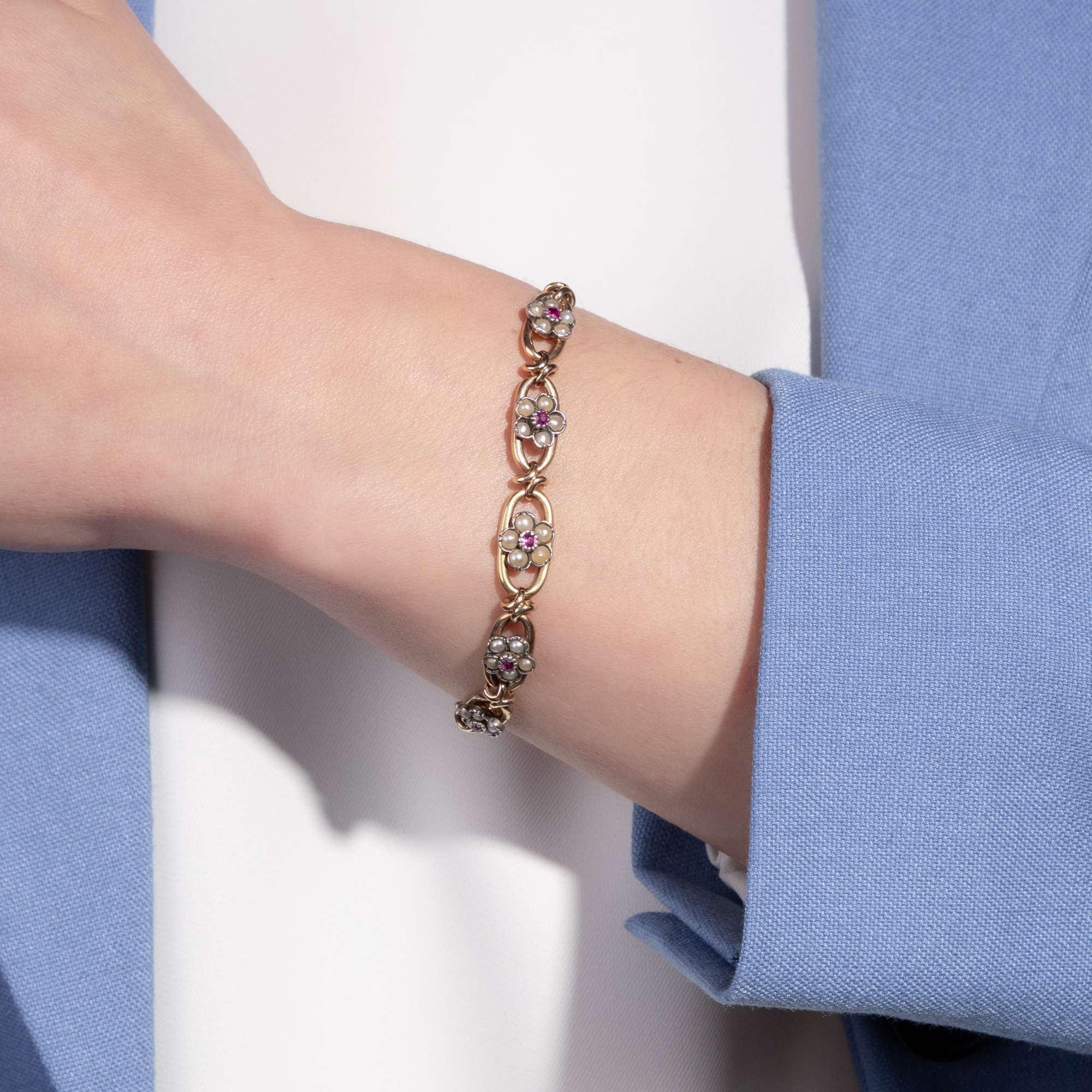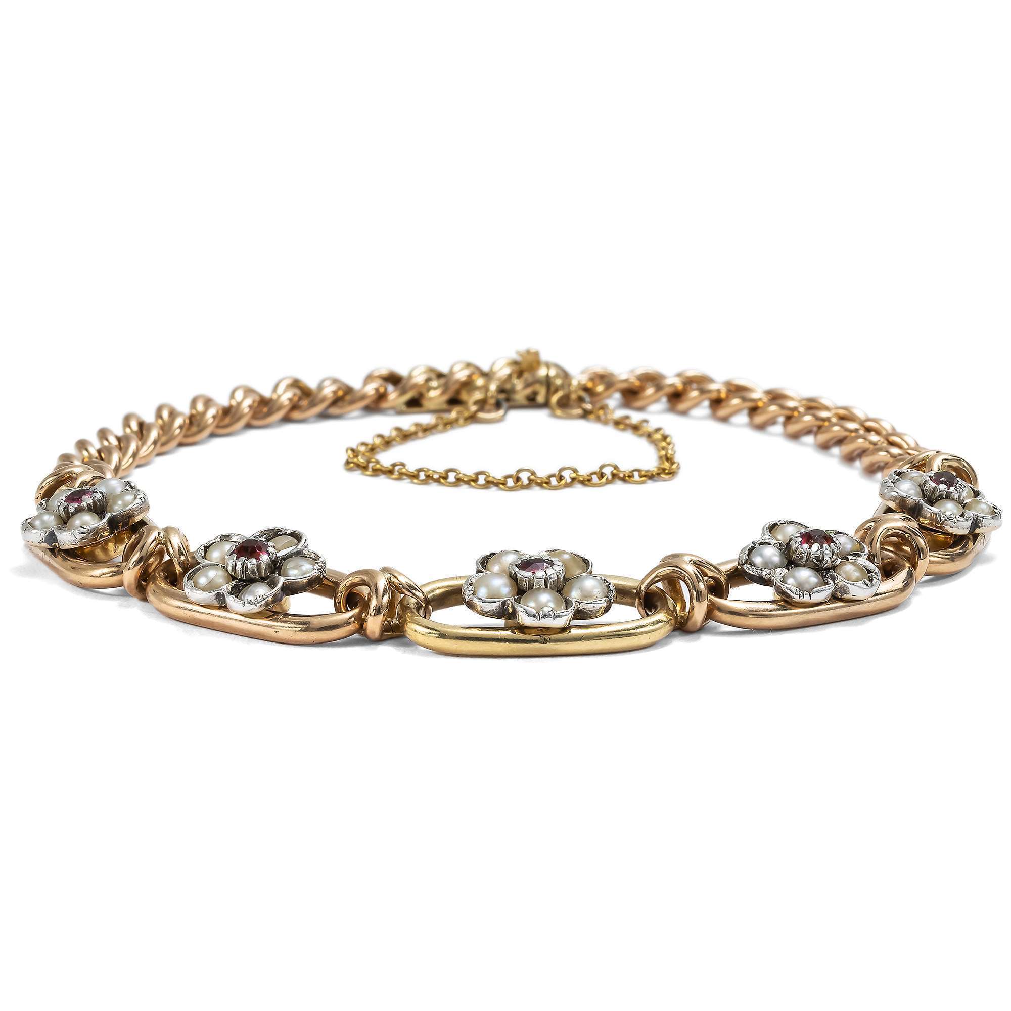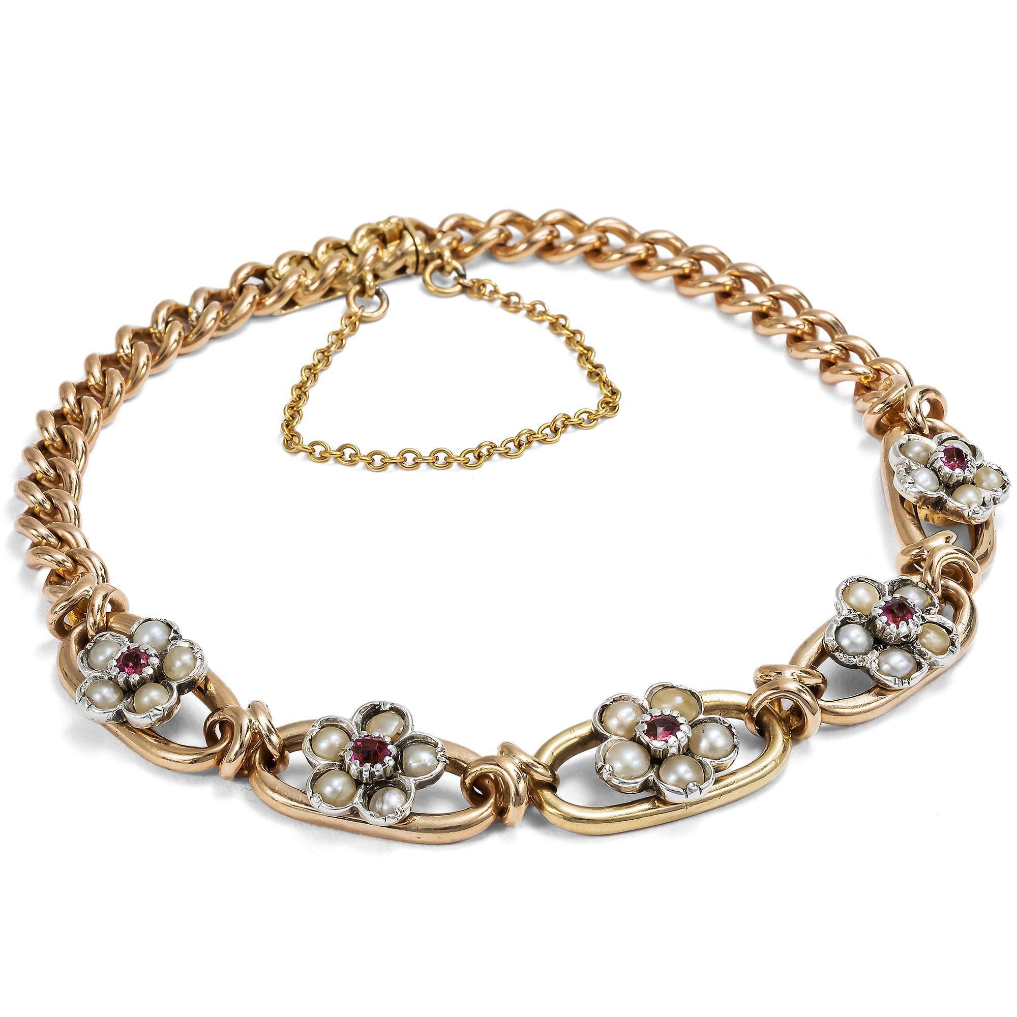 Das Armband aus Gold hat einen Feingehalt von 18 Karat und zeigt sich in Form des klassischen Rundpanzermusters, einem Schmuckentwurf, der seither nie aus der Mode gekommen ist. In der Mitte des Armbandes befinden sich fünf größere Kettenglieder, in deren Mitte Blüten aus natürlichen Perlen und Rubinen eingesetzt sind. Bei den Rubinen handelt es sich um natürliche Rubine aus Burma, dem klassischen Fundort für diese roten Edelsteine.