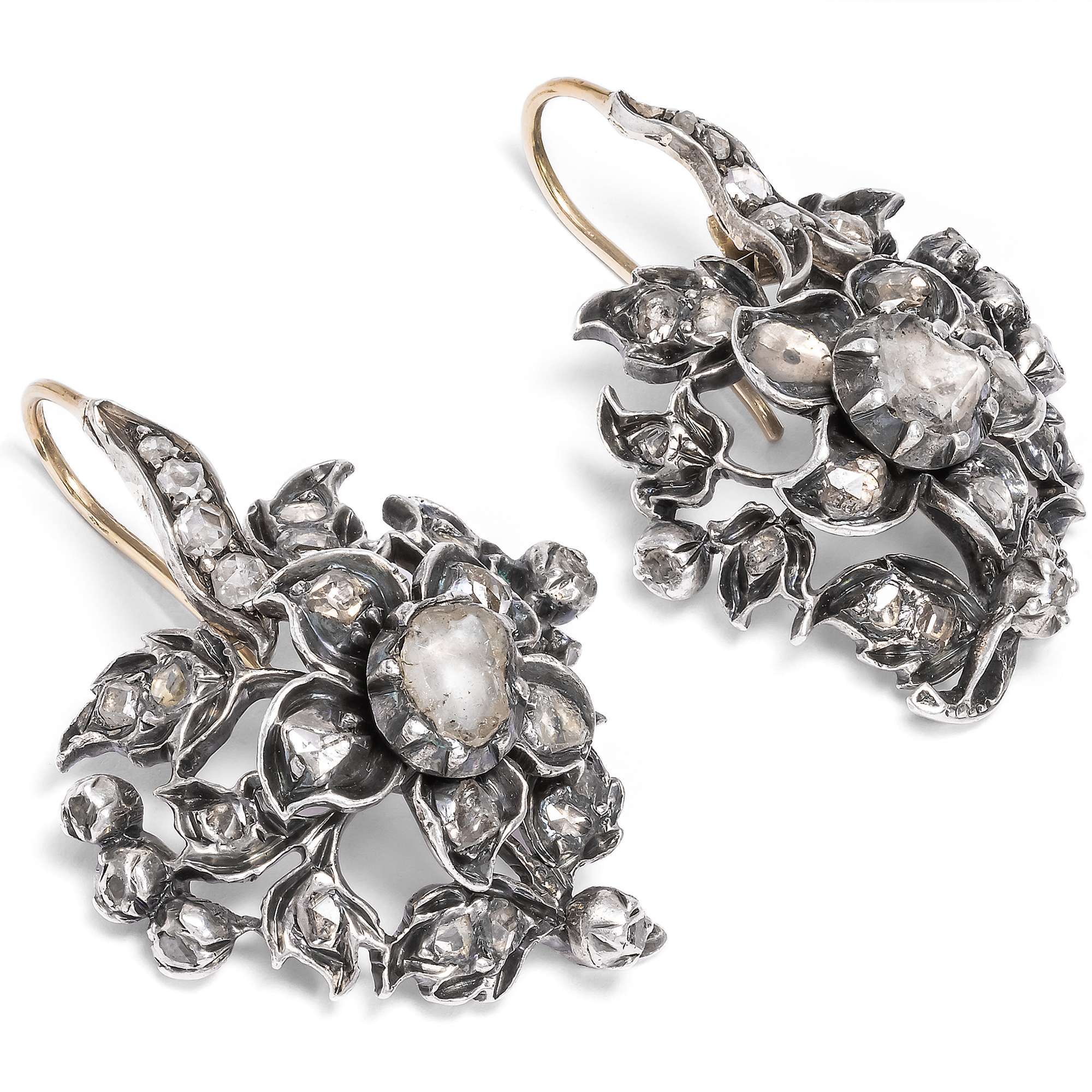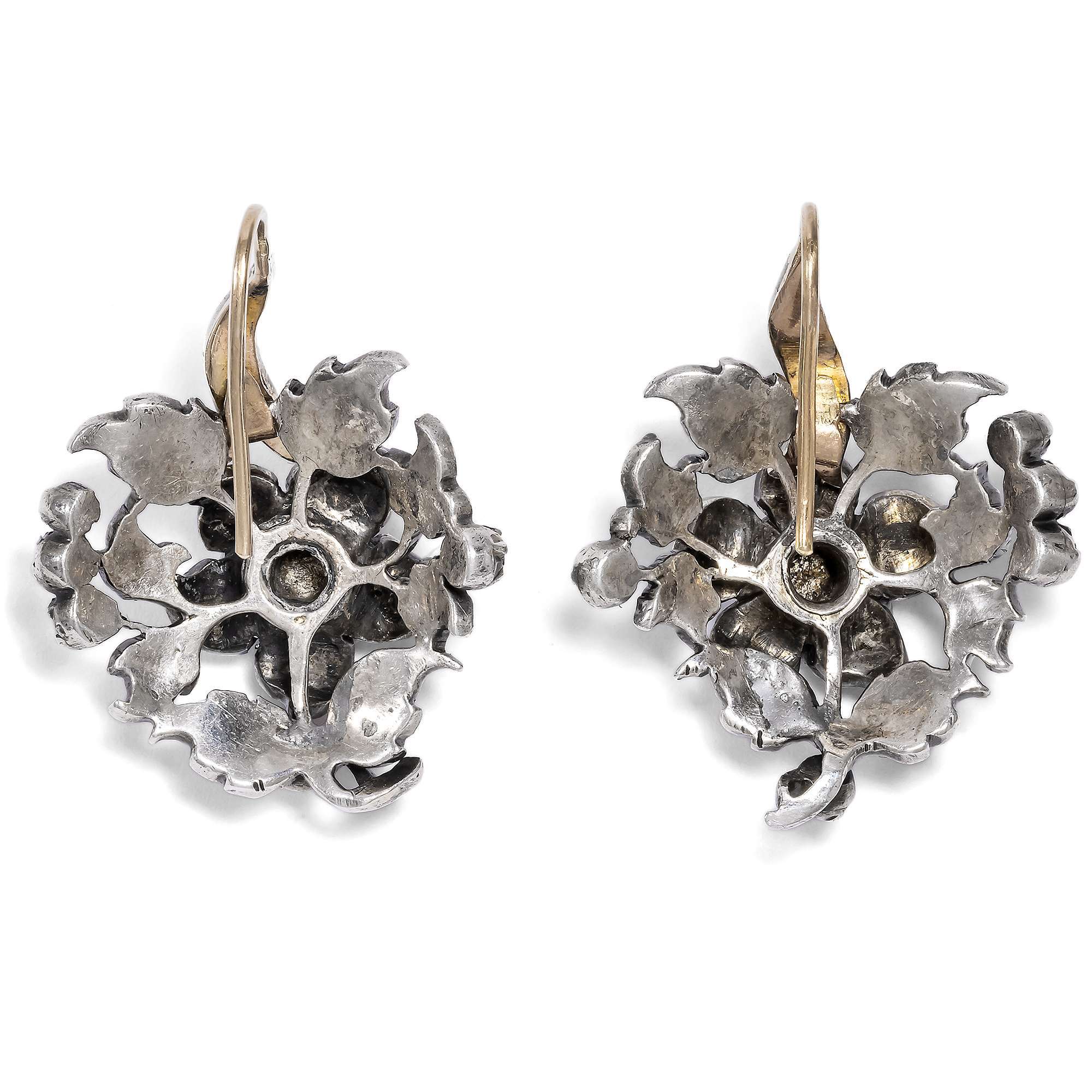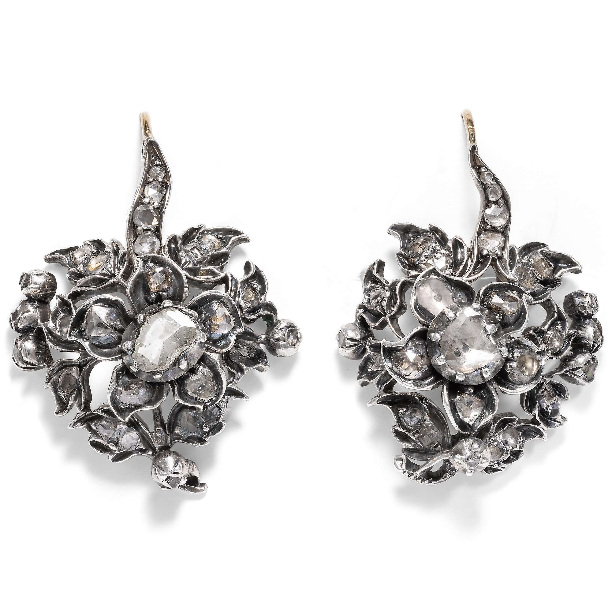 Seltene florale Ohrringe mit Diamanten in Silber, um 1850