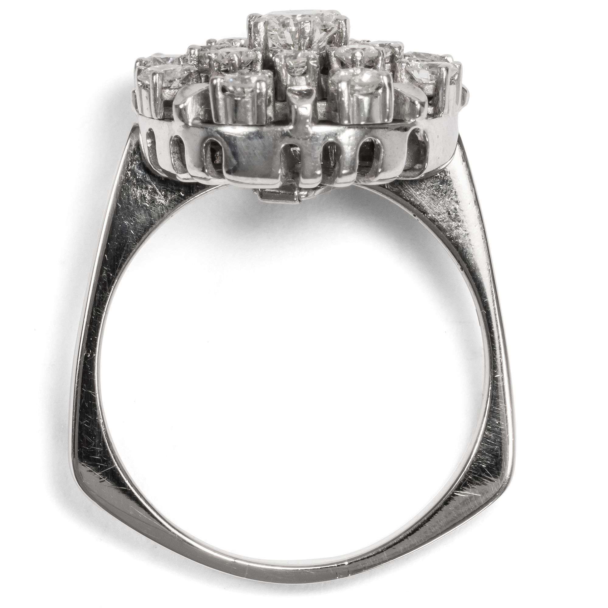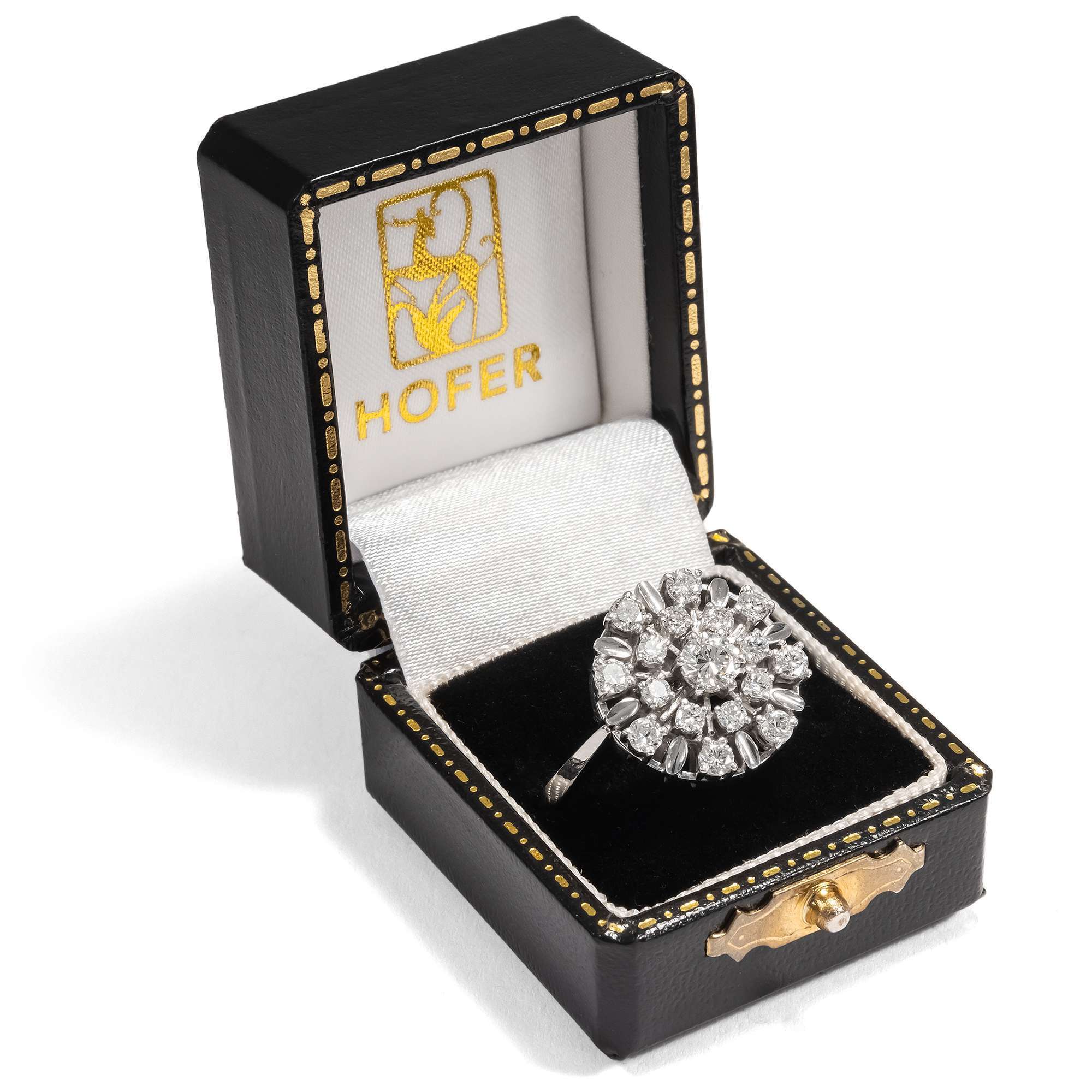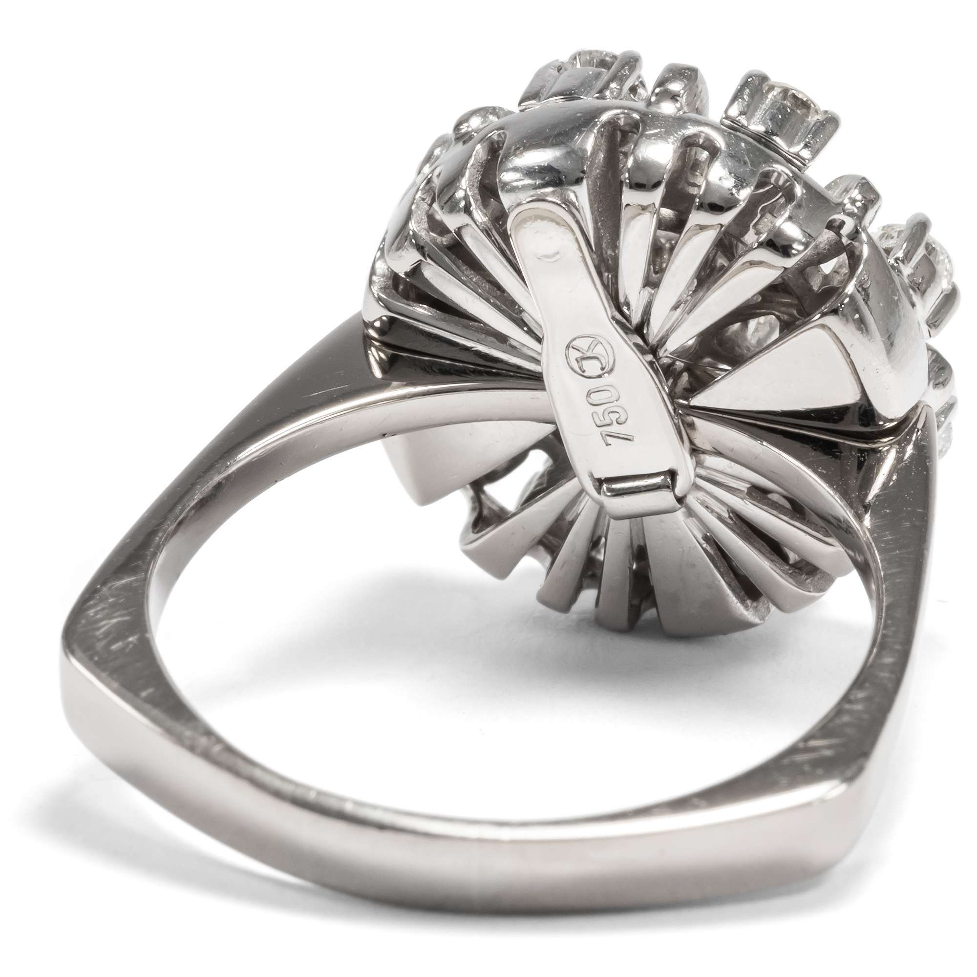 Das wandelbare Schaustück besteht aus funkelnden Brillanten, die in eine modernistische Fassung aus hochkarätigem Weißgold eingelassen sind. Insgesamt sind etwa 1,13 ct Diamanten gefasst, der mittlere Stein wiegt allein etwa 0,33 ct. Der leichte, luftige Entwurf des Ringkopfes verwandelt ihn in ein Fest der Lichtreflexe. Ein weiterer Clou ist die Ringschiene, deren zeittypische Form nicht nur modernistisch anmutet, sondern zugleich das Kippen am Finger verhindert.