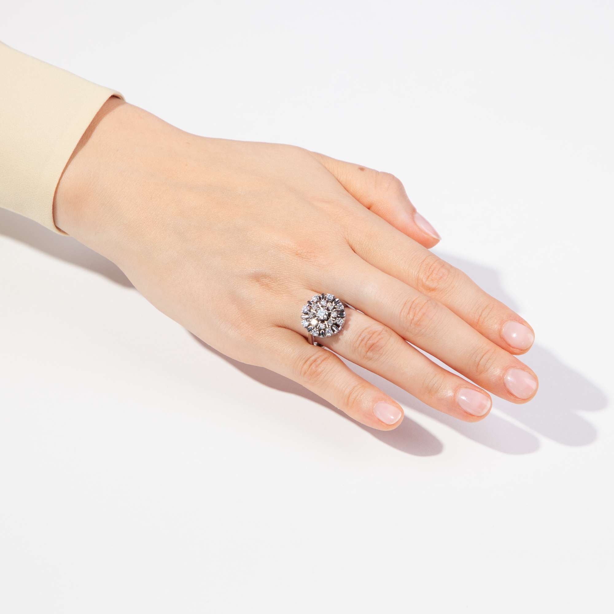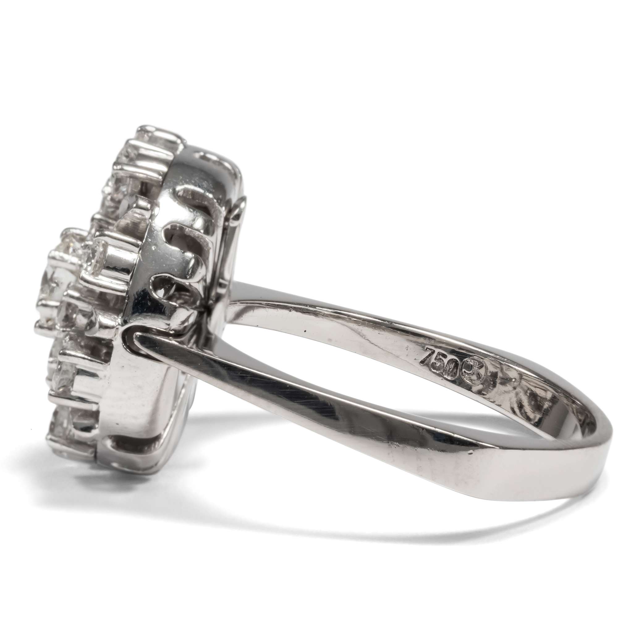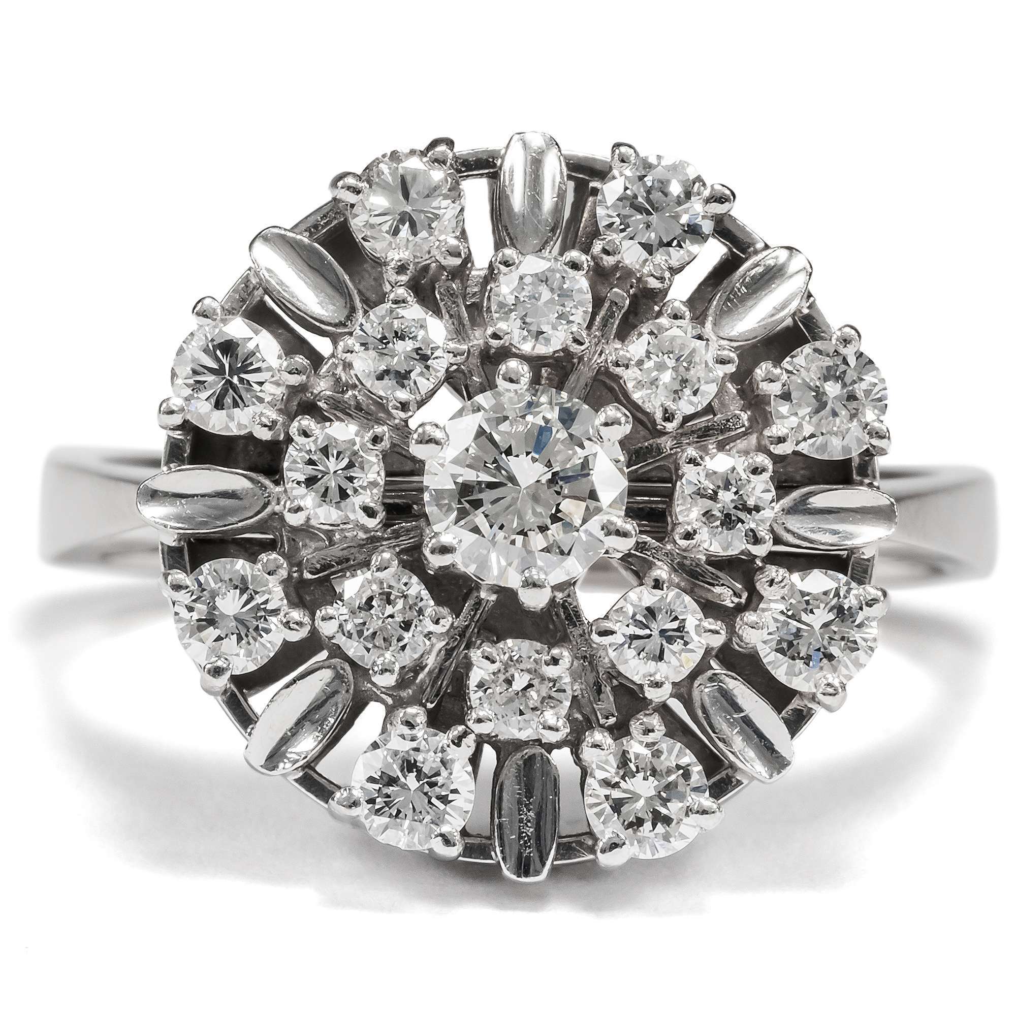 Das wandelbare Schaustück besteht aus funkelnden Brillanten, die in eine modernistische Fassung aus hochkarätigem Weißgold eingelassen sind. Insgesamt sind etwa 1,13 ct Diamanten gefasst, der mittlere Stein wiegt allein etwa 0,33 ct. Der leichte, luftige Entwurf des Ringkopfes verwandelt ihn in ein Fest der Lichtreflexe. Ein weiterer Clou ist die Ringschiene, deren zeittypische Form nicht nur modernistisch anmutet, sondern zugleich das Kippen am Finger verhindert.