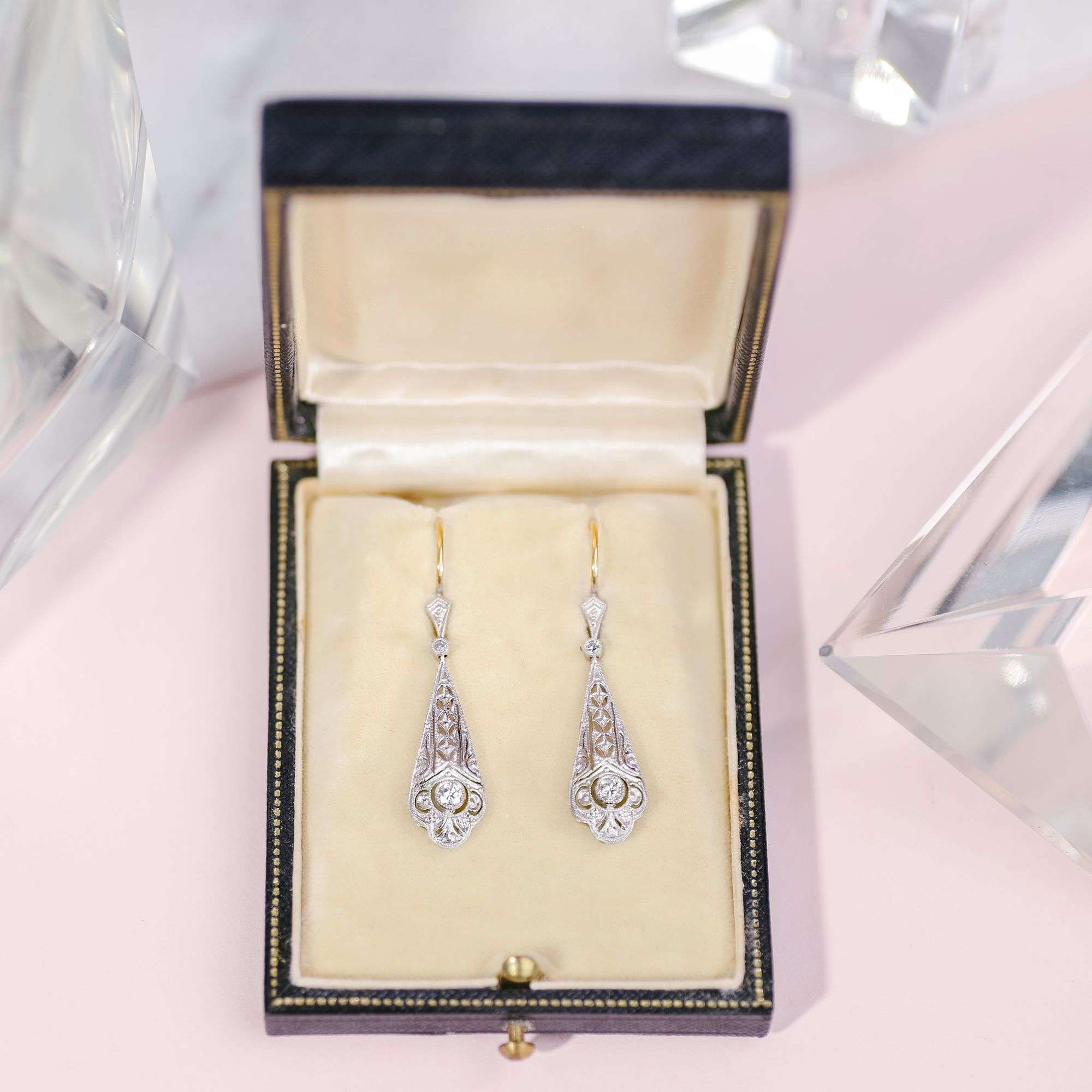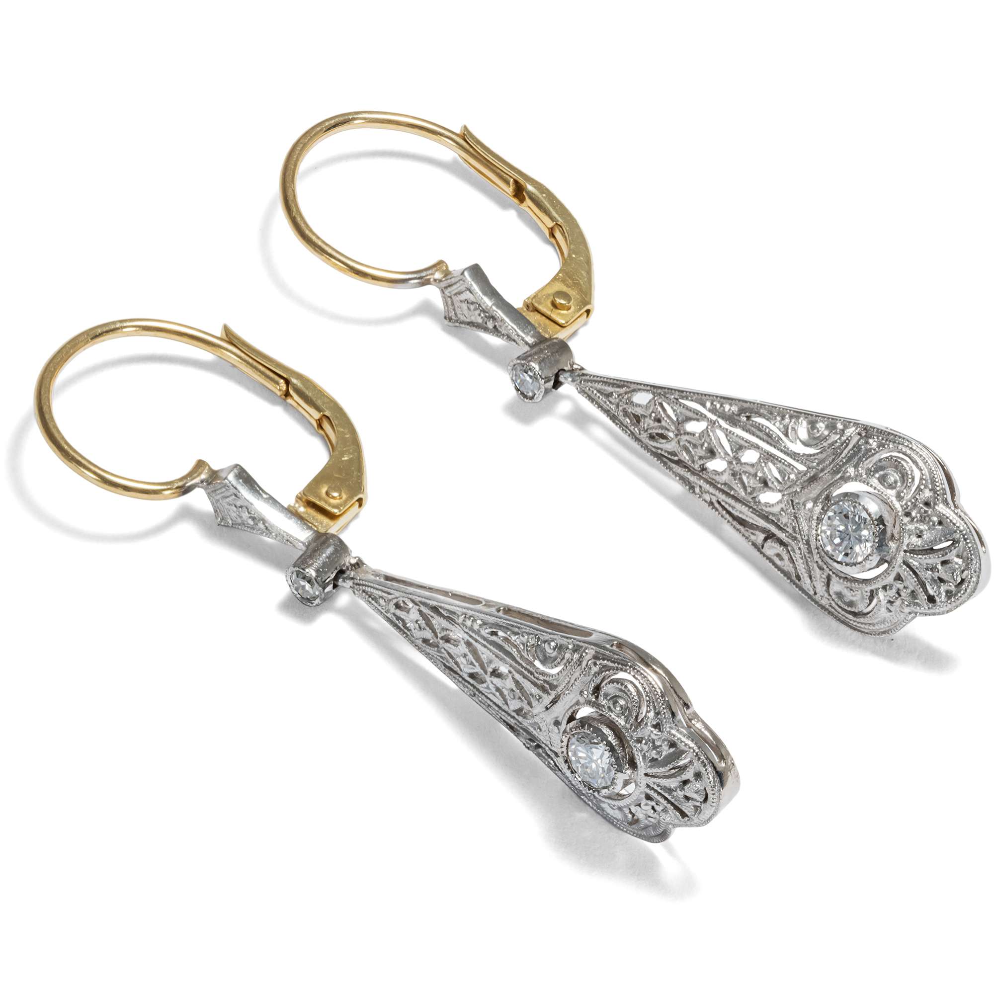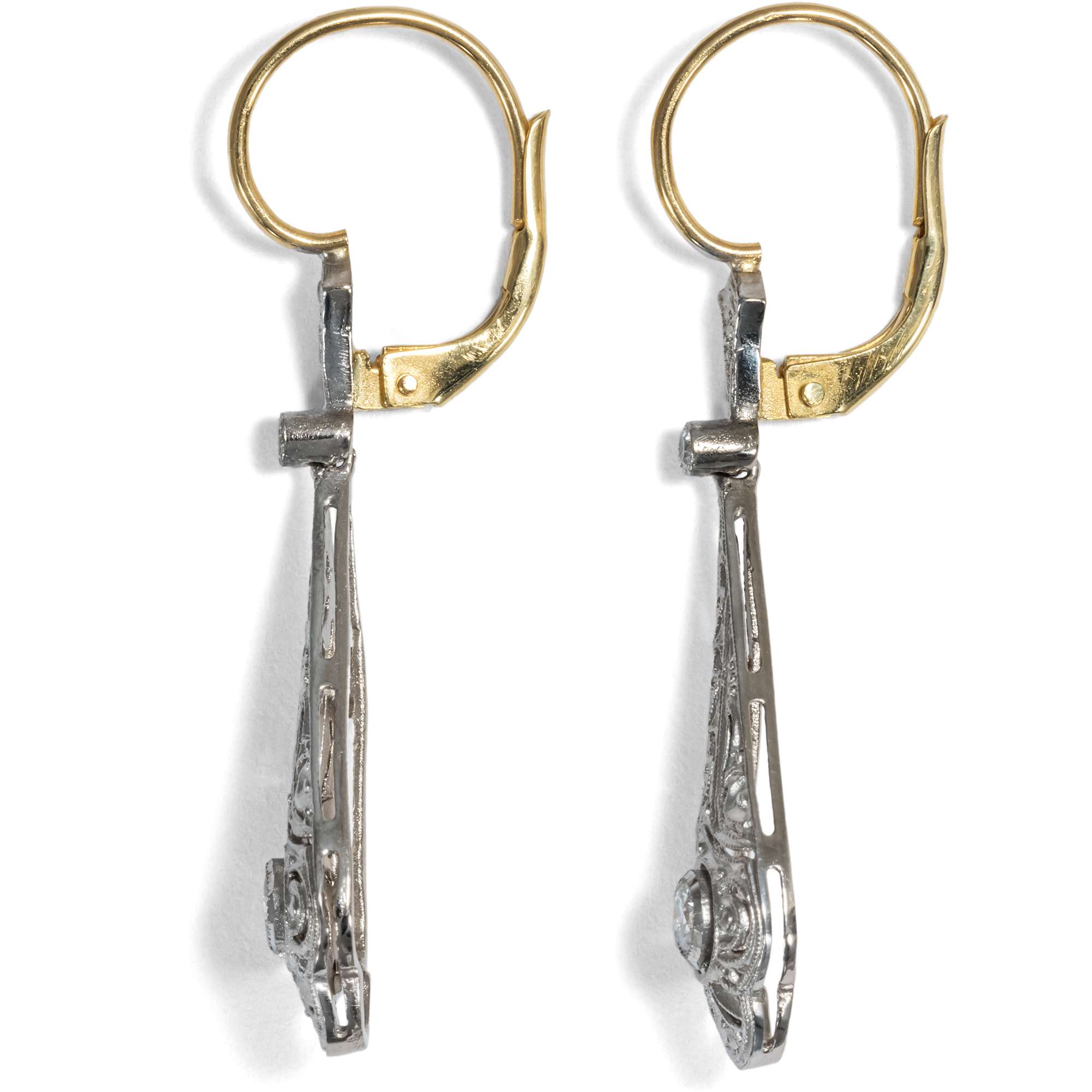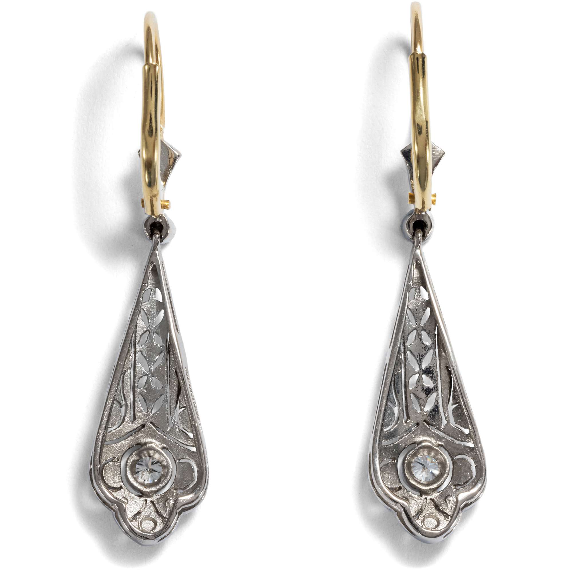 Aus dieser Idee heraus, dieser Knappheit Abhilfe zu schaffen, haben wir das vorliegende Paar Ohrringe in unserer Werkstatt fertigen lassen. Wir haben uns beim Entwurf bis in die Details eng an Originale der Zeit gehalten. Ein tropfenförmiges, spitzenartig durchbrochenes Element aus Weißgold ist pendelnd unter einem Bügel aus Gelbgold angebracht. Zentral leuchtet ein Brillant, umgeben von minutiösen geometrischen Details. Ein weiterer, kleinerer Diamant in Millegriffes-Fassung bildet den Übergang zwischen Pendel und praktischer Klappbrisur.