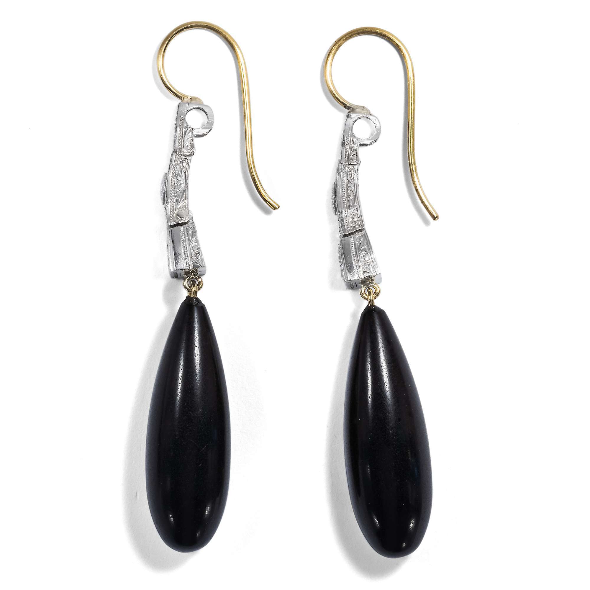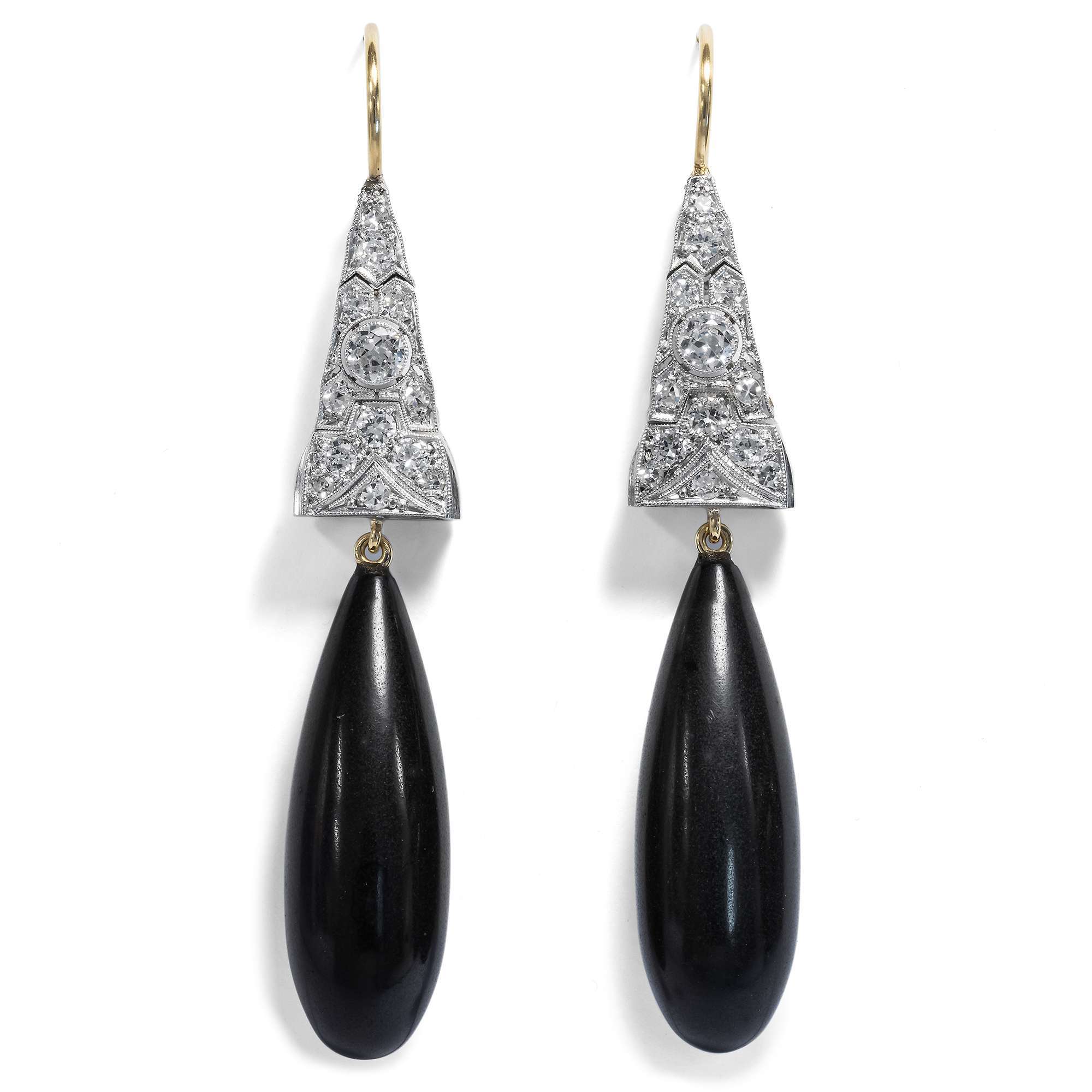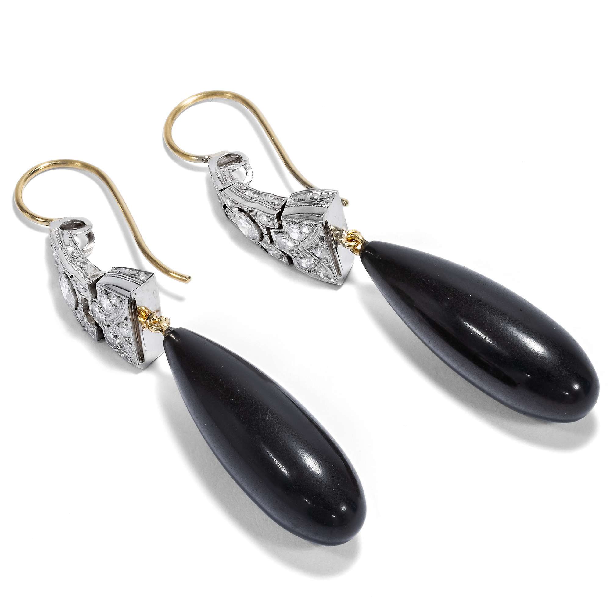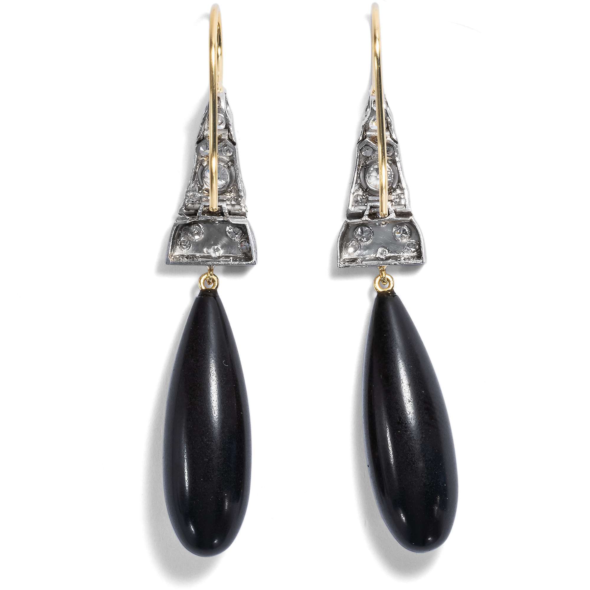 Die diamantbesetzten Elemente entstammen einem Uhrenarmband des Art Déco – dem Band einer jener Uhren mit winzigem Zifferblatt, die heute kaum noch getragen werden. Unser Goldschmied hat die Gagat-Pampeln und die goldenen Ohrbügel zu den Platin-Elementen der Jahre um 1930 ergänzt und so, ganz im Geiste des Art Déco, diese Ohrringe geschaffen. Durch die Bewegungen der tiefschwarzen Gagate entsteht bei jeder Bewegung ein wundervolles Spiel.Jett, auch „Gagat“ oder „Schwarzer Bernstein“ ist eine besondere Form versteinerter Kohle, die wegen ihres einzigartigen Glanzes und der leichten Schnitzbarkeit schon in vorgeschichtlicher Zeit als Schmuck benutzt wurde. Bereits die Römer stellten Schmuck und Amulette aus Gagat her; ab dem Mittelalter fertigte man in Europa daraus Trauerschmuck und Rosenkränze.