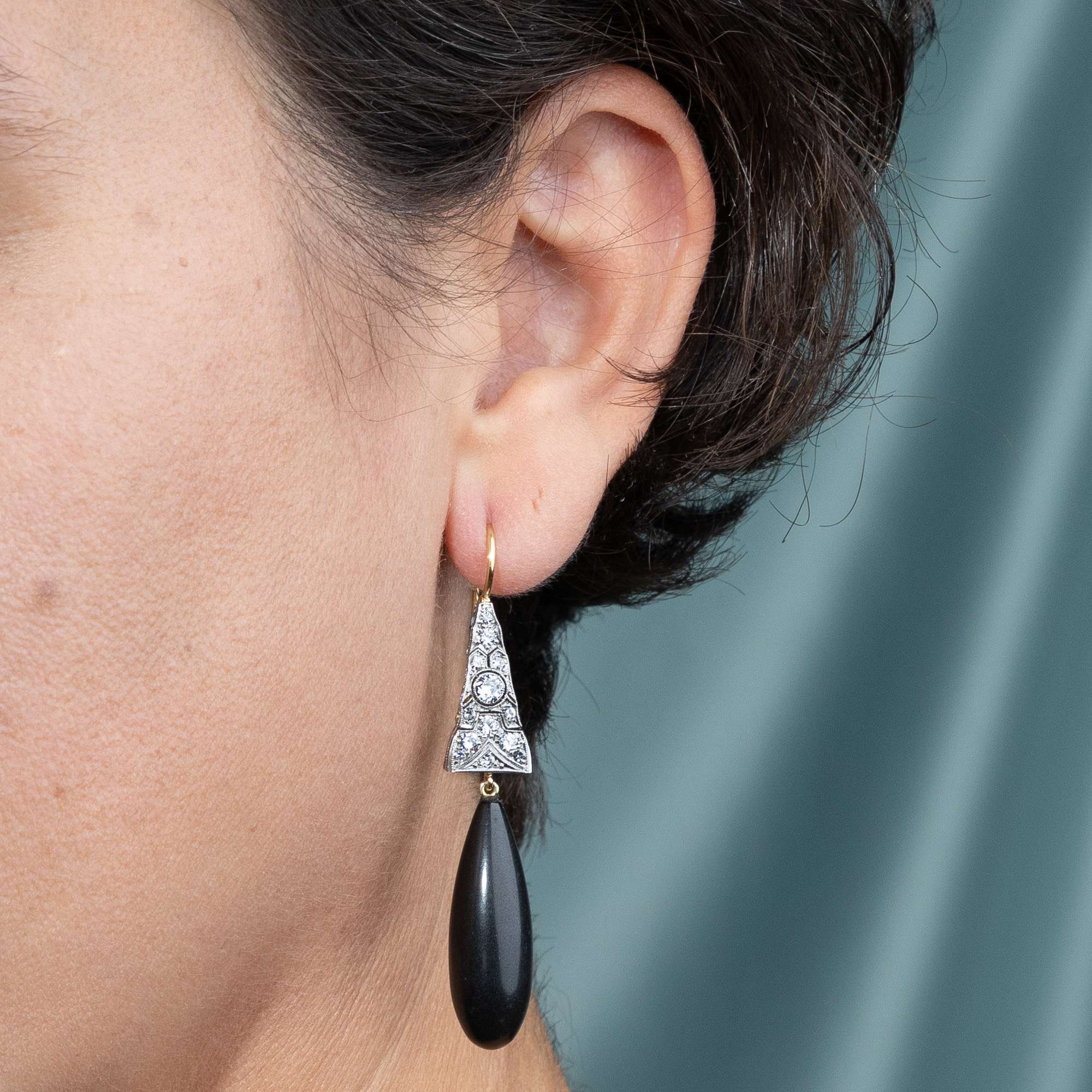 Die hier vorliegenden Ohrringe zeigen diesen Geschmack der späten 1920er-Jahre. An einem zarten Ohrbügel sind breite, glänzende Oberteile aus Platin angebracht. Diamanten besetzen jeden Fleck der aus geometrischen Grundformen gebildeten Oberflächen. Die Oberteile sind dabei aus mehreren Gliedern zusammengesetzt, sodass die Ohrringe weich und schön am Ohr pendeln können. Am unteren Ende schließlich ist eine große Pampel aus Gagat (vgl. „Erfahren Sie mehr“) angebracht. Sie ergänzt die helle Farbe von Platin und Diamanten als Kontrapunkt und fügt dem flächigen Entwurf der Oberteile ein schönes Volumen hinzu. Zugleich macht ihr geringes spezifisches Gewicht die Ohrringe trotz ihrer beeindruckenden Größe angenehm zu tragen.