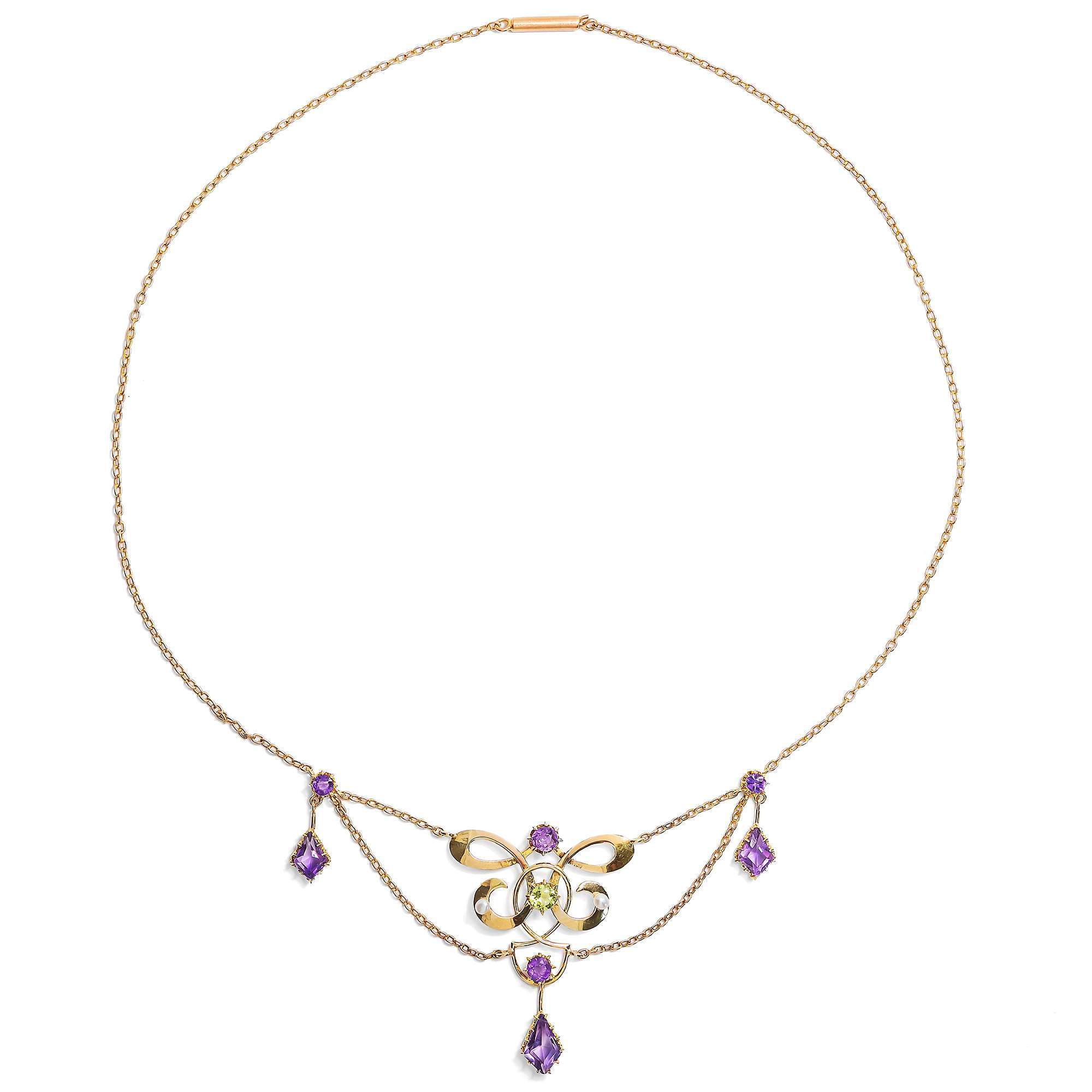 Das vorliegende Collier ist ein besonders prachtvolles Zeugnis dieser Zeit. Gefasst in leicht rötliches Gold sehen wir zentral einen grünen Peridot, weiße Perlchen und violette Amethyste zu einem farbenfrohen Arrangement vereint. Die Farben dieses Besatzes sind die Farben, welche auch die Frauen der Suffragettenbewegung zu ihren Symbolfarben wählten. Nicht zufällig lassen sich die Anfangsbuchstaben der Farben als Akronym lesen: Aus Grün (green), Weiß (white) und Violett (violet) bildet sich ein Satz, der alles bündelt, wofür die Suffragetten kämpften: „Give Women the Vote“ – „Gebt den Frauen das Wahlrecht“.