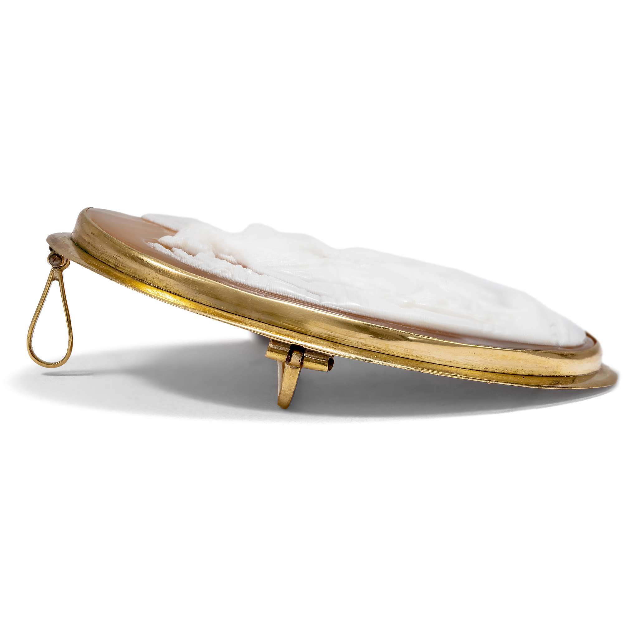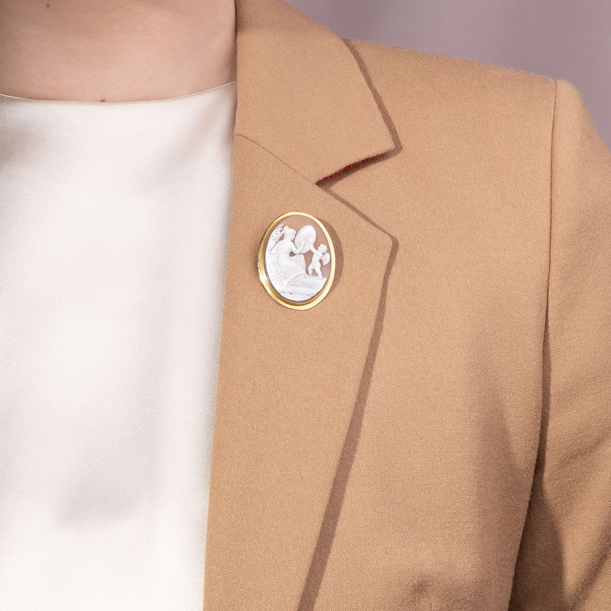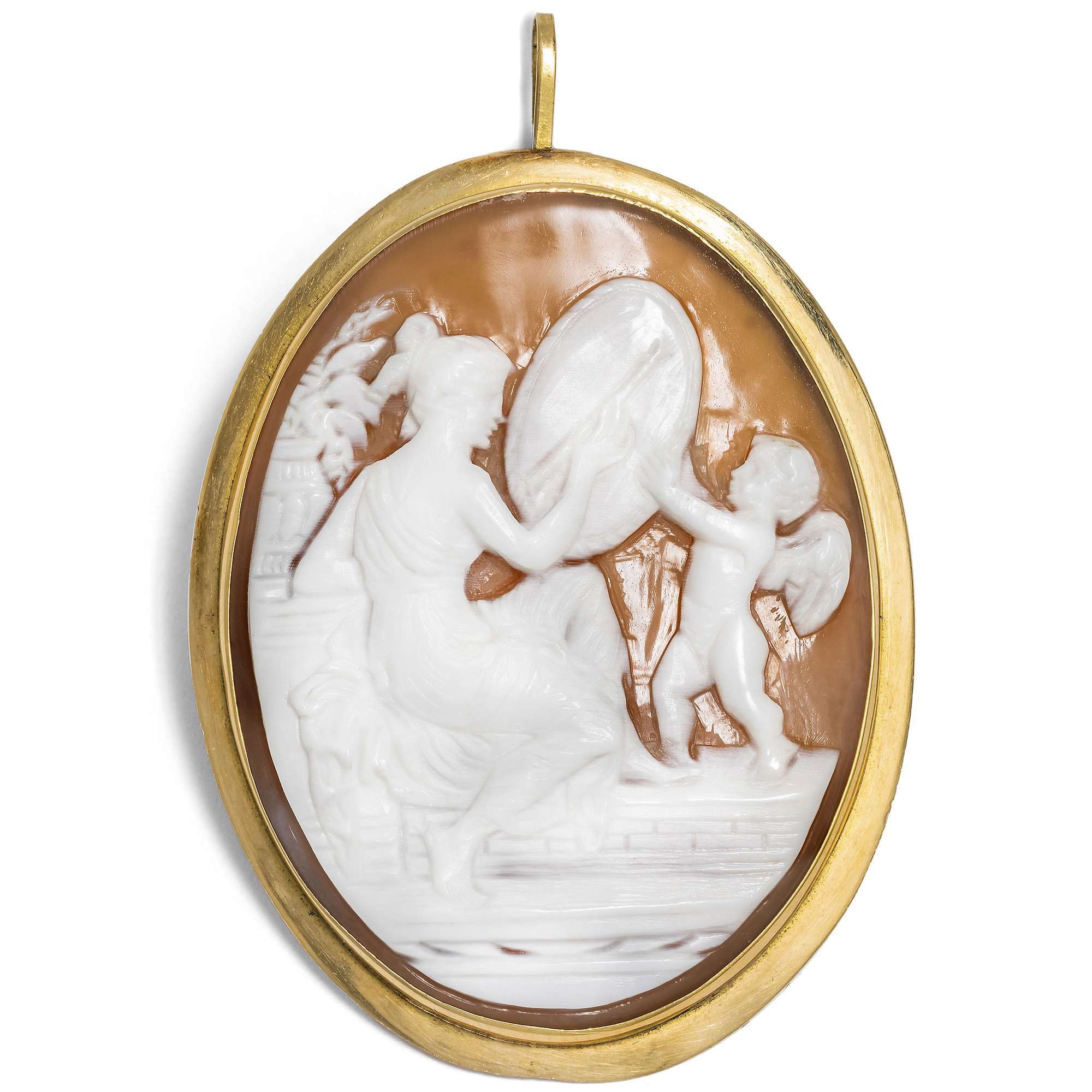 Diese ungewöhnliche Kamee zeigt ein spannendes Motiv, das seinen Ursprung in der Welt der griechischen Mythologie hat. In sehr schönem Schnitt wurde die Schale einer Meeresmuschel genutzt, um eine Episode aus dem Leben von Venus und Amor darzustellen.