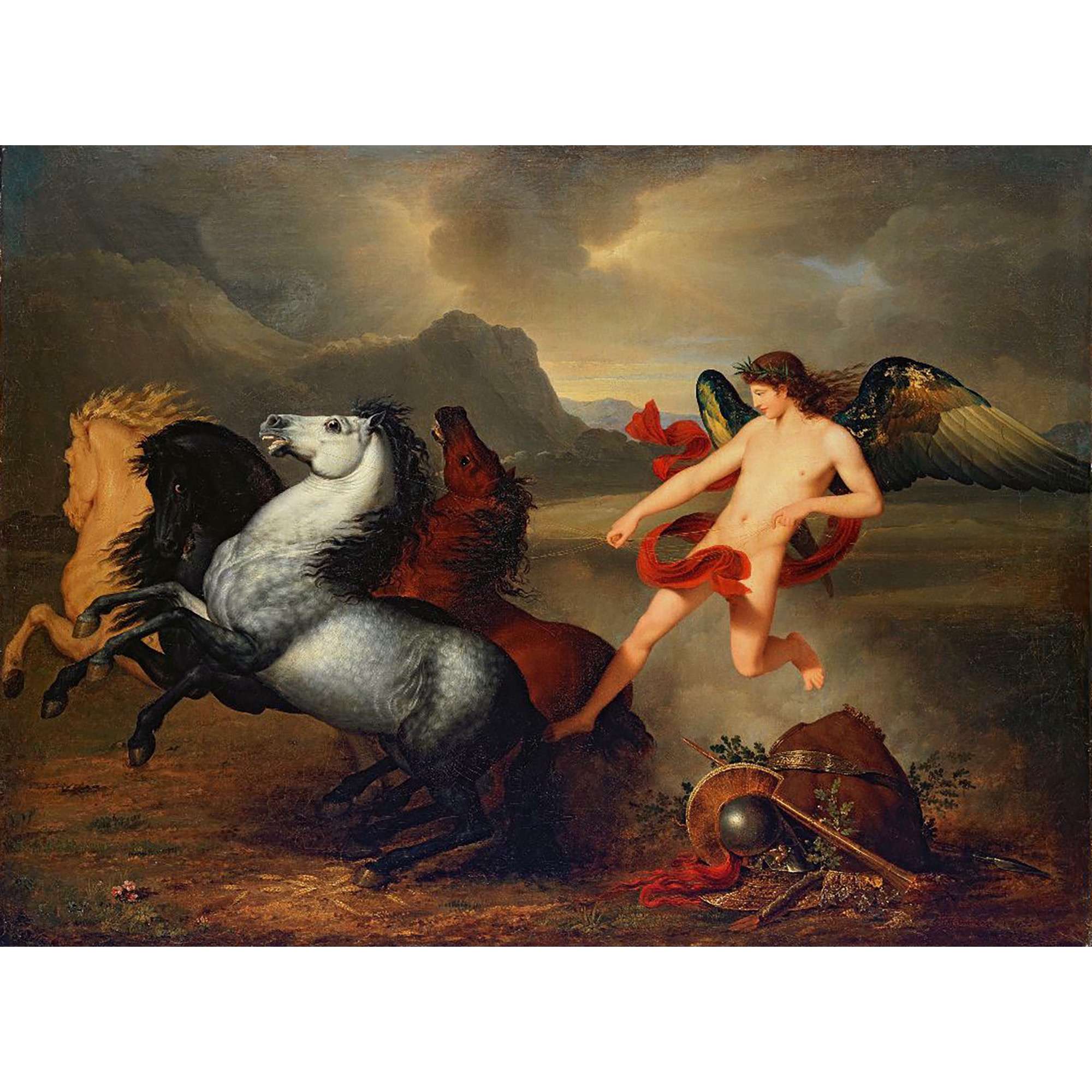 Die Kamee folgt in ihrer Darstellung einem Gemälde des französischen Malers Bénigne Gagneraux (*Dijon 1756, +Florenz 1795). Der Gewinner des Rompreises der Akademie war spezialisiert auf Historiengemälde, deren heroische Themen er in klassischer Formvollendung auf die Leinwand brachte. Sein Gemälde Der Genius des Friedens zähmt die Pferde des Mars aus dem Jahr 1793 wird heute im Museum der Stadt Genf aufbewahrt, vgl. hier.