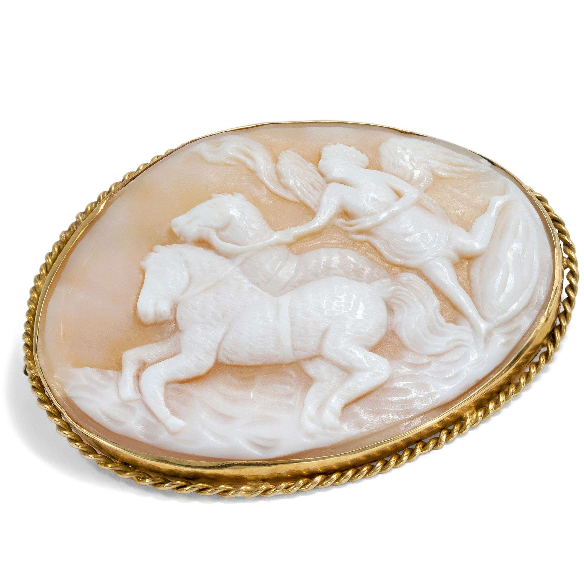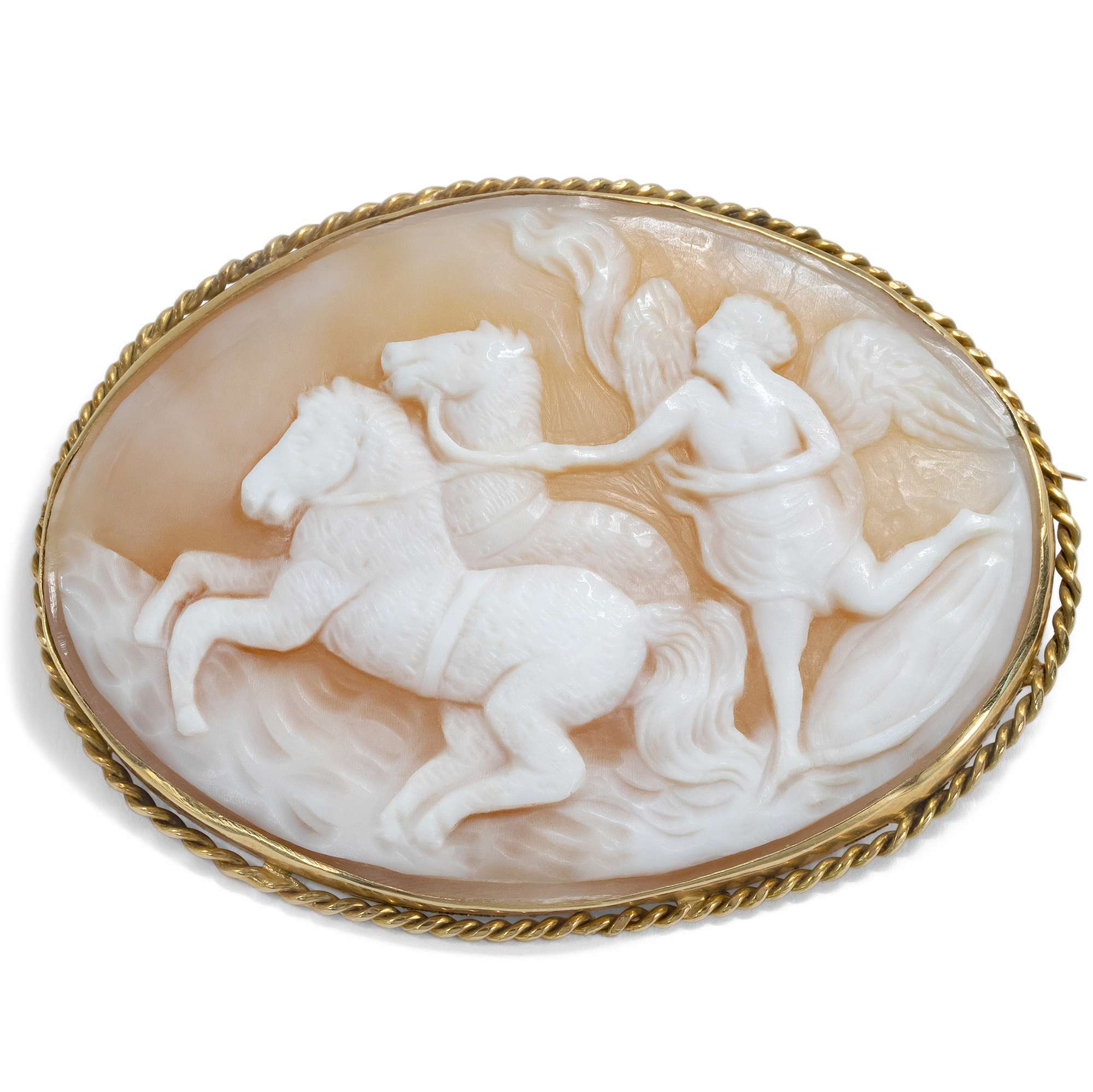 Die vorliegende vintage Muschelgemme zeigt ein Motiv der Mythologie: Der Genius des Friedens, ein Jüngling mit Flügeln und wallendem Haar, zähmt die Pferde des Mars. Er hält die Zügel der Rosse des Kriegsgottes in der Hand und ist im Begriff, sie in die Freiheit zu entlassen. Die Rüstung, der Helm, der Schild und die Fackel des Kriegsgottes liegen bereits auf der Erde zurückgelassen, und stolz und voller Zuversicht erhebt sich der Genius des Friedens über ihnen.