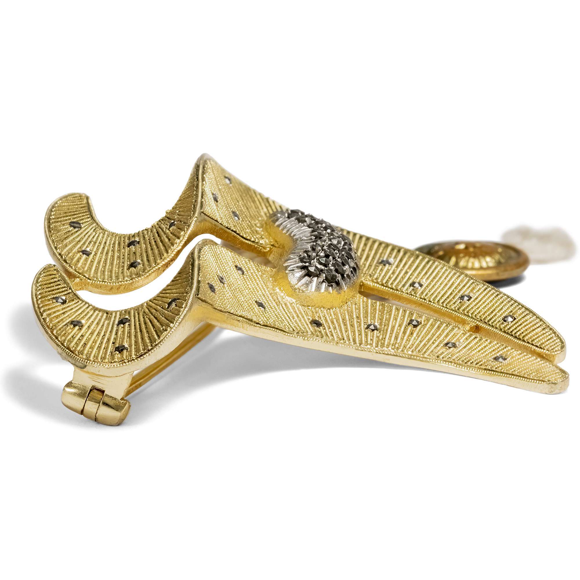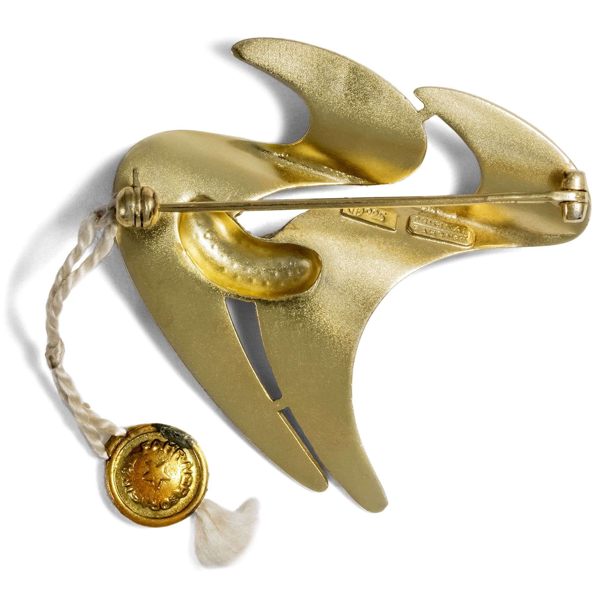 Theodor Fahrner und später sein Nachfolger Gustav Braendle verstanden es wie kaum ein anderer Schmuckfabrikant der Moderne, künstlerisch überzeugende Entwürfe und eine qualitätvolle Verarbeitung zum Markenzeichen ihrer Broschen, Colliers, Armbänder und Ohrringe zu machen. Handlungsreisende mit großen Musterkoffern präsentierten die in Pforzheim entwickelten Neuheiten jedes Jahr bei den Juwelieren vor Ort. Ein solcher Musterkoffer voller ungetragener Fahrner-Schmuckstücke hat die letzten mehr als 40 Jahre unberührt auf einem Dachboden geschlummert, bis er uns angeboten wurde. Er enthielt Musterstücke beinahe aller Serien seit etwa 1919 bis zur Auflösung der Firma 1979, die meisten mit einer Modellnummer oder der „Original Fahrner“-Plombe versehen. Die hier vorliegende Brosche ist daher ungetragen und perfekt erhalten.