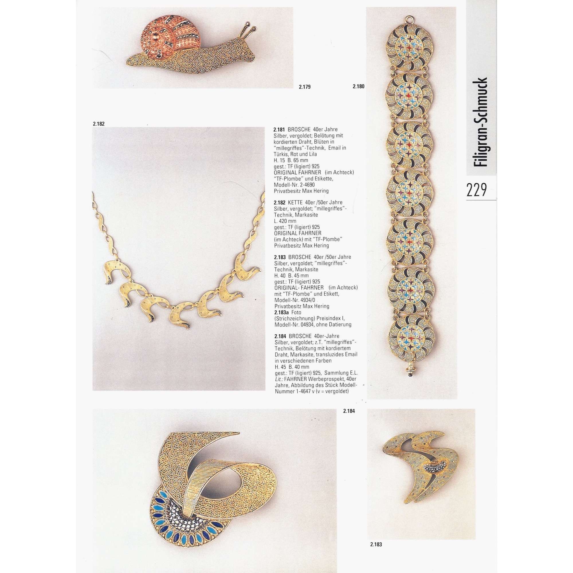| Stempelungen: | Feingehalt „925“, „ORIGINAL FAHRNER“ sowie „TF“ für Theodor Fahrner auf der Rückseite und „METALL“ auf der Nadel |