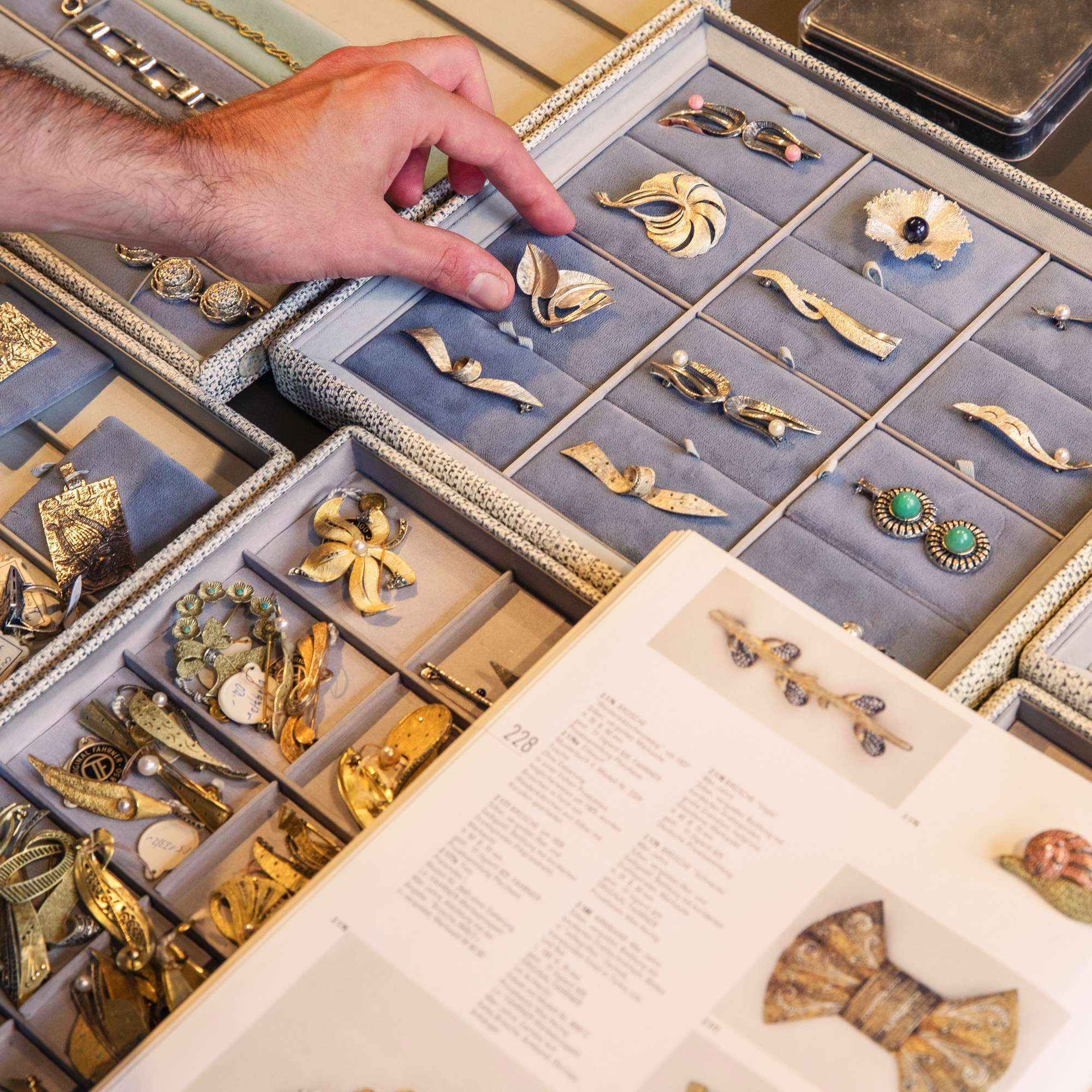 Einen wunderbaren Überblick über die Fülle der Entwürfe bietet der Katalog „Theodor Fahrner. Schmuck zwischen Avantgarde und Tradition“, hg. von Brigitte Leonhardt und Dieter Zühlsdorff, Stuttgart 2005. Die hier vorliegende Brosche ist dort auf S. 229 zu finden und daher ein ganz besonderes Stück.