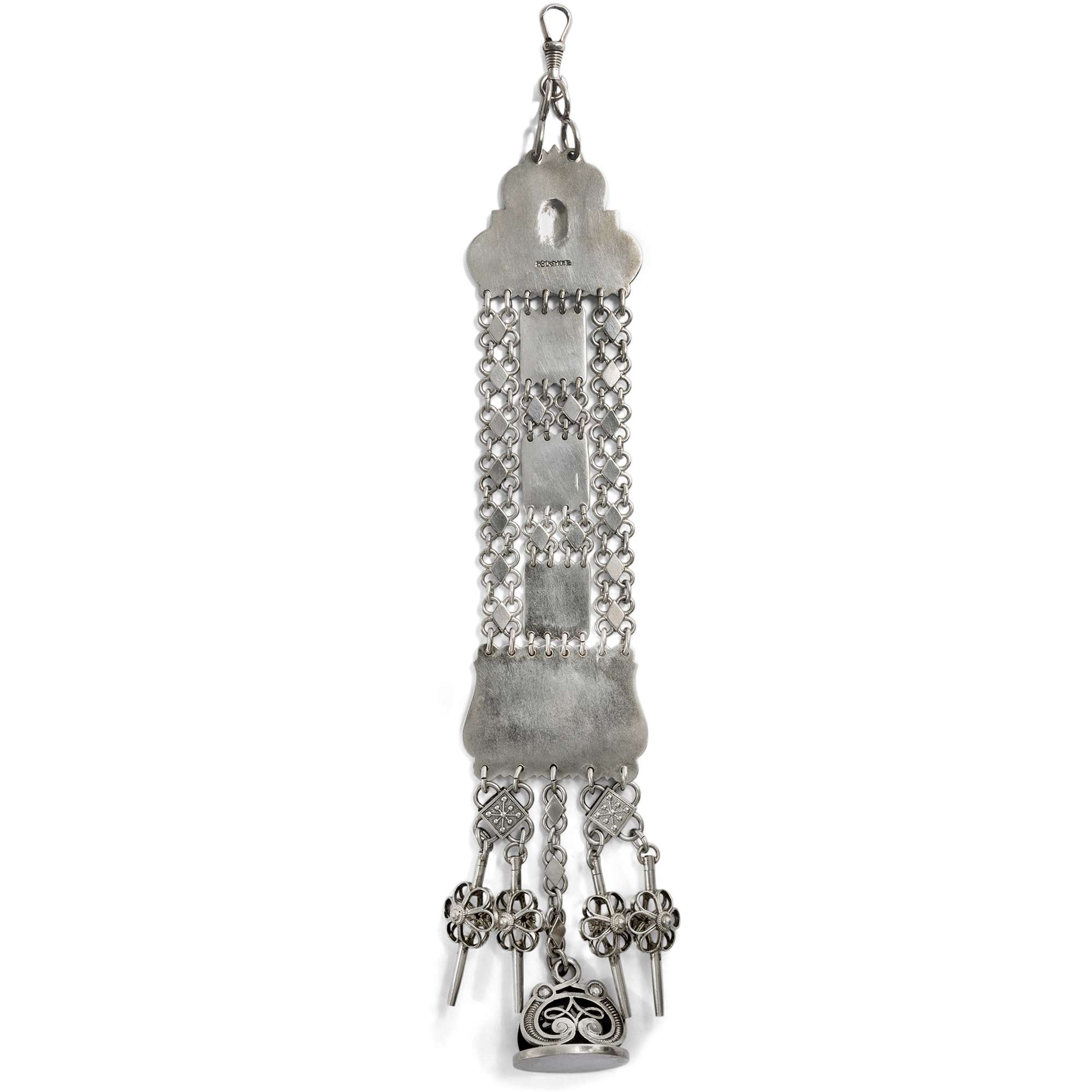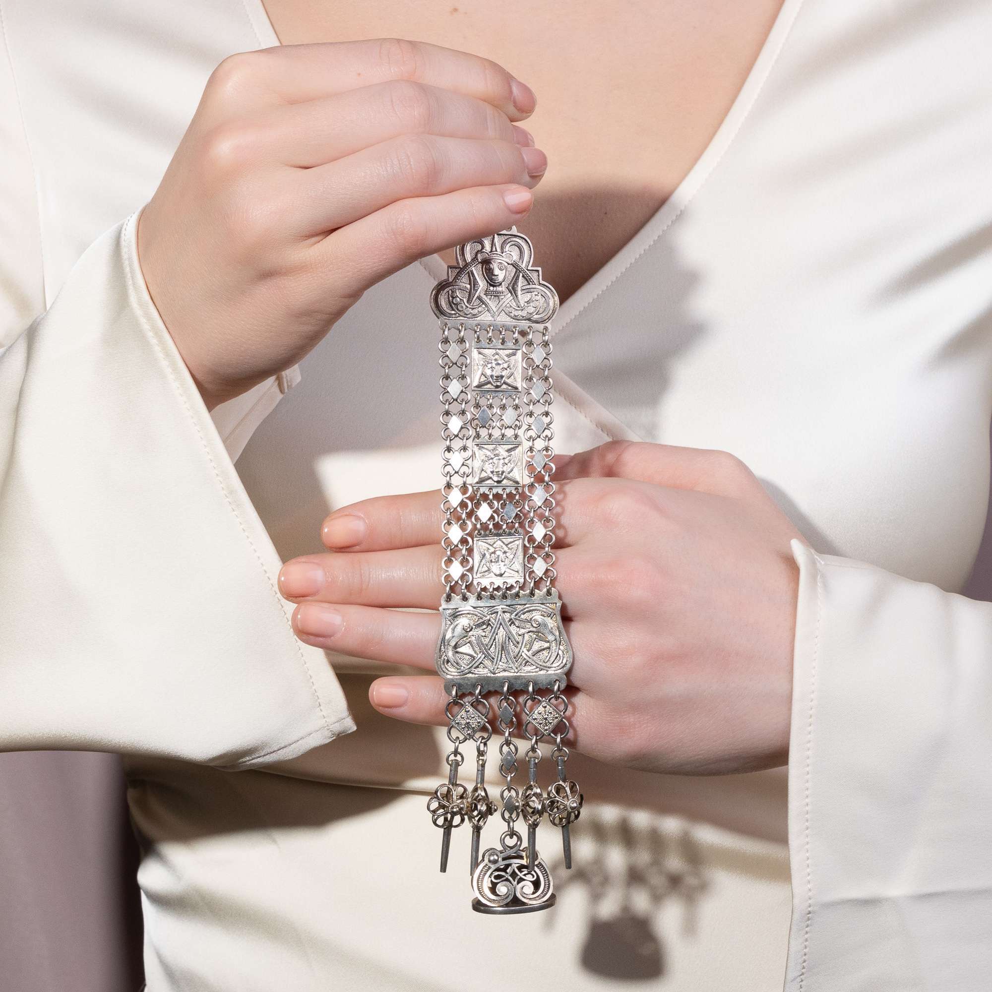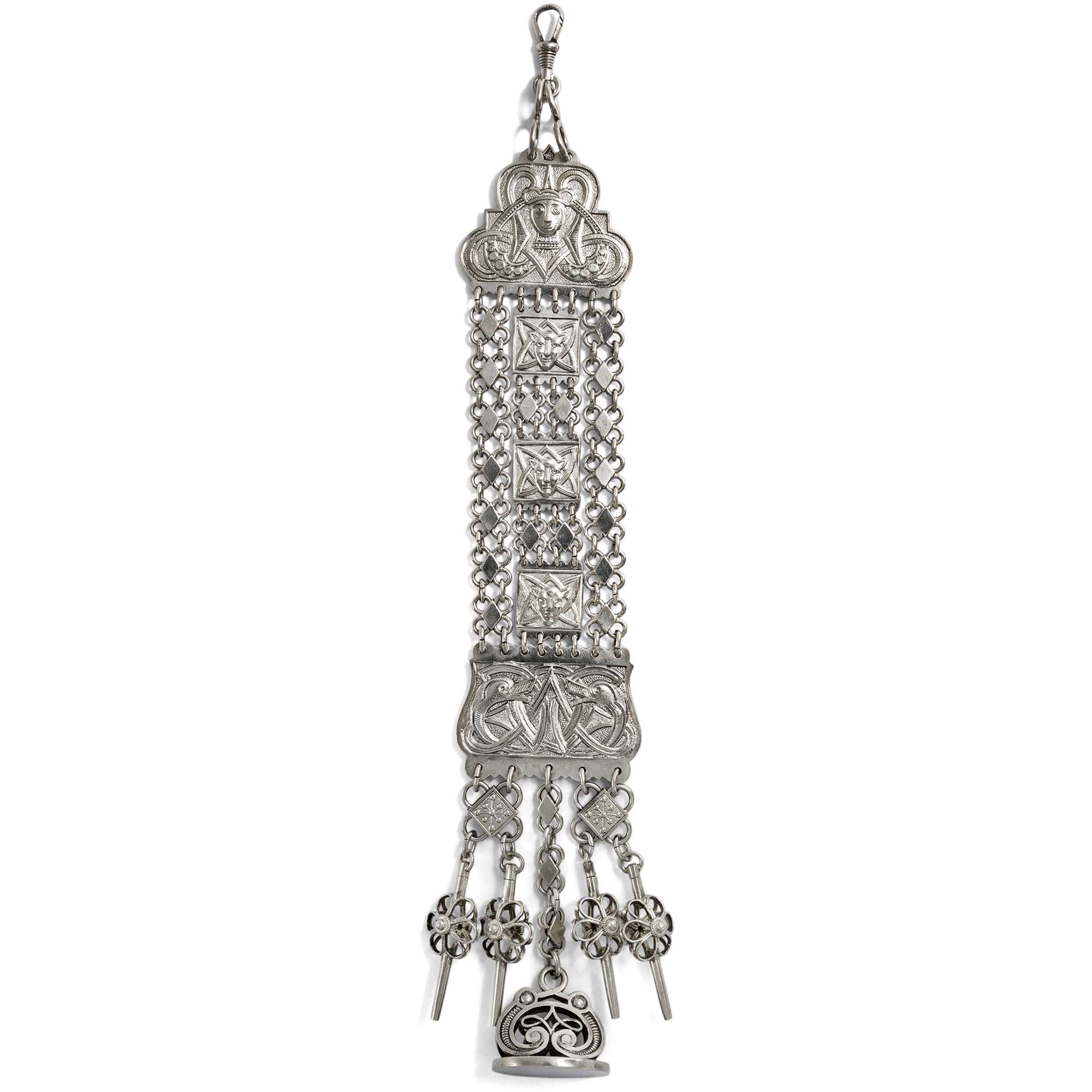 Die vorliegende Chatelaine zeigt neben verschlungenen Knotenbändern vier Masken und zwei Drachenköpfe, wie sie im Mittelalter als Schnitzereien an den Wikingerschiffen und an hölzernen Stabkirchen anzutreffen waren. Mit ihrer kräftigen Formensprache waren sie sowohl im Holzbau als auch in dieser Goldschmiedearbeit als das Böse abwehrende Elemente intendiert. Als Abhängung präsentiert das aus Silber gefertigte Schmuckstück vier Uhrschlüssel sowie eine Berlocke, die graviert werden kann.
