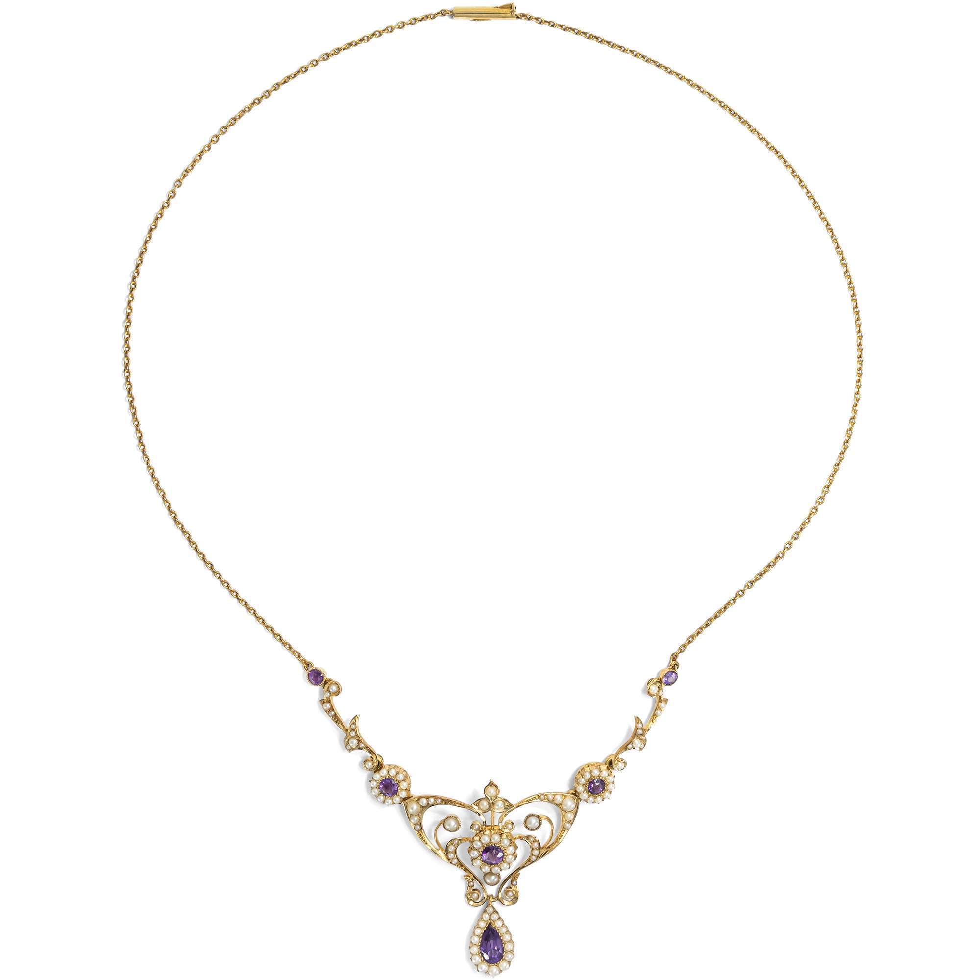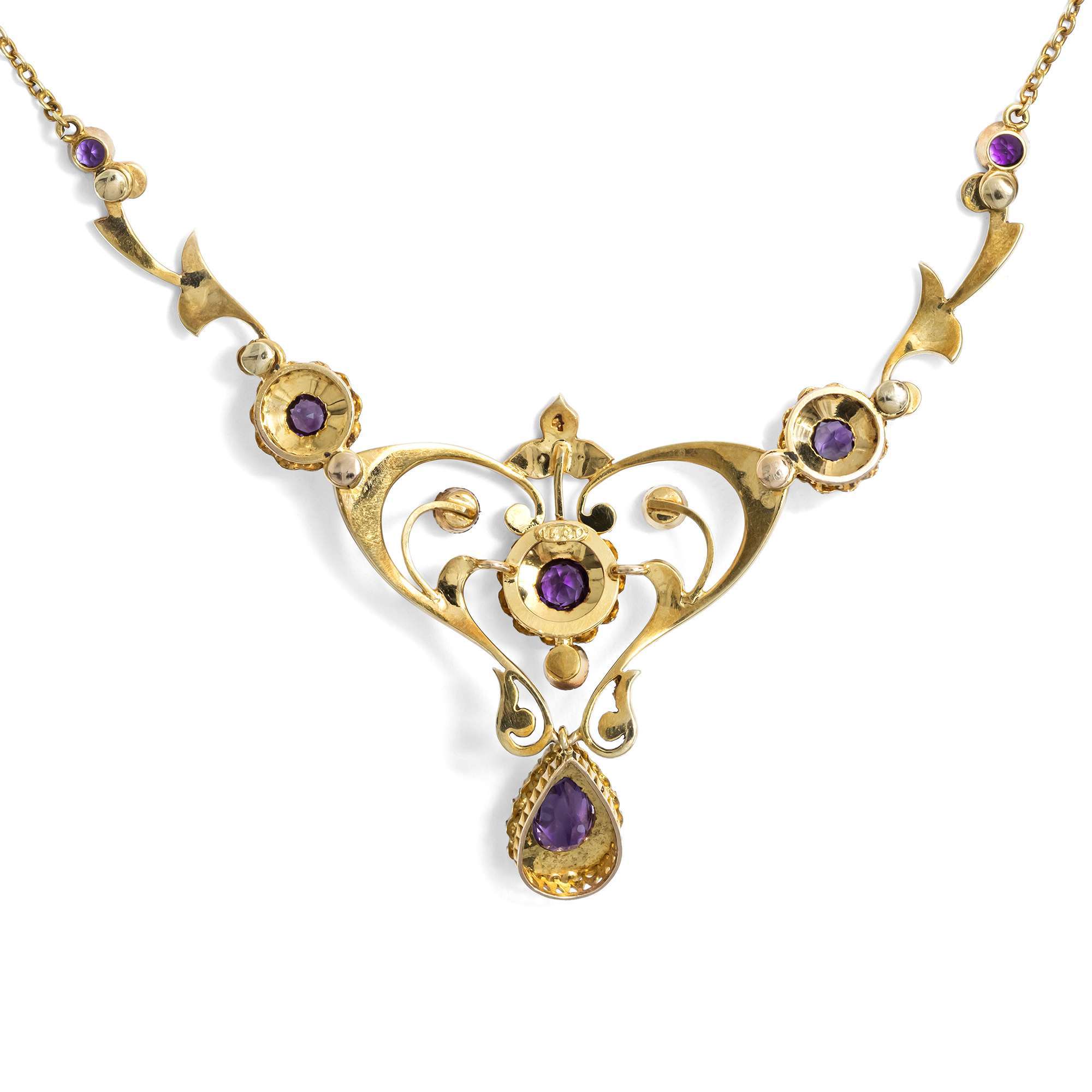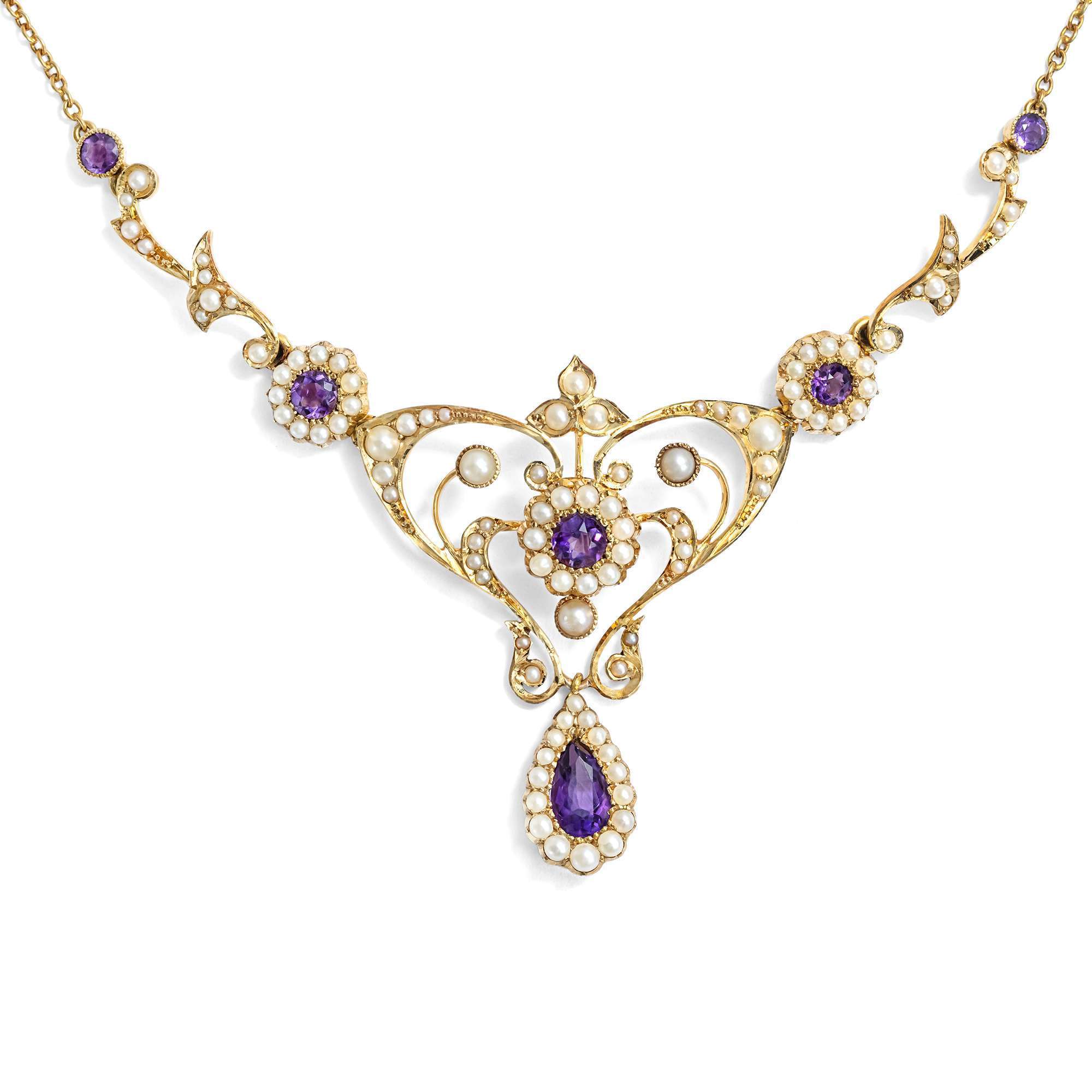 Das hier vorliegende Collier mag eine britische Dame der Jahre kurz nach 1900 zu einer Einladung zum Tee getragen haben, natürlich zu ihrem reich mit Spitze besetzten Afternoon Dress. Brillanten schickten sich zu dieser Gelegenheit nicht, sie waren den Abendstunden vorbehalten. Wollte man dennoch Stil und Modebewusstsein bekunden, war aufwändig gearbeiteter Goldschmuck, jede Perle von Hand gesetzt und mit wunderschönen und doch vergleichsweise bescheidenen Amethysten besetzt, ideal: Kaum ein passenderer Schmuck hätte sich finden lassen.