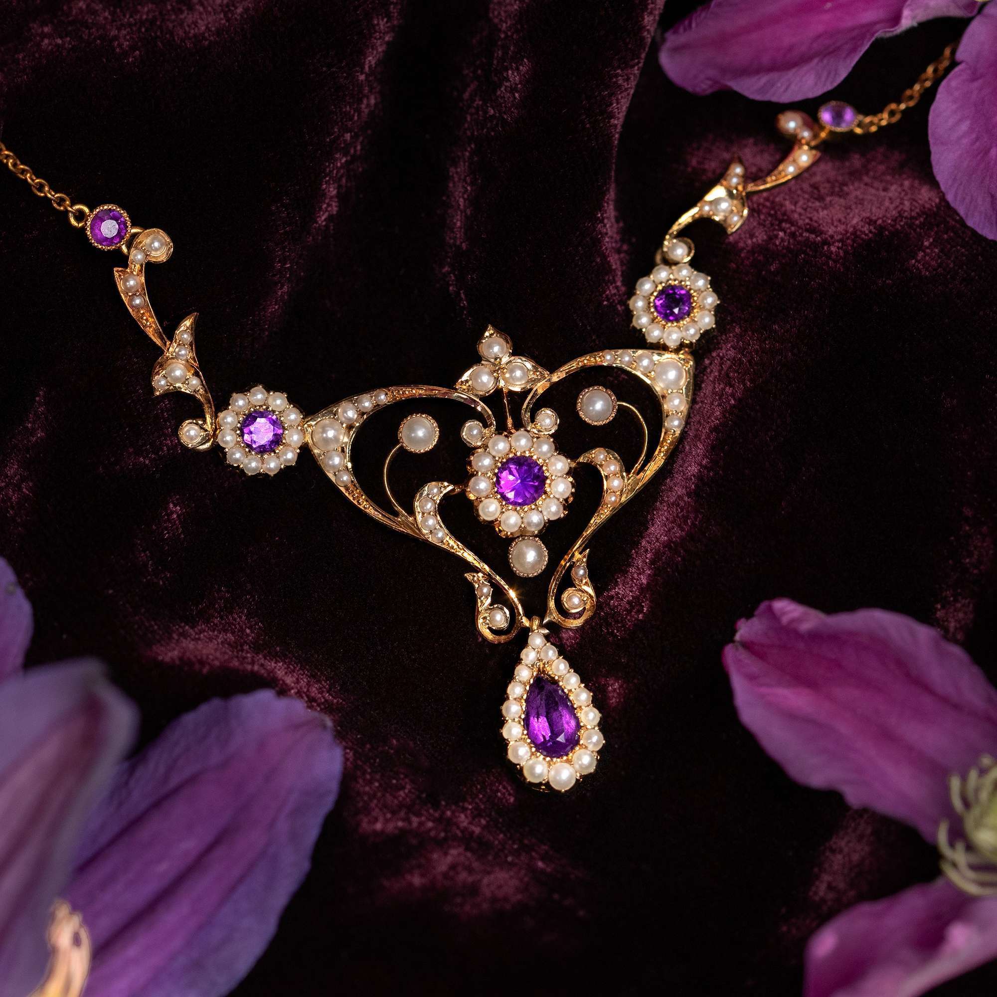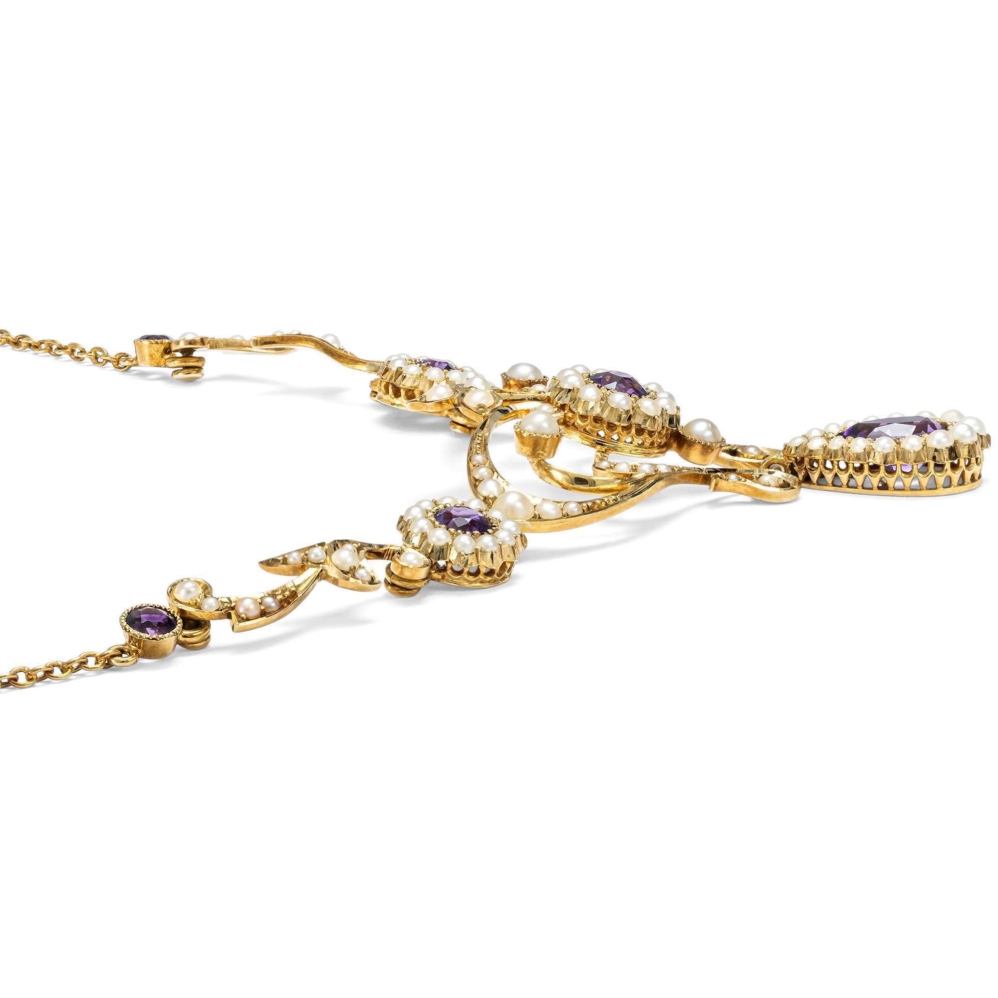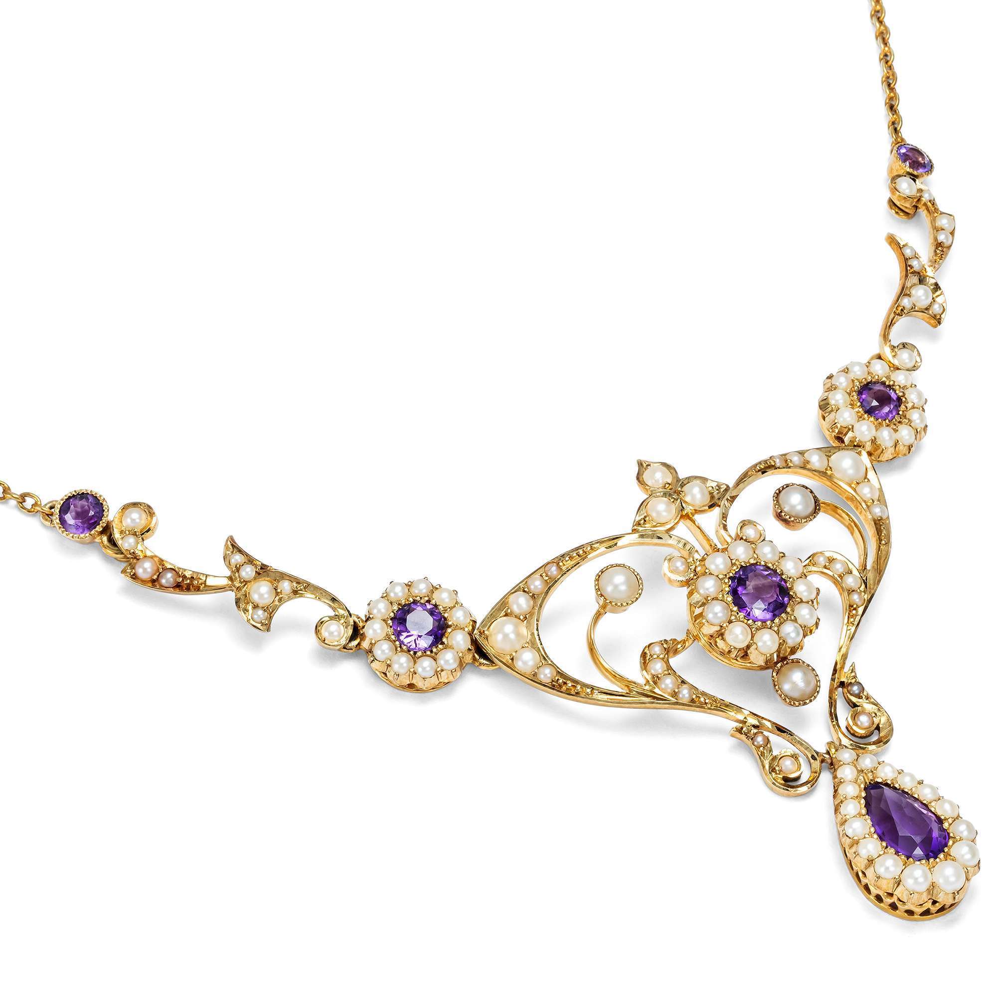 Das hier vorliegende Collier mag eine britische Dame der Jahre kurz nach 1900 zu einer Einladung zum Tee getragen haben, natürlich zu ihrem reich mit Spitze besetzten Afternoon Dress. Brillanten schickten sich zu dieser Gelegenheit nicht, sie waren den Abendstunden vorbehalten. Wollte man dennoch Stil und Modebewusstsein bekunden, war aufwändig gearbeiteter Goldschmuck, jede Perle von Hand gesetzt und mit wunderschönen und doch vergleichsweise bescheidenen Amethysten besetzt, ideal: Kaum ein passenderer Schmuck hätte sich finden lassen.
