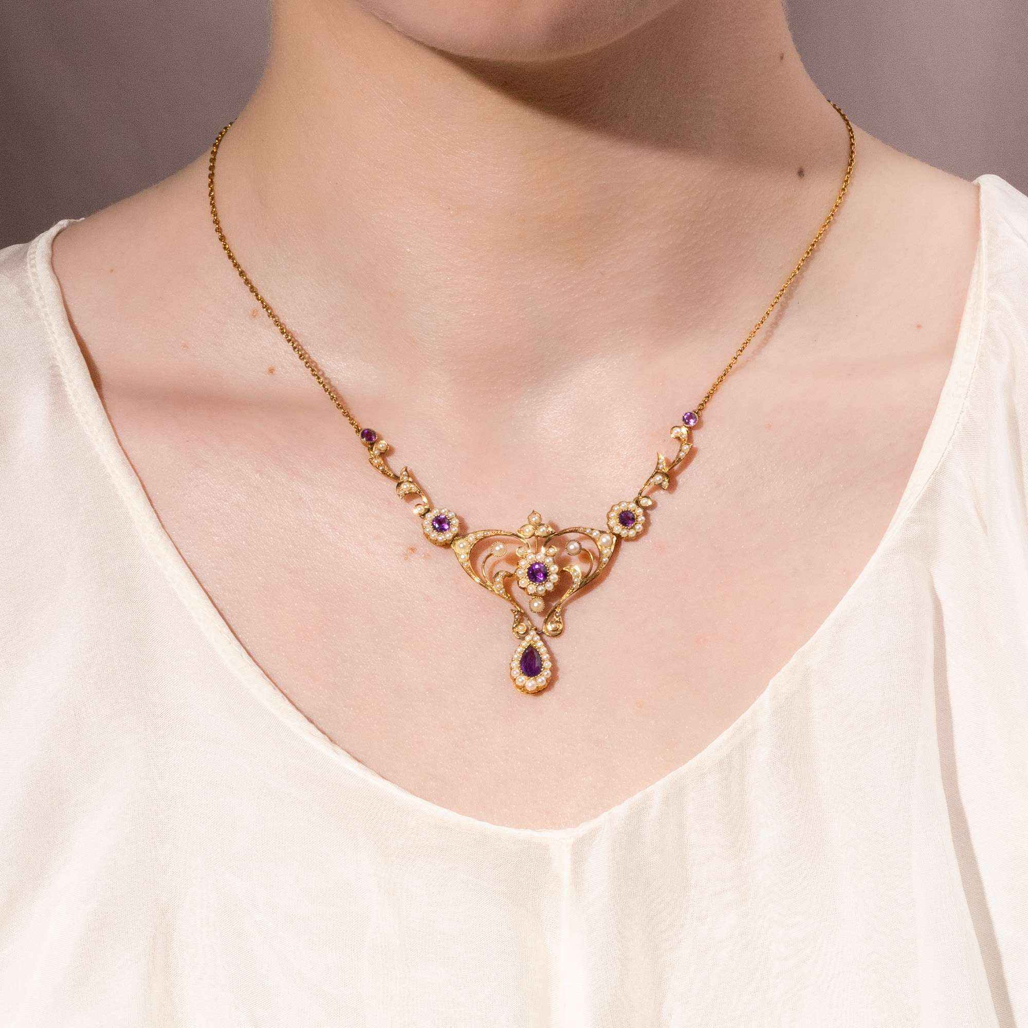 Antikes Collier mit Amethysten & Saatperlen in Gold, Großbritannien um 1905