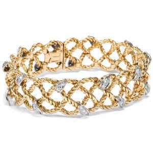 Die klassischen Entwürfe der Epoche waren weiß und reich mit Diamanten besetzt: Entweder als unendlich wirkende Folge gleicher Glieder oder als Armband mit einer betonten Mitte entworfen. Millegrifes und feine Schattenfugen gliedern die einzelnen Elemente, und mitunter sind einzelne Farbsteine als zusätzliche Akzente hinzugefügt.