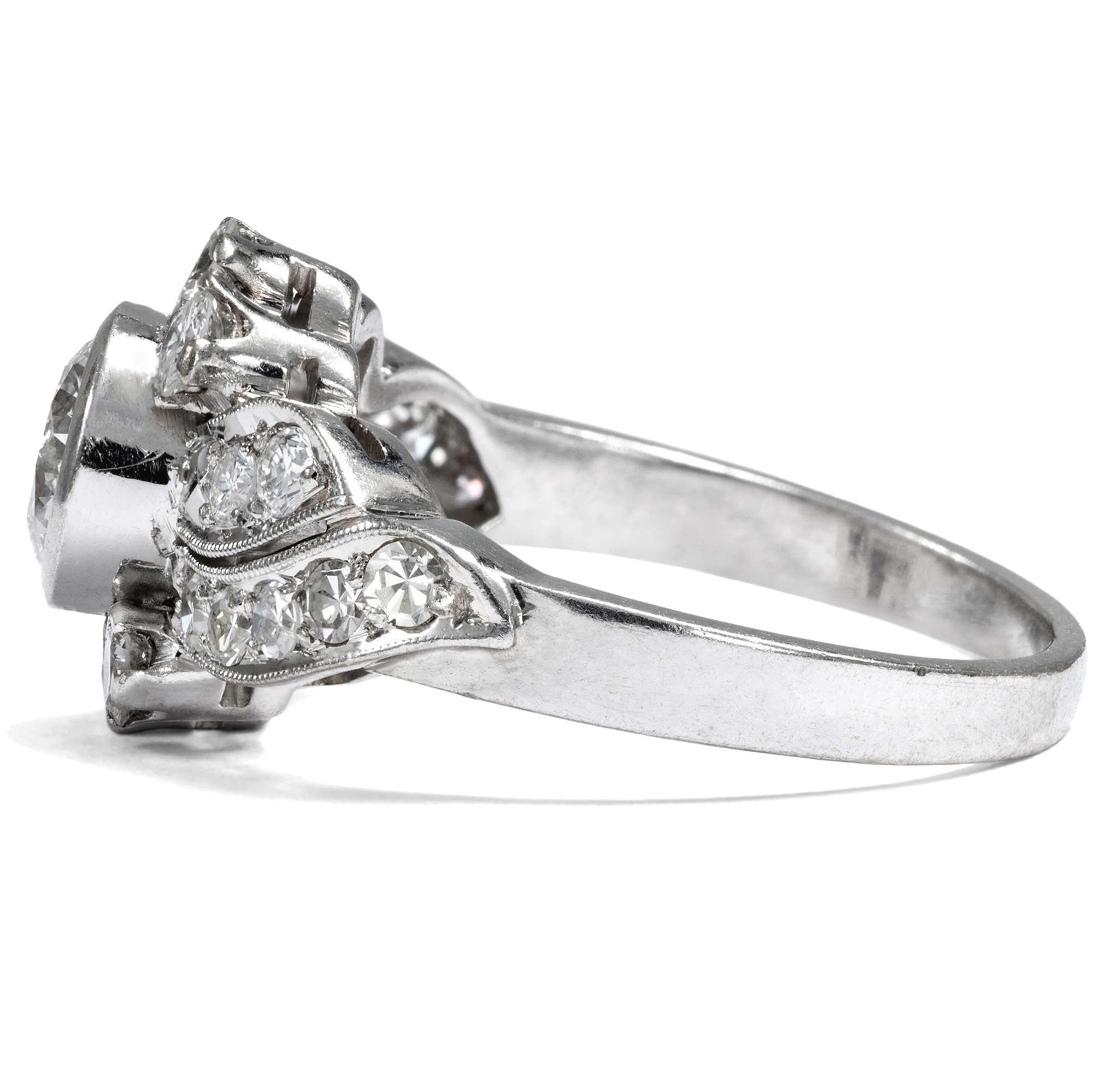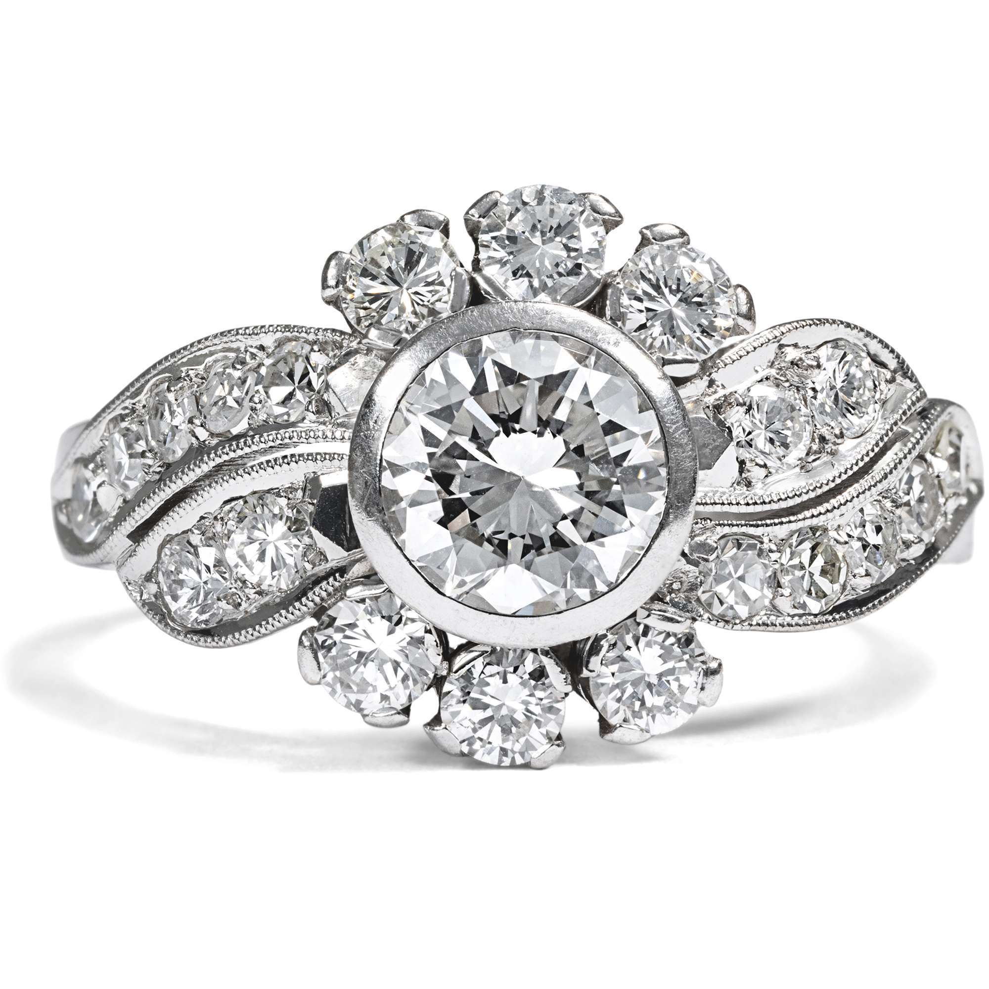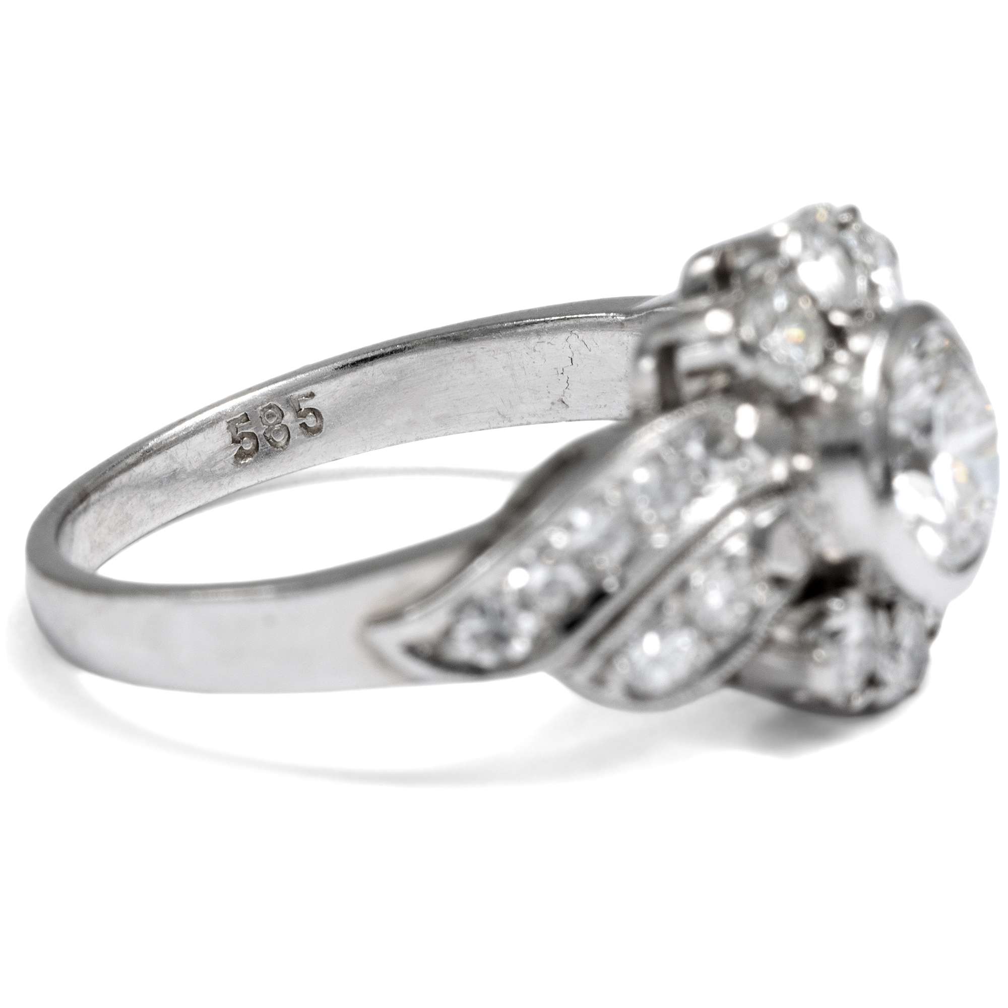 Auch dieser Ring aus den 1950er Jahren strahlt in elegantem Weiß: Aus Weißgold gearbeitet, trägt er einen quer gelagerten, geschwungenen Ringkopf, der sich zur Mitte hin dynamisch verbreitert. Brillanten im Achtkant- und Brillantschliff verwandeln das Schmuckstück in ein wahres Feuerwerk aus Lichtreflexen, das sich um einen Mittelstein sehr guter Qualität gruppiert – 0,75 ct, Weiß (Wesselton, H), vvsi. Insgesamt bringen die sehr reinen Edelsteine ein Gewicht von rund 1,50 Karat auf die Waage.