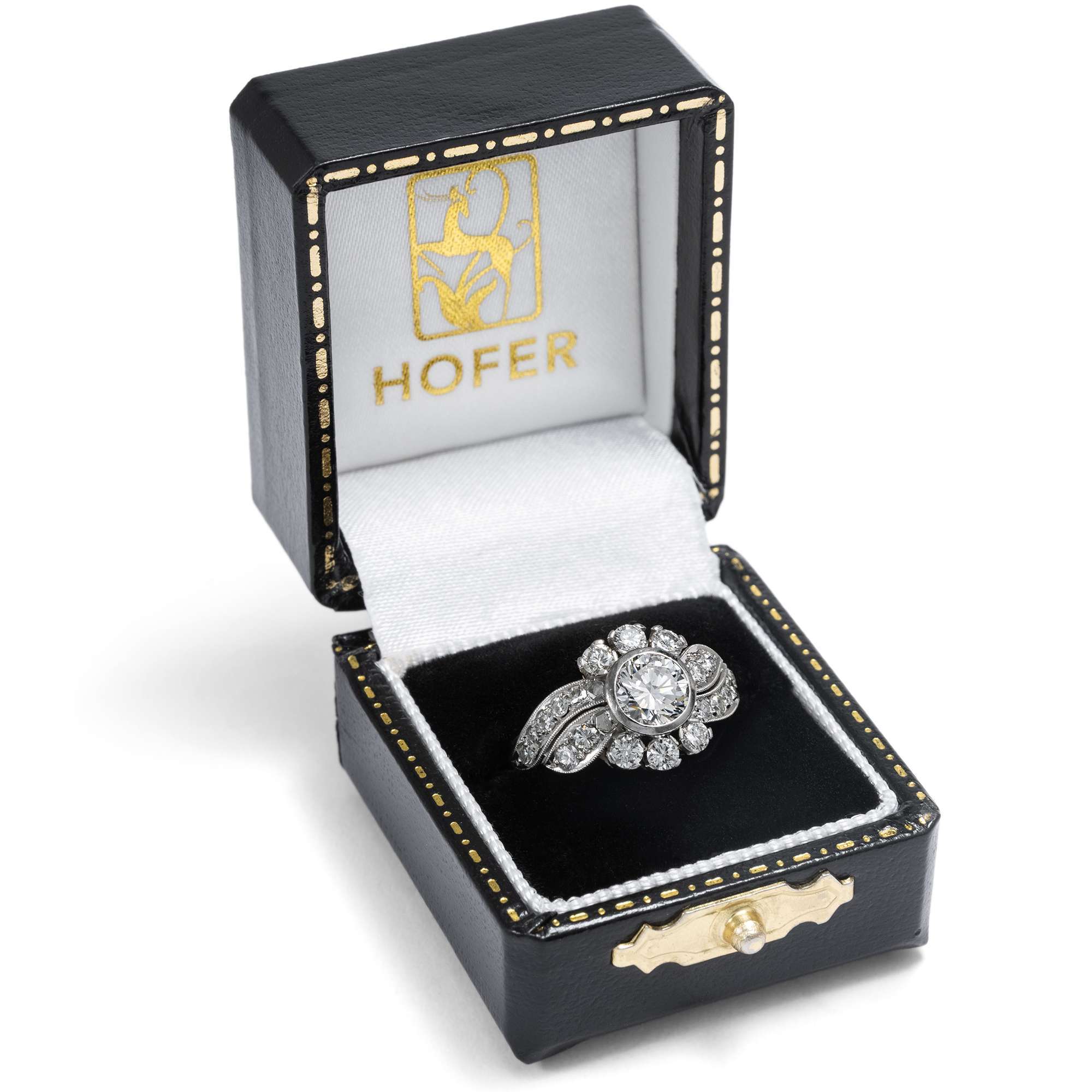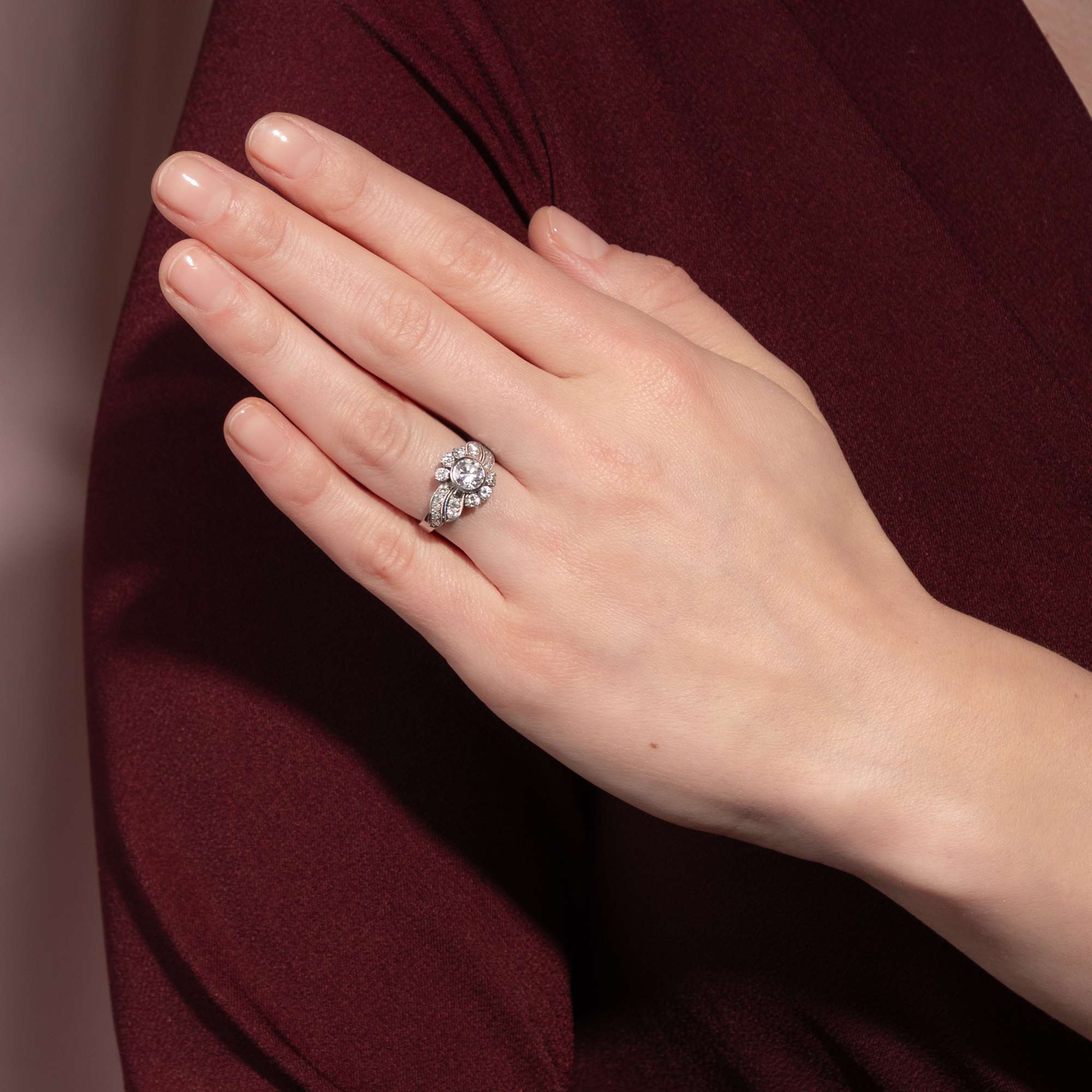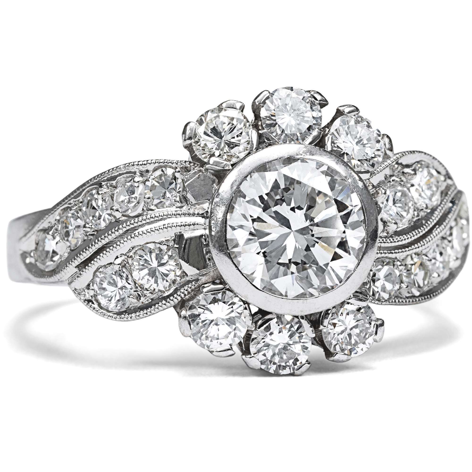 Auch dieser Ring aus den 1950er Jahren strahlt in elegantem Weiß: Aus Weißgold gearbeitet, trägt er einen quer gelagerten, geschwungenen Ringkopf, der sich zur Mitte hin dynamisch verbreitert. Brillanten im Achtkant- und Brillantschliff verwandeln das Schmuckstück in ein wahres Feuerwerk aus Lichtreflexen, das sich um einen Mittelstein sehr guter Qualität gruppiert – 0,75 ct, Weiß (Wesselton, H), vvsi. Insgesamt bringen die sehr reinen Edelsteine ein Gewicht von rund 1,50 Karat auf die Waage.