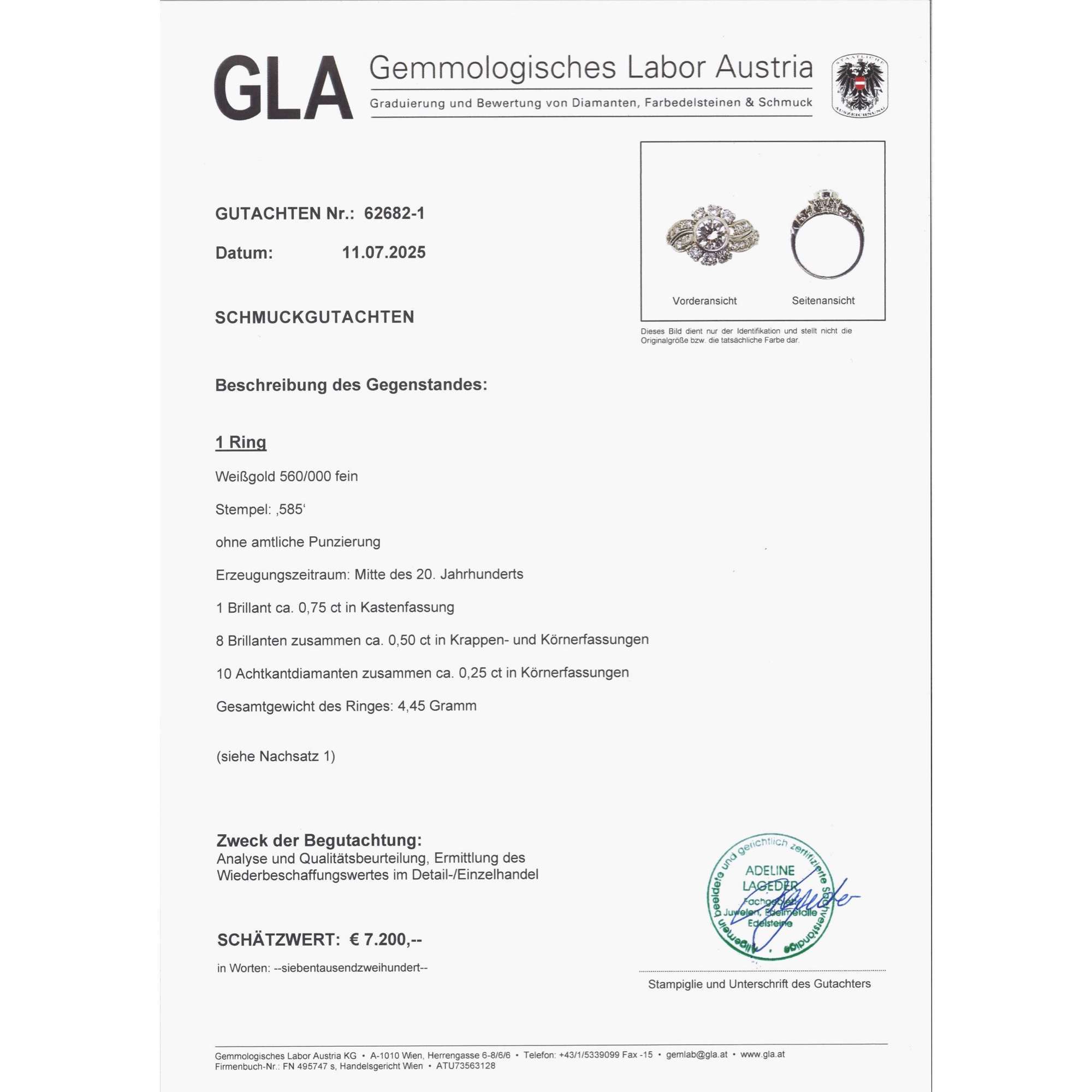 | Zertifikat: | Lieferung mit einem detaillierten Gutachten des Gemmologischen Labors Austria, Wien, vom 11. Juli 2025. Festgestellter Wiederbeschaffungswert: 7.200,- Euro. |