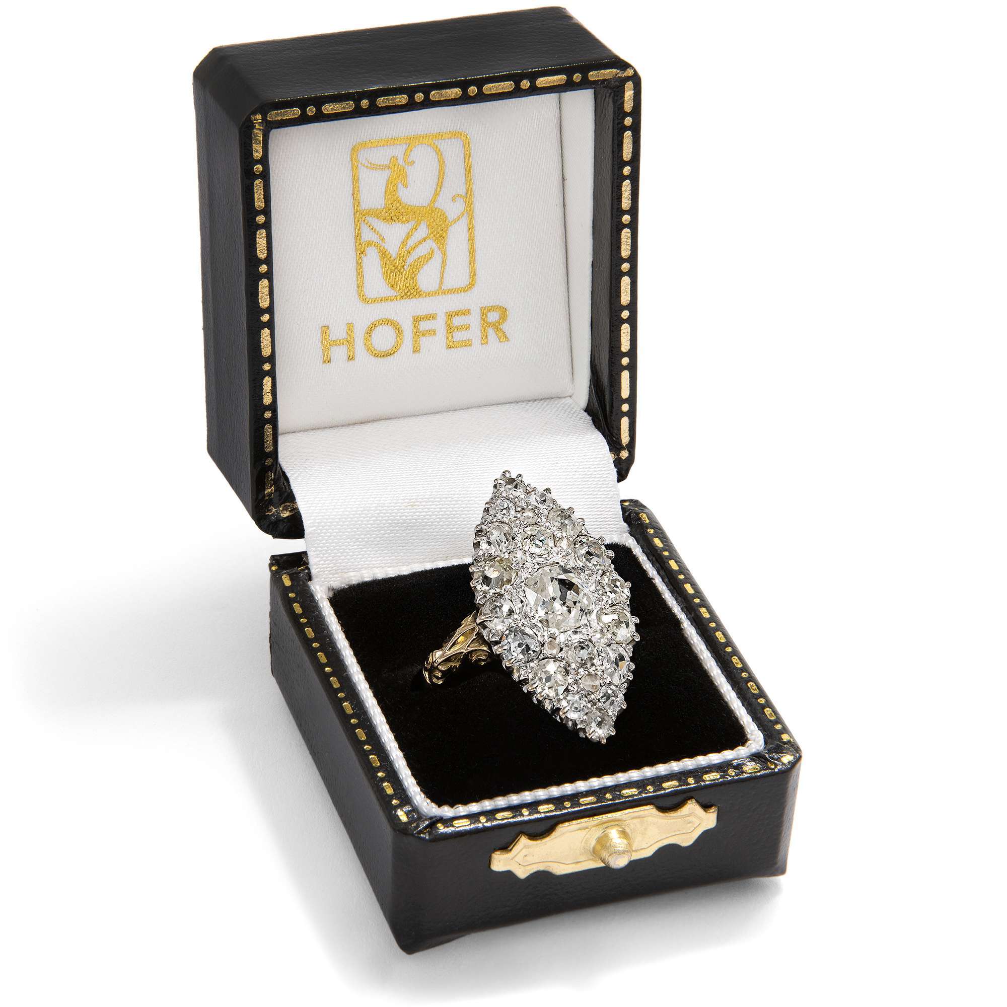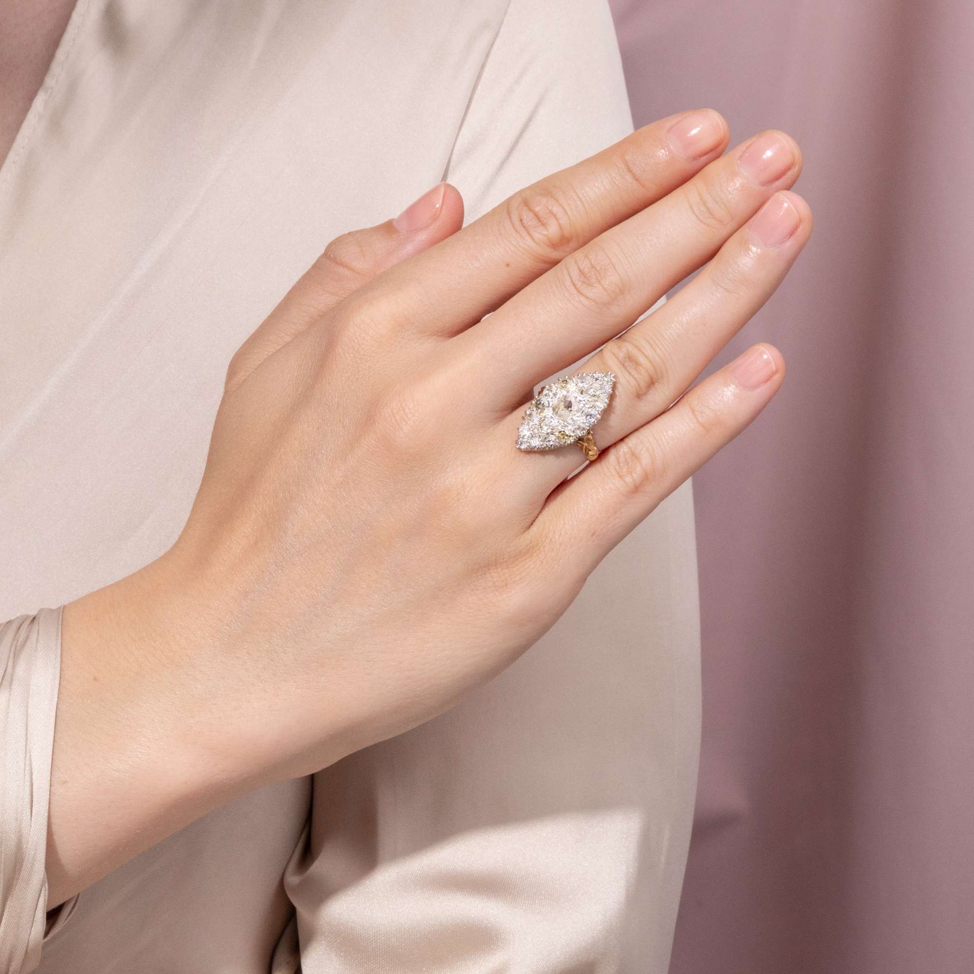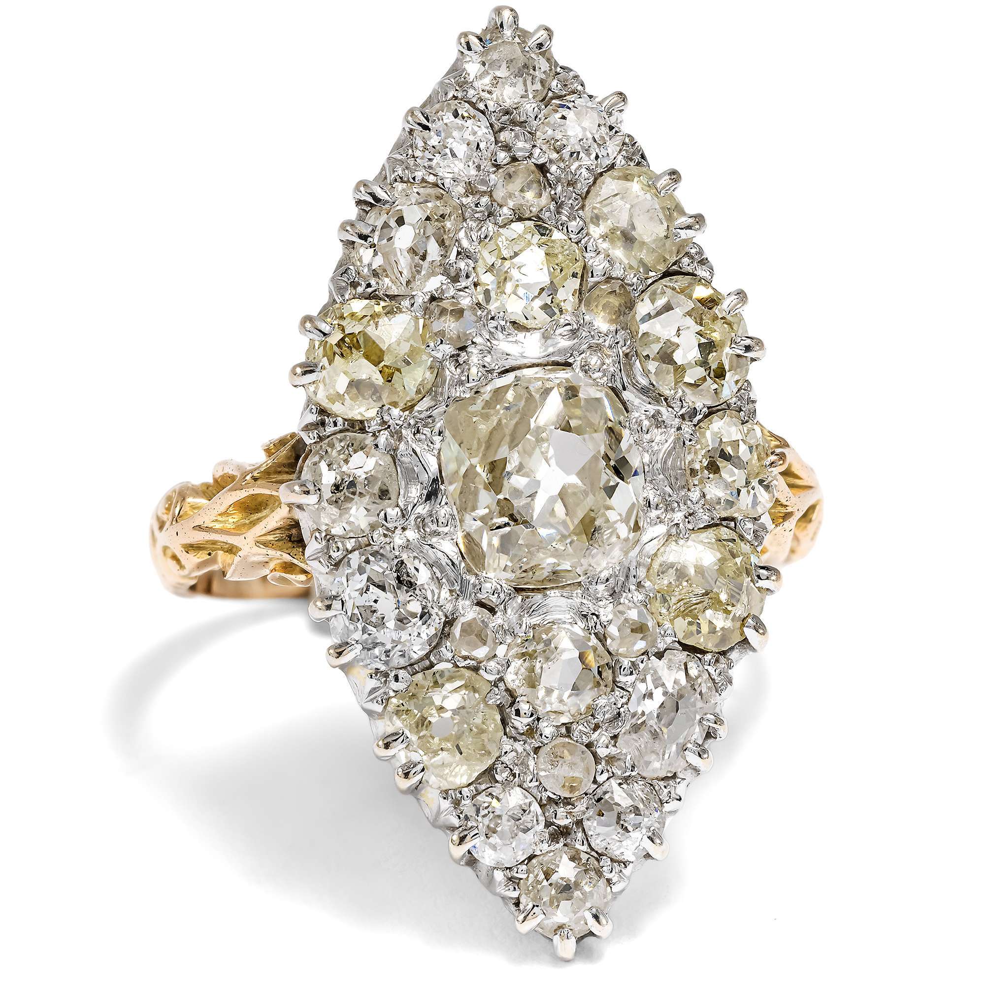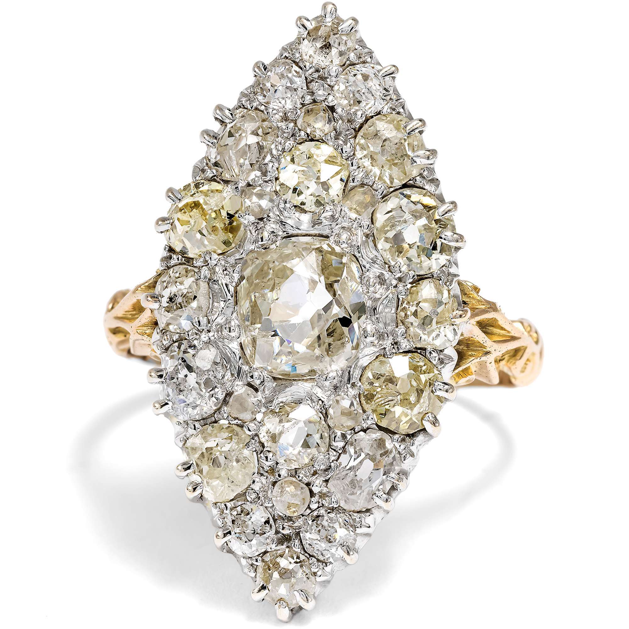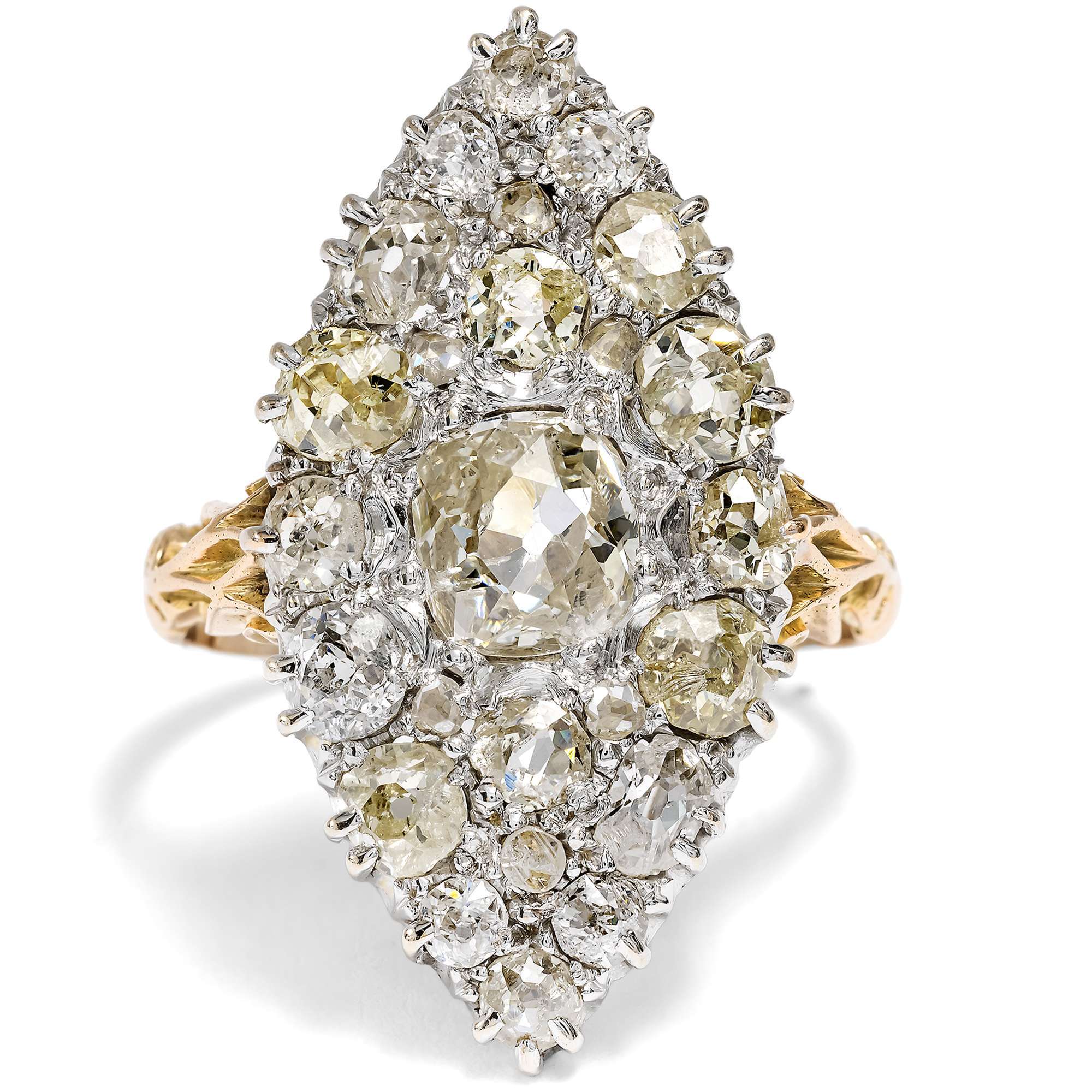 Der vorliegende Marquise-Ring glüht und leuchtet im Licht von insgesamt 25 Diamanten. Insgesamt sind etwa 3,00 Karat Diamanten in historischen Schliffen dicht an dicht eingefasst. Die großen Diamanten sind teilweise warm getönt und im sog. „Old Mine Cut“ geschliffen, einer frühen Form des Brillantschliffes, die bereits in der zweiten Hälfte des 18. Jahrhunderts entwickelt wurde. Die Steine sind deutlich älter als der Ring, der in den letzten Jahren des 19. Jahrhunderts entstanden ist. Sie wurden hier somit in Zweitverwendung eingesetzt.