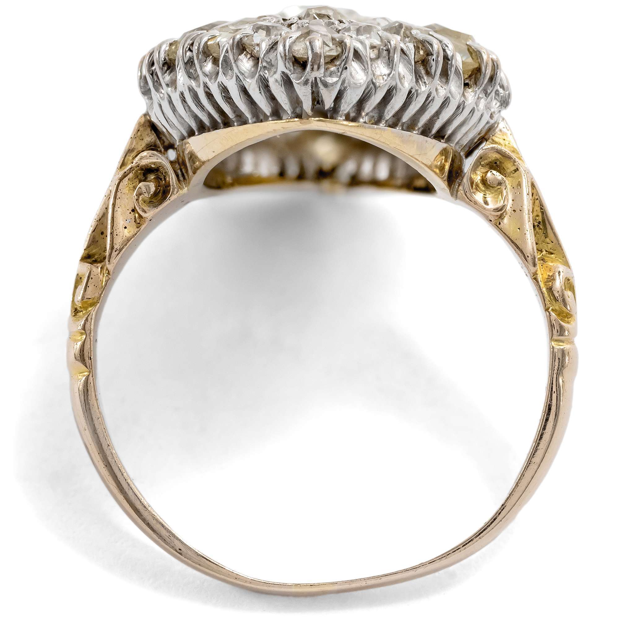 Der Ring selbst ist aus hochkarätigem Gelbgold gefertigt. Elegante Ornamente bereichern die Seitenansicht. Ursprünglich war der Ring vollständig goldsichtig. In späterer Zeit, als weiße Juwelen modern wurden, ließ eine der Vorbesitzerinnen den Ringkopf dann mit einer Auflage aus Rhodium versehen. Seitdem leuchtet der Ring weiß und hell, sodass die Fassungen der Diamanten beinahe unsichtbar wirken – so ähnlich sind sich die Töne des Metalls und der Steine.