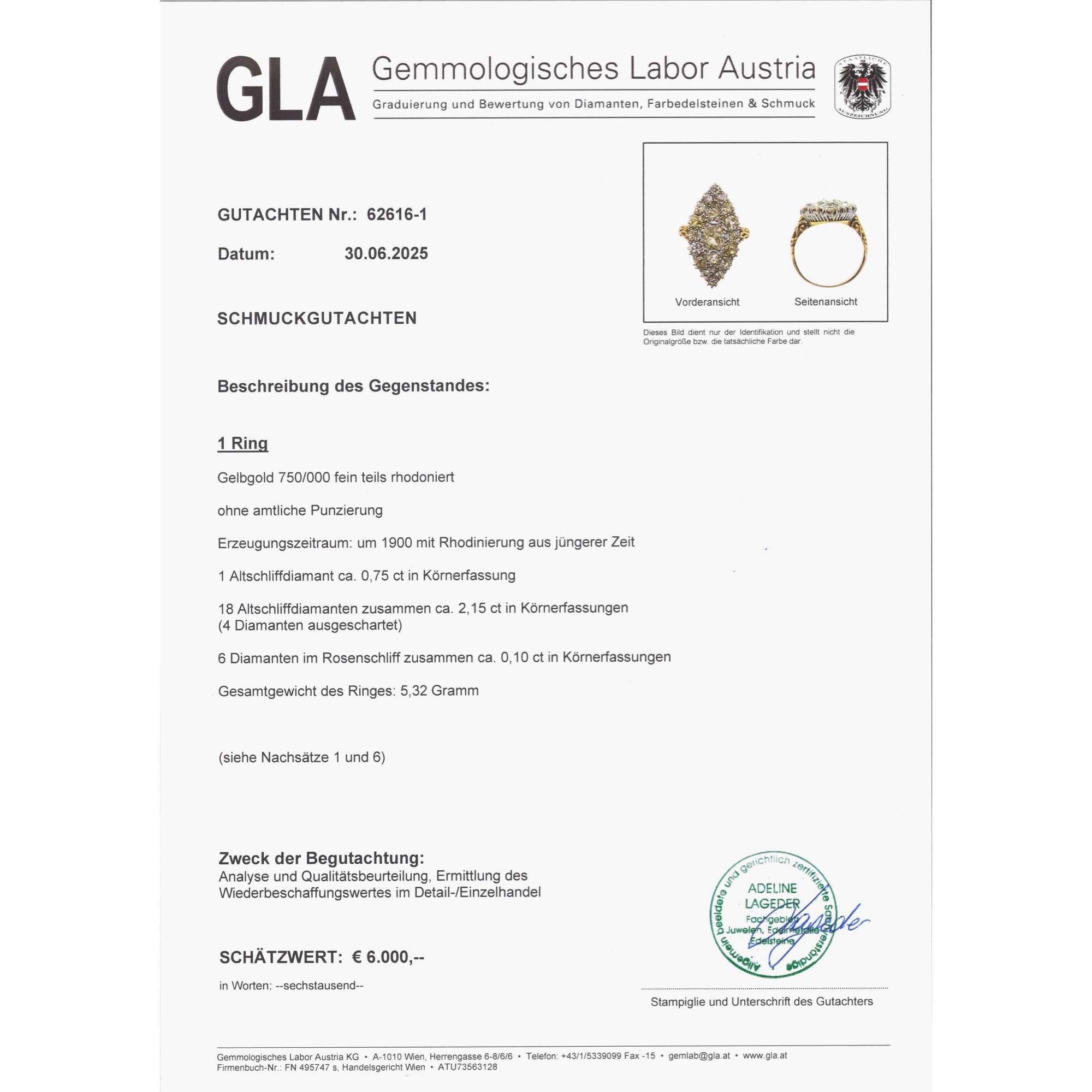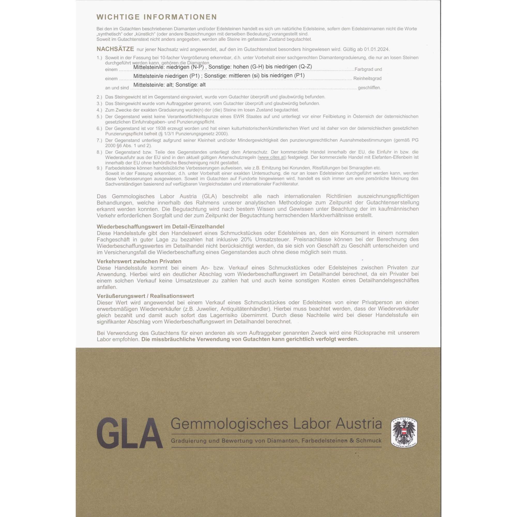 | Zertifikat: | Lieferung mit einem detaillierten Gutachten des Gemmologischen Labors Austria, Wien, vom 30. Juni 2025. Festgestellter Wiederbeschaffungswert: 6.000,- Euro. |