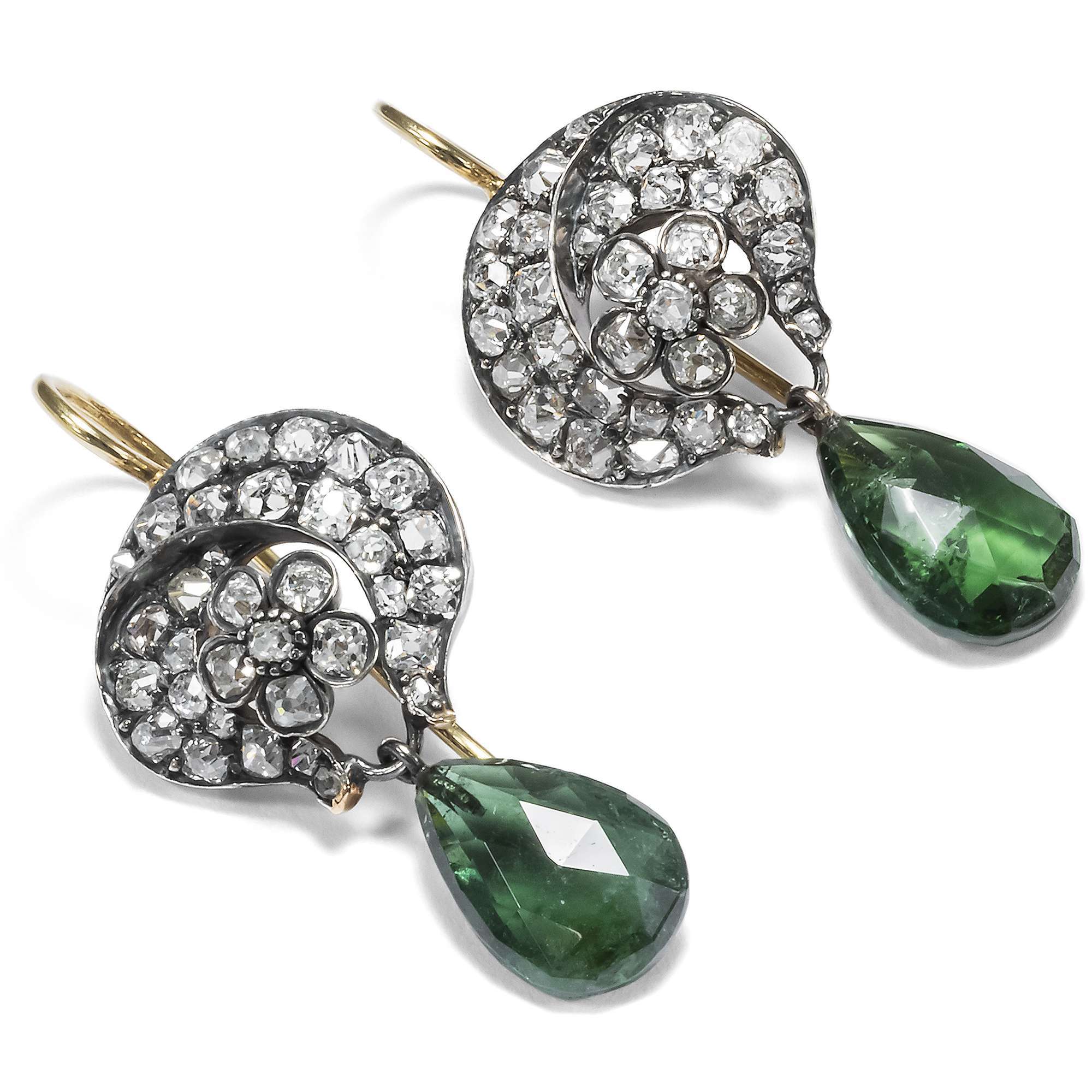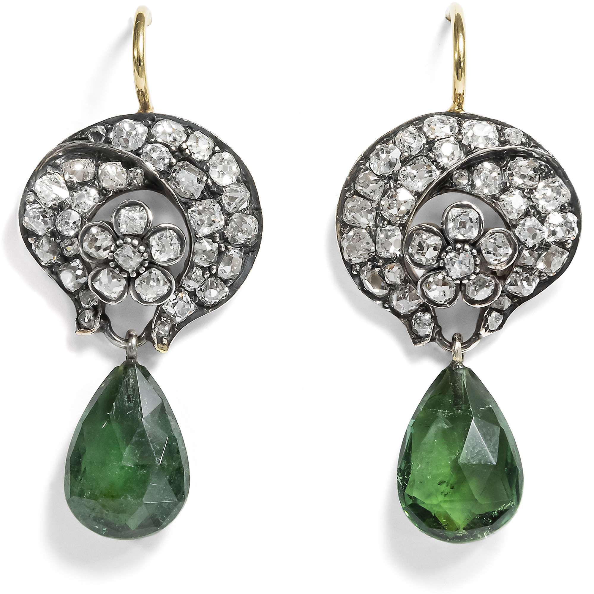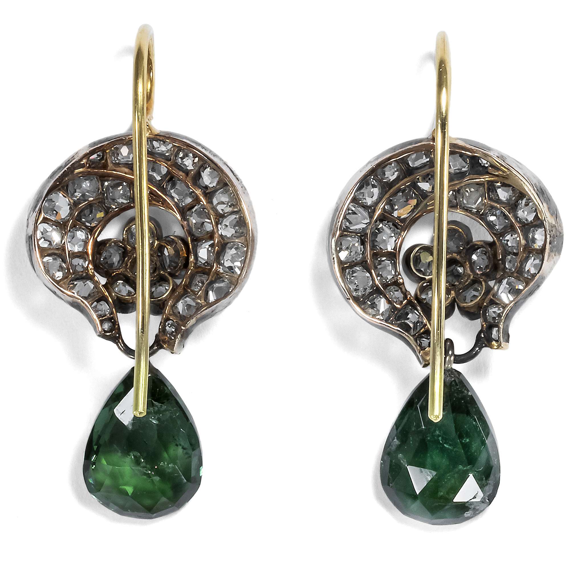 Wir haben diese antiken Elemente mit Bügeln aus hochkarätigem Gold versehen und jeweils einen natürlichen grünen Turmalin im tropfenförmigen Briolettschliff pendelnd abgehängt. Die Turmaline überzeugen dabei mit einem lebhaften Einschlussbild, das sie als Naturprodukte ausweist. Das aus antiken Elementen neue entstandene Paar Ohrringe erfreut mit einer schönen Bewegung, dem Glanz seiner kostbaren Diamanten und seinem angenehm grünen Farbtupfer.