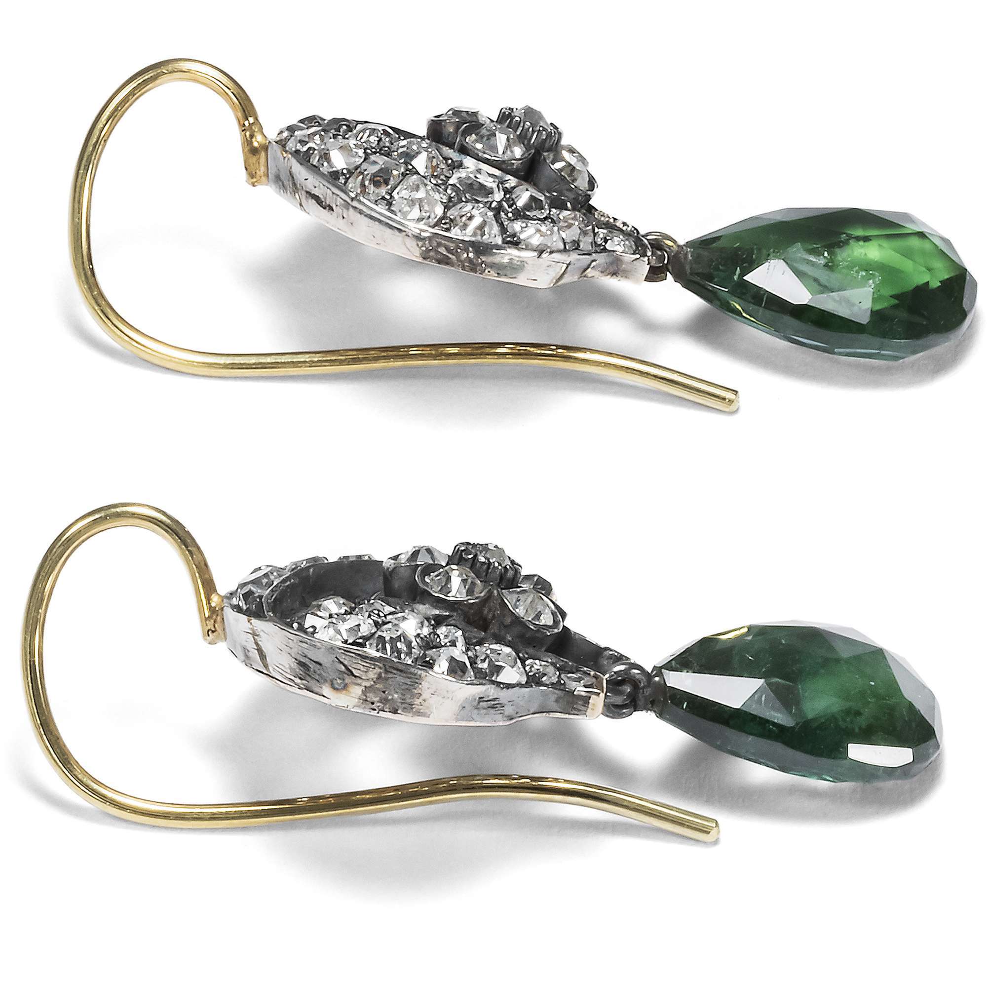 | Material: | Zwei natürliche grüne Turmaline im tropfenförmigen Briolettschliff, zus. ca. 4,8 ct, je etwa 1,2 x 8,3 x 4,4 mm 70 Diamanten im kissenförmigen Altschliff („Old Mine Cut“) sowie im Rosenschlifff, zus. ca. 3,40 ct, Weiß (Wesselton, H) – Leicht getöntes Weiß (Top Crystal, I), si – pi Rückseiten aus Gold 585/000, entspricht 14 Karat Bügel aus Gold 750/000, entspricht 18 Karat Schauseiten aus Silber |