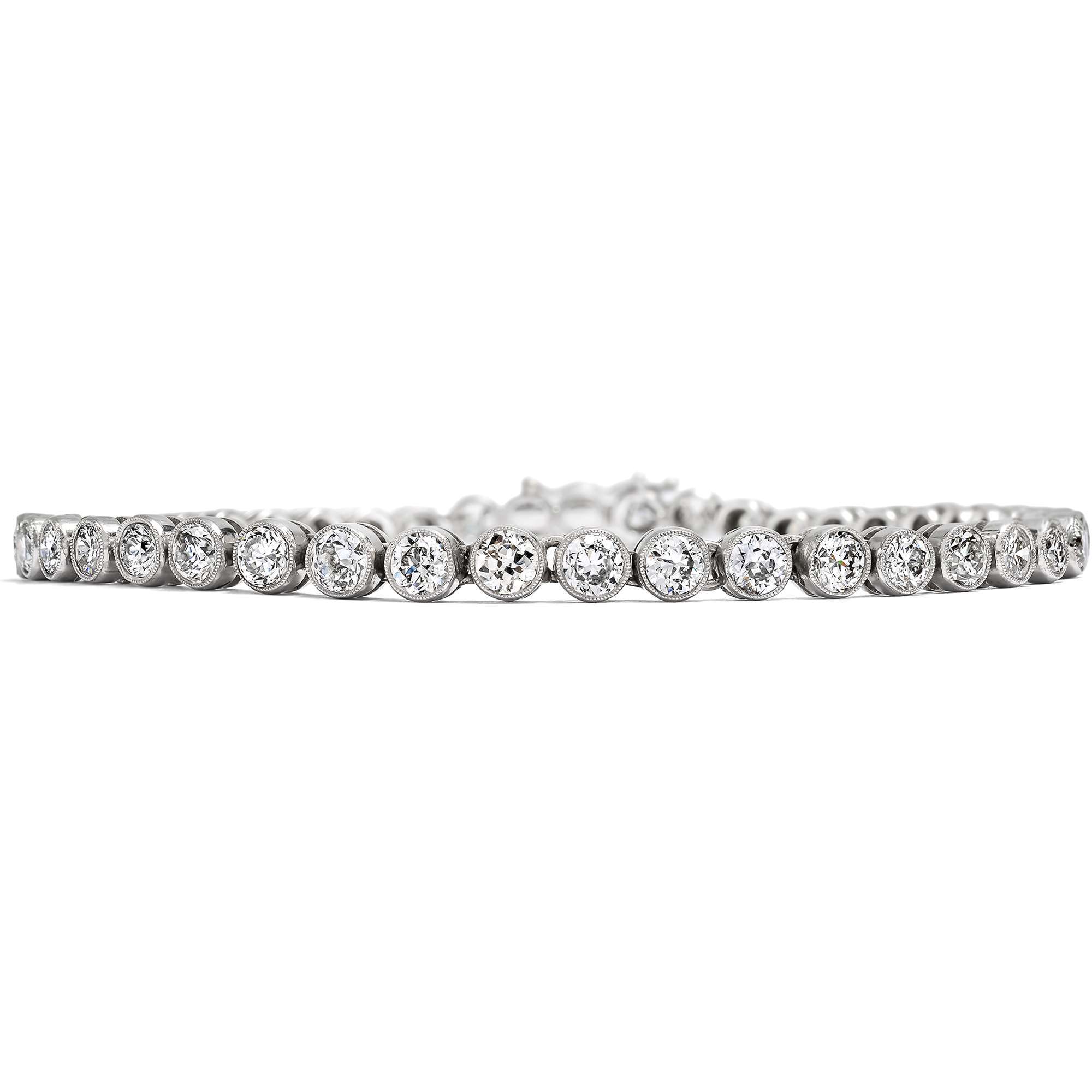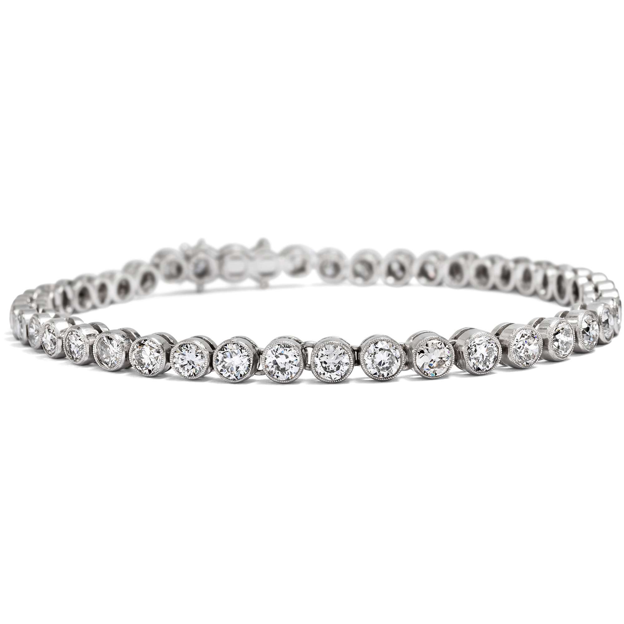 Die im Altschliff und in einem frühen Brillantschliff geschliffenen Diamanten sind in einem leichten Verlauf angeordnet, das heißt, sie sind sorgfältig nach Größe sortiert. Eine praktische Kastenschließe mit Sicherungsachten komplettiert das Schmuckstück und hält es sicher am Handgelenk.Wissen Sie warum man Armbänder wie das hier vorliegende auch „Tennisarmbänder“ nennt? Das ist einem Vorfall während eines Tennismatches der US Open zu verdanken. Hier verlor Chris Evert während eines Spiels ihr diamantbesetztes Rivière Armband und das Match wurde eigens dafür unterbrochen, damit sie ihr geliebtes Schmuckstück wieder in Sicherheit bringen konnte. Das war die Geburtsstunde des Tennisarmbands, das unter diesem Begriff seit dem Tennisereignis im Jahr 1987 in die Schmuckgeschichte eingegangen ist.