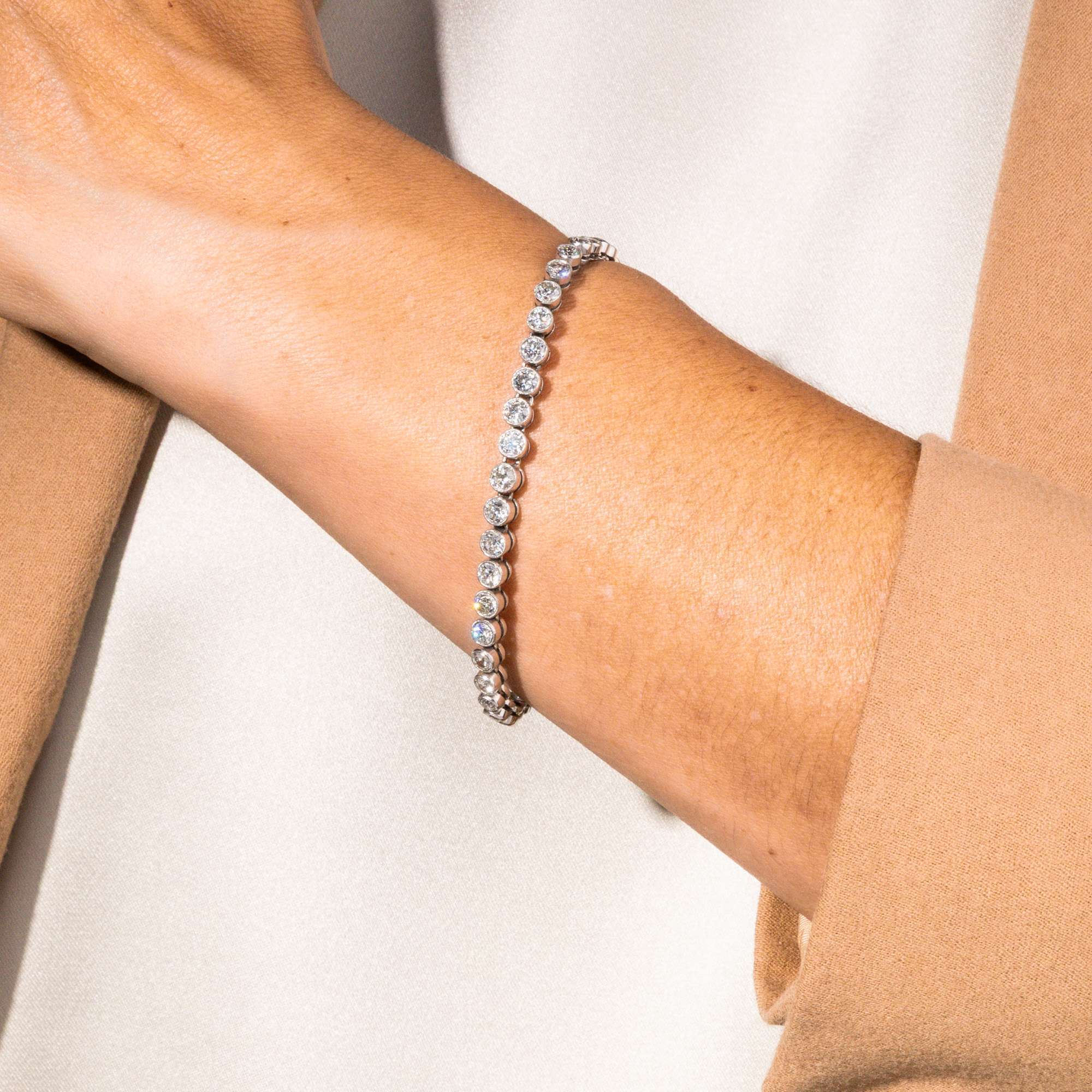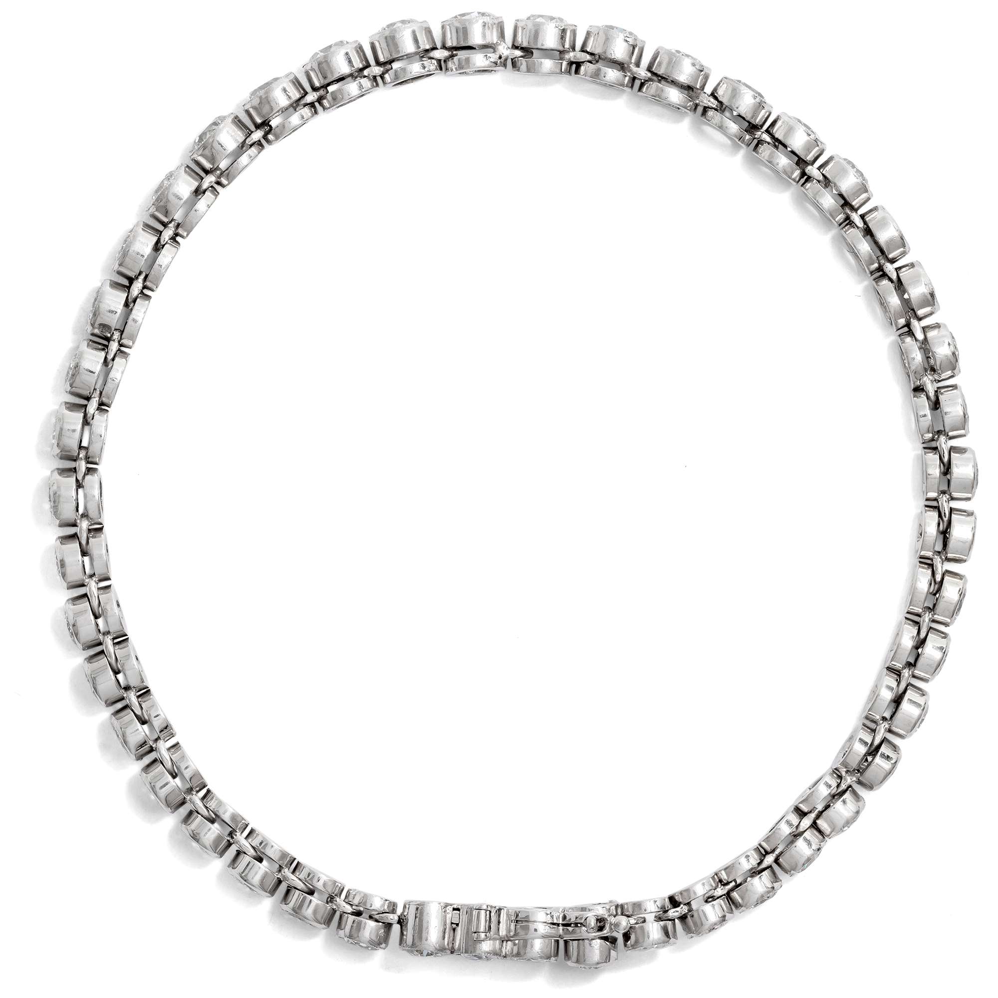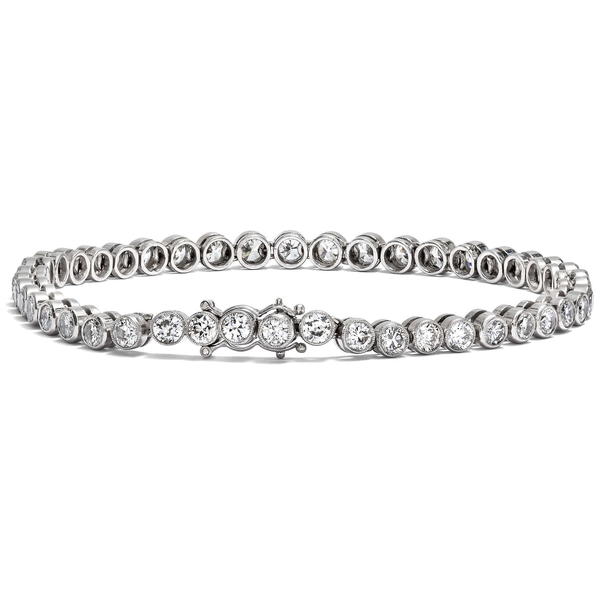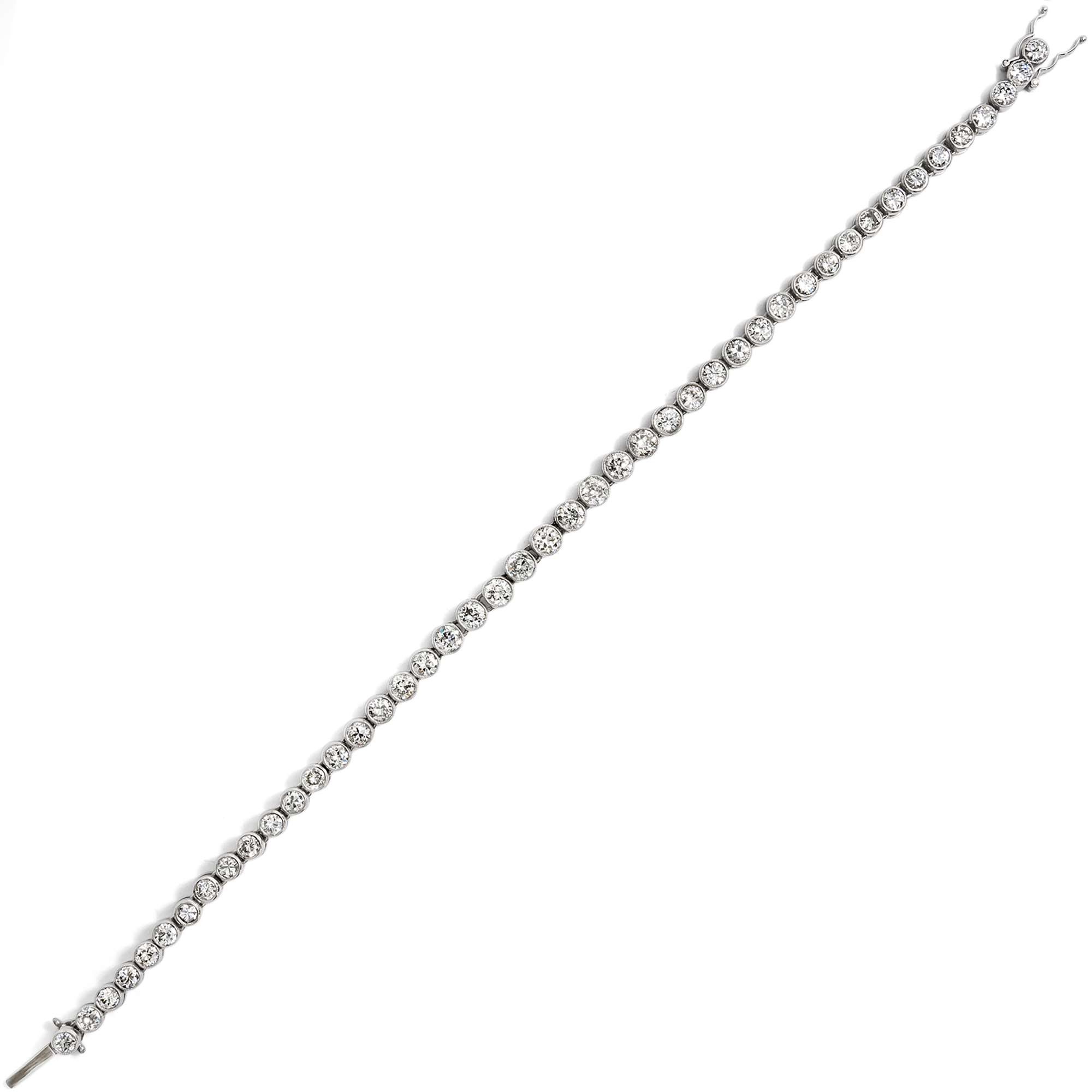 Eine besonders schöne Rivière liegt hier vor: Das Armband der 1920er jahre funkelt und leuchtet, dass es eine Lust ist, hinzusehen. Insgesamt 45 Diamanten mit einem Gesamtgewicht von 6,50 ct sind einzeln in Platin gefasst und beweglich miteinander verbunden, sodass das Armband wunderbar weich und leicht am Handgelenk zu tragen ist. Der wertvolle Edelsteinbesatz strahlt in seinen hellen Fassungen ein kühles Feuerwerk blitzender Lichtreflexe aus.
