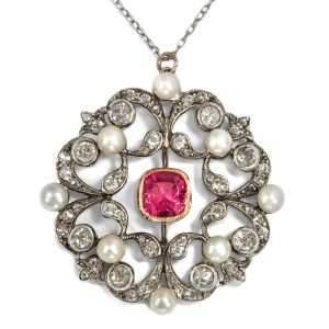 Was wir hier sehen, ist die Formensprache des sogenannten „Garland Style“, des „Girlandenstils“, in mustergültiger Ausführung. Um 1900 brachte dieser Stil eine neue Ästhetik in die Welt des Schmucks, die dem organischen Jugendstil eine klassischere, feinere Gestaltungsauffassung entgegensetzte. Anlehnungen an Louis-XVI-Formen und Motive der Antike belebten einen zarten Neoklassizismus, der kleine Lorbeerranken ebenso schätzte wie Festons, Schleifen und winzige Millegriffes-Verzierungen.