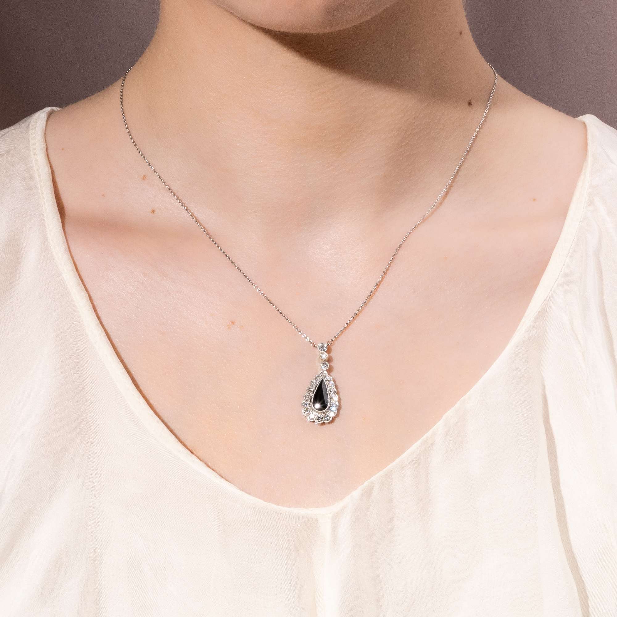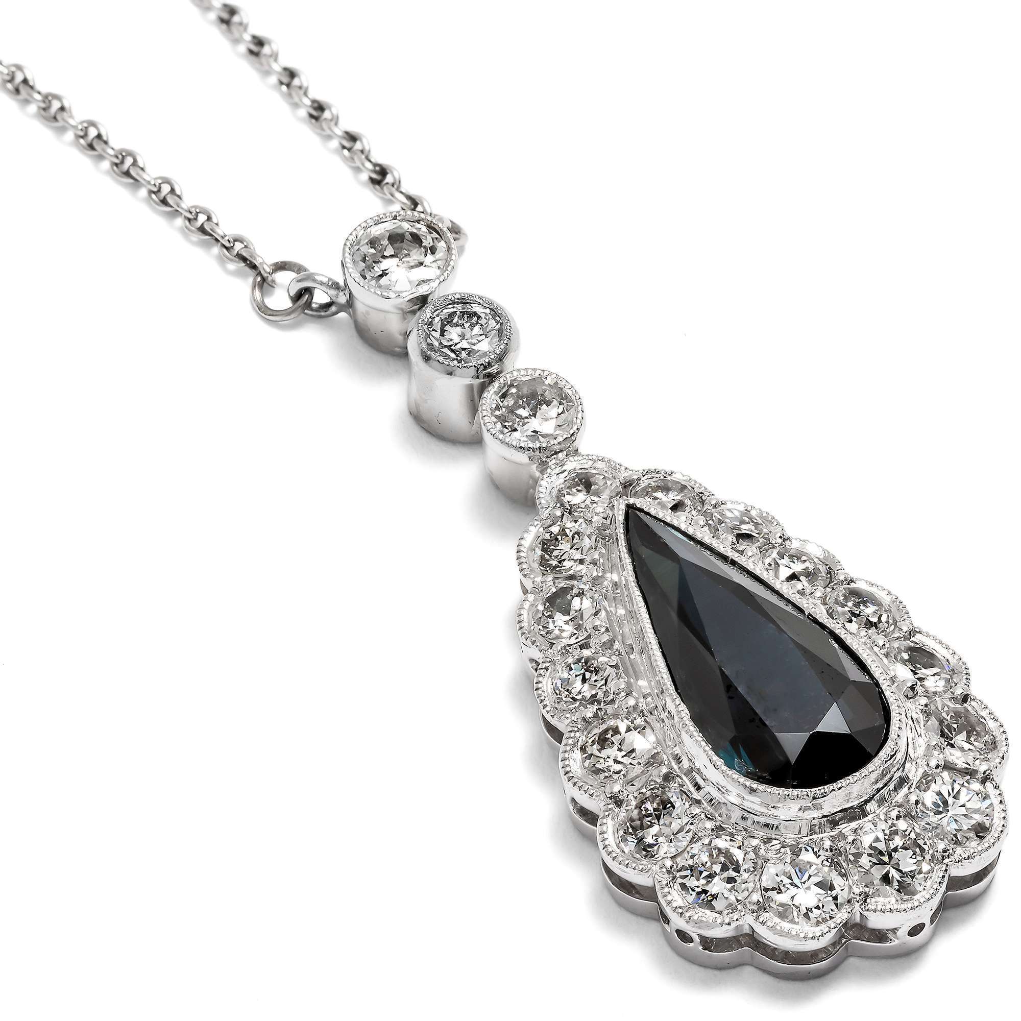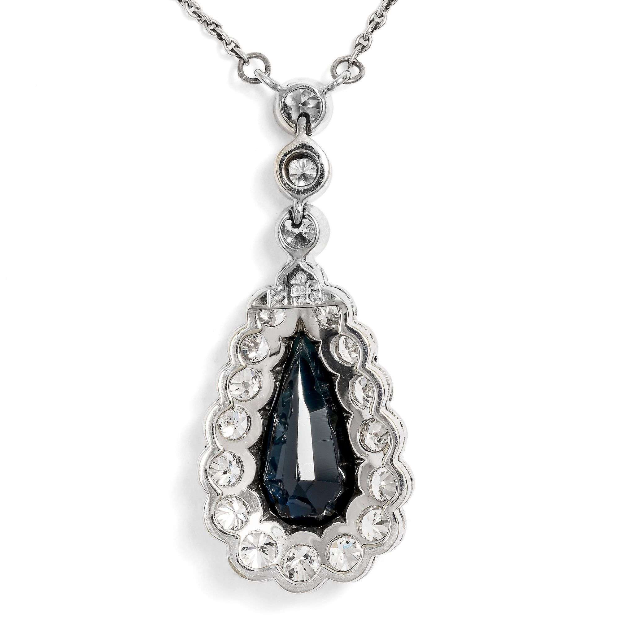 All diese Emotionen einer Ballnacht des vergangenen Jahrhunderts leben im Funkeln der sternengleich schimmernden Diamanten im Altschliff und des nachtblauen Saphirs dieses zarten Colliers weiter. Sechzehn Diamanten sind elegant nebeneinandergesetzt, um einen dunkelblauen Saphir im tropfenförmigen Facettenschliff zu rahmen. Drei weitere Diamanten leiten zu einer zarten Platinkette über, die das funkelnde Arrangement tragbar macht. Alle Steine leuchten weiß und hell.