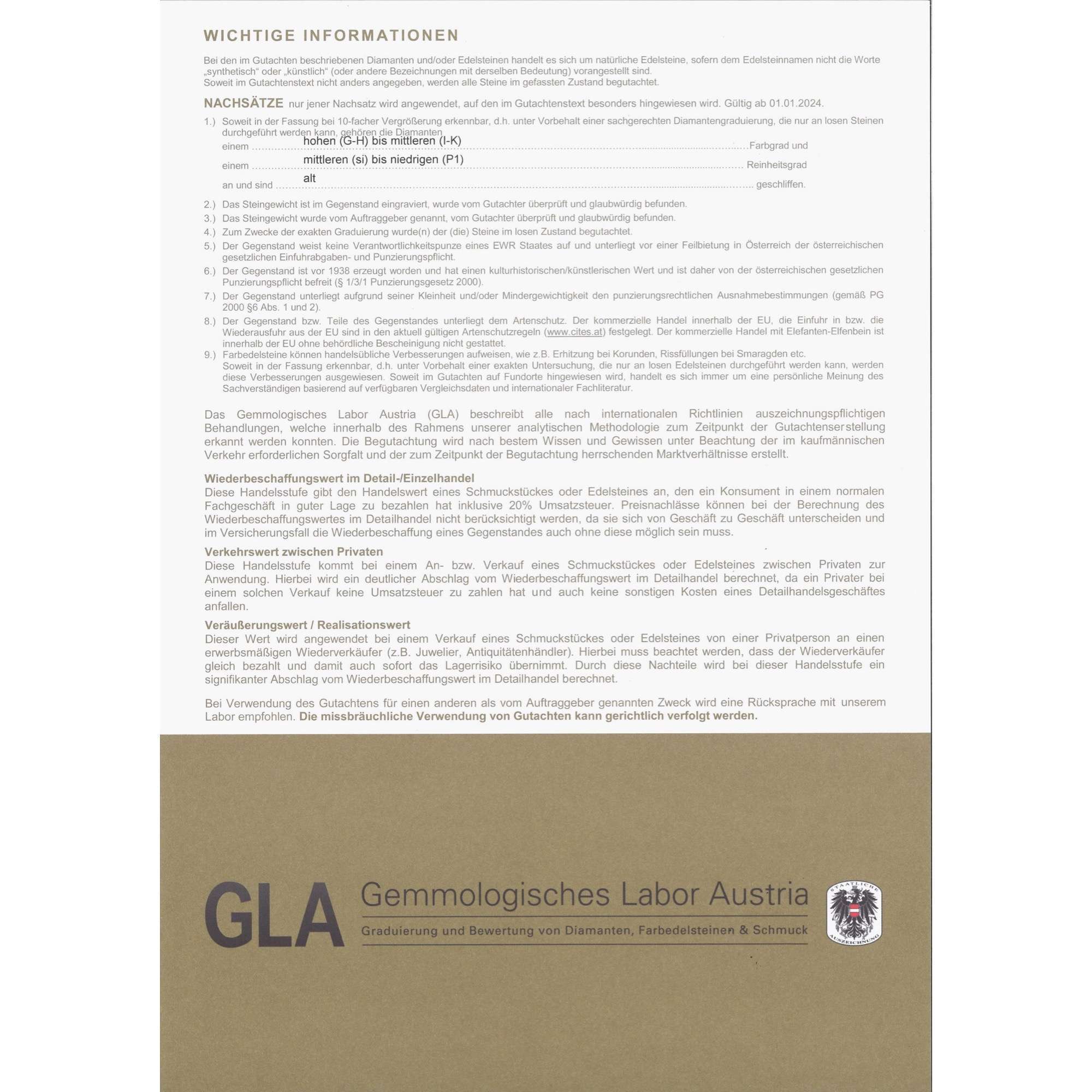 | Zertifikat: | Lieferung mit einem detaillierten Gutachten des Gemmologischen Labors Austria, Wien, vom 8. Juli 2025. Festgestellter Wiederbeschaffungswert: 4.400,- Euro |