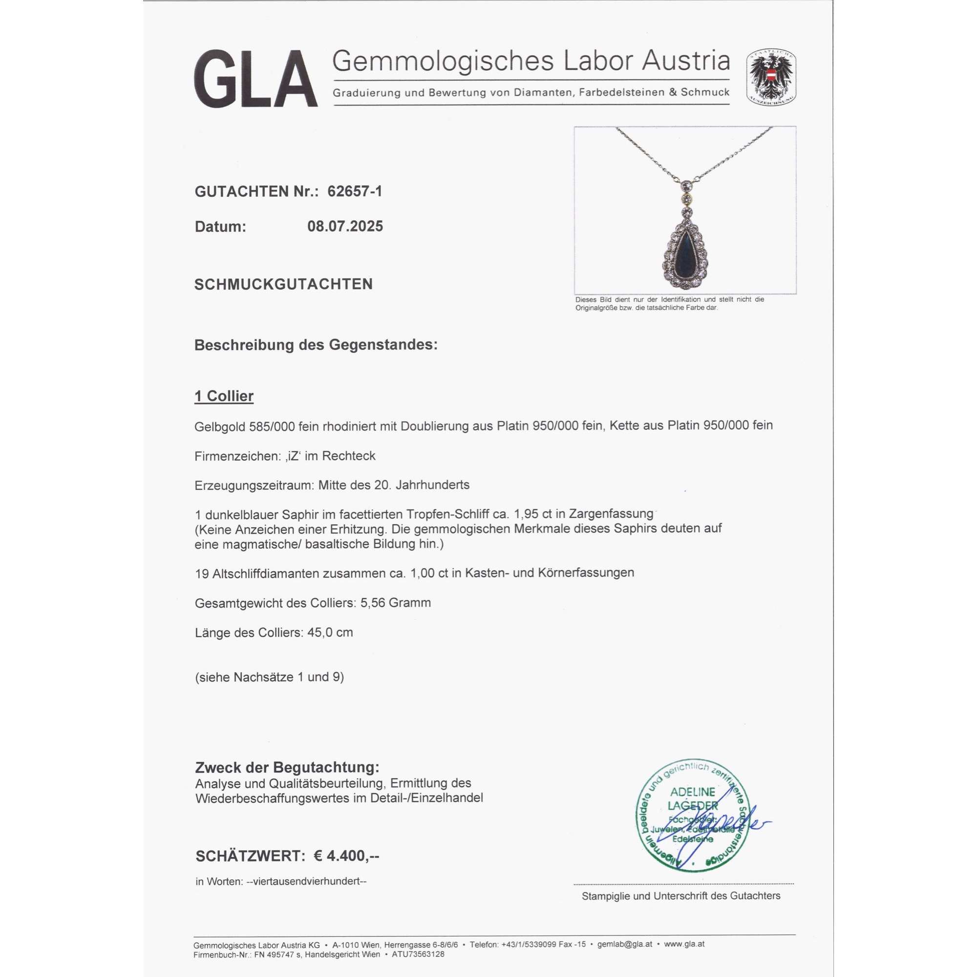 | Zustand: | Sehr gut, die Fassung des mittleren der drei oberen Diamanten wurde in jüngerer Zeit in Weißgold erneuert, das ganze Collier zudem rhodiniert |