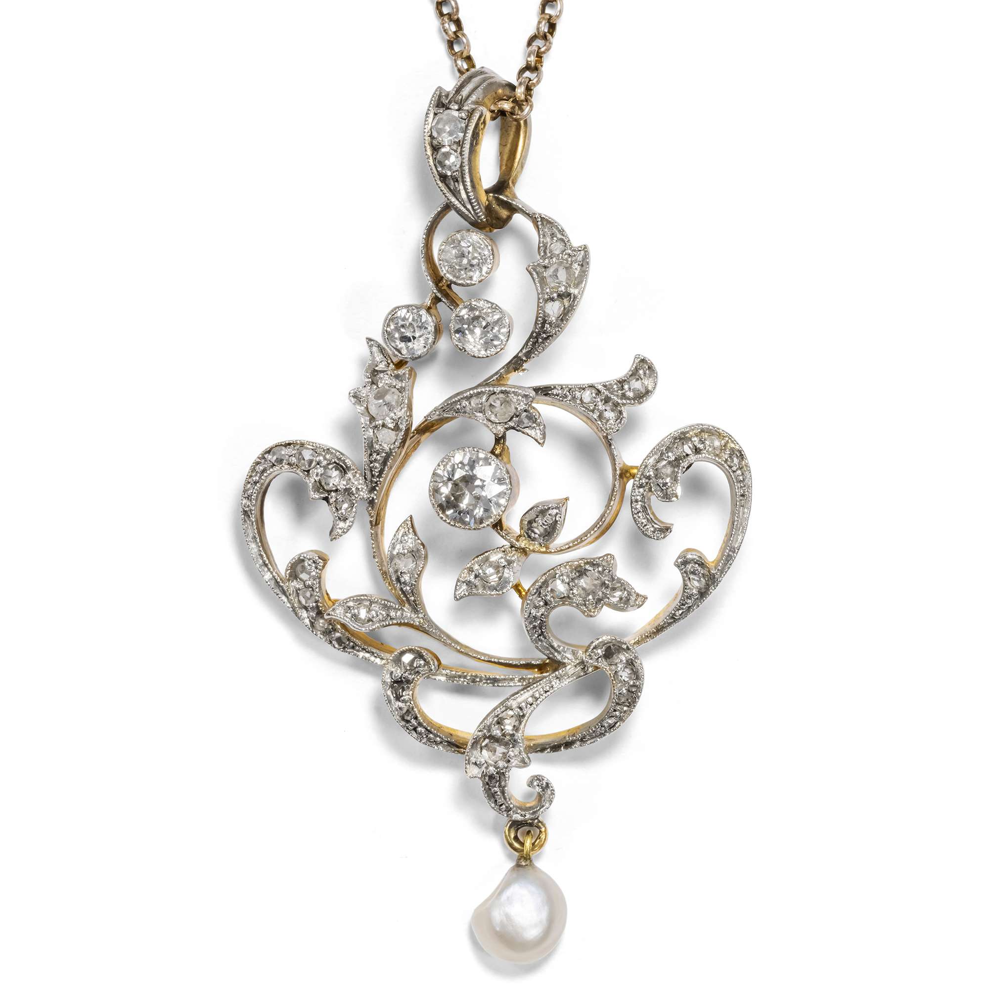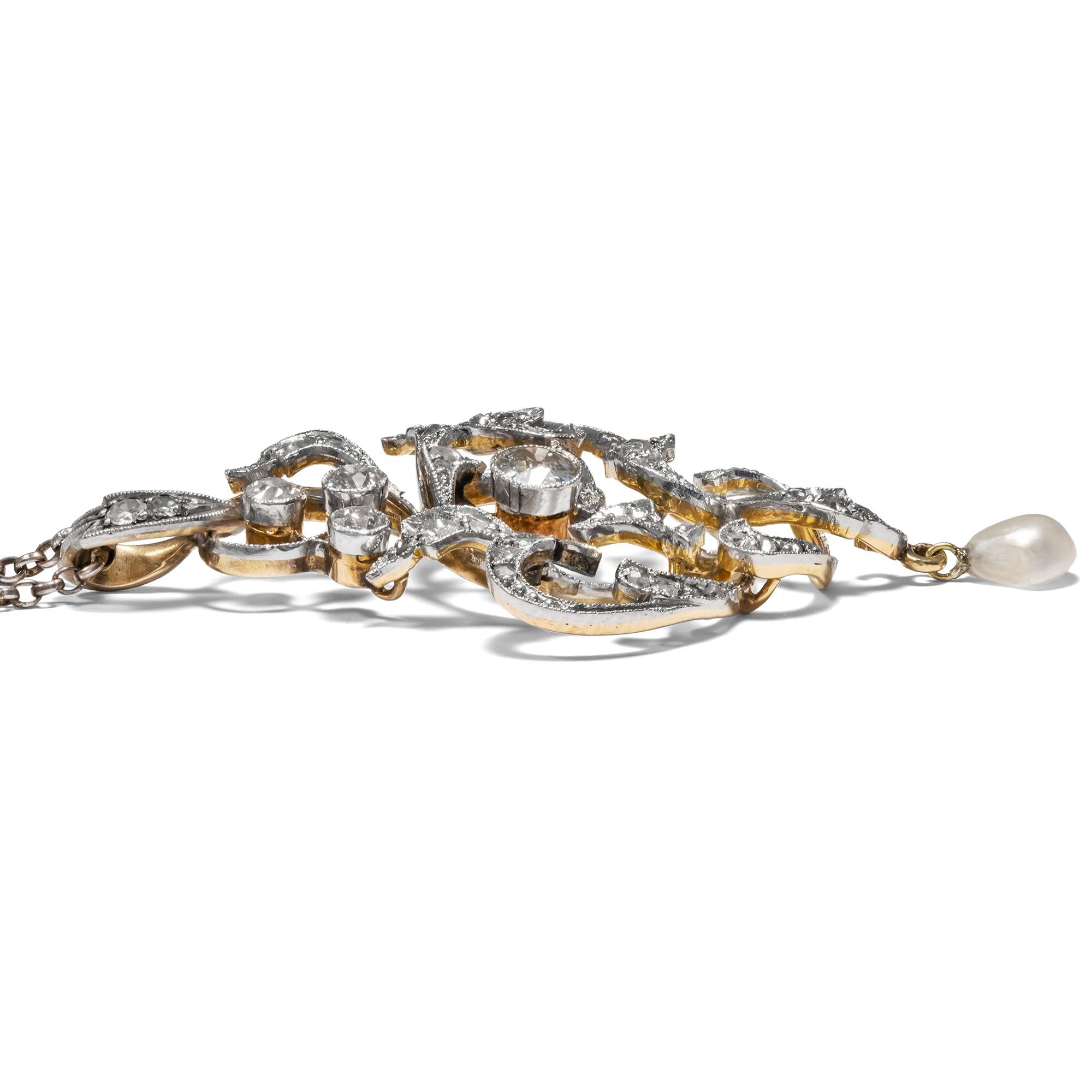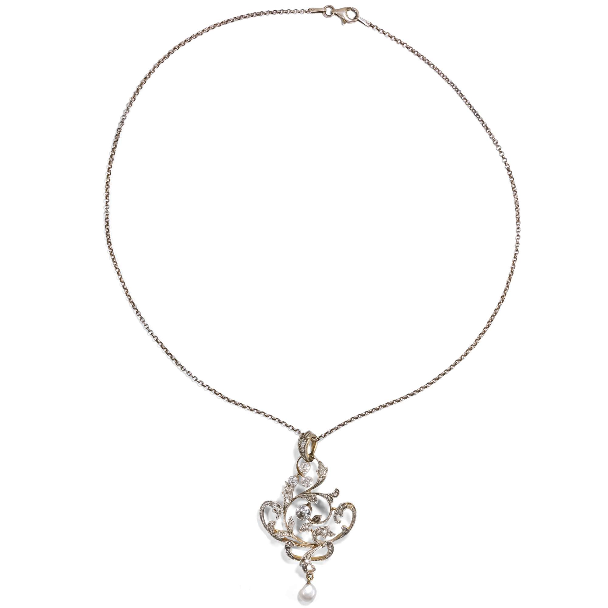 Knapp ein Karat Diamanten besetzt das feine Schmuckstück, dessen leichte Dreidimensionalität zu seinem kunstvollen, beschwingten Eindruck beiträgt. Unten ist eine barocke Perle abgehängt. Die Form wurde mit Feingefühl ausgewählt, denn sie ist unterseitig recht flach und liegt so auf dem Dekolleté auf. Eine spätere Silberkette komplettiert das Schmuckstück.