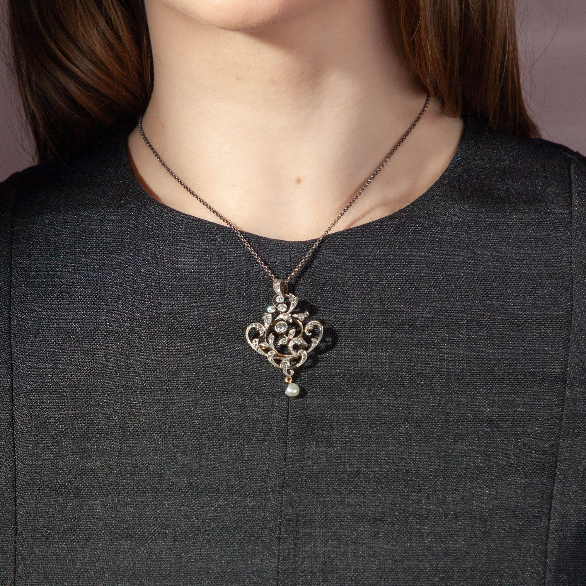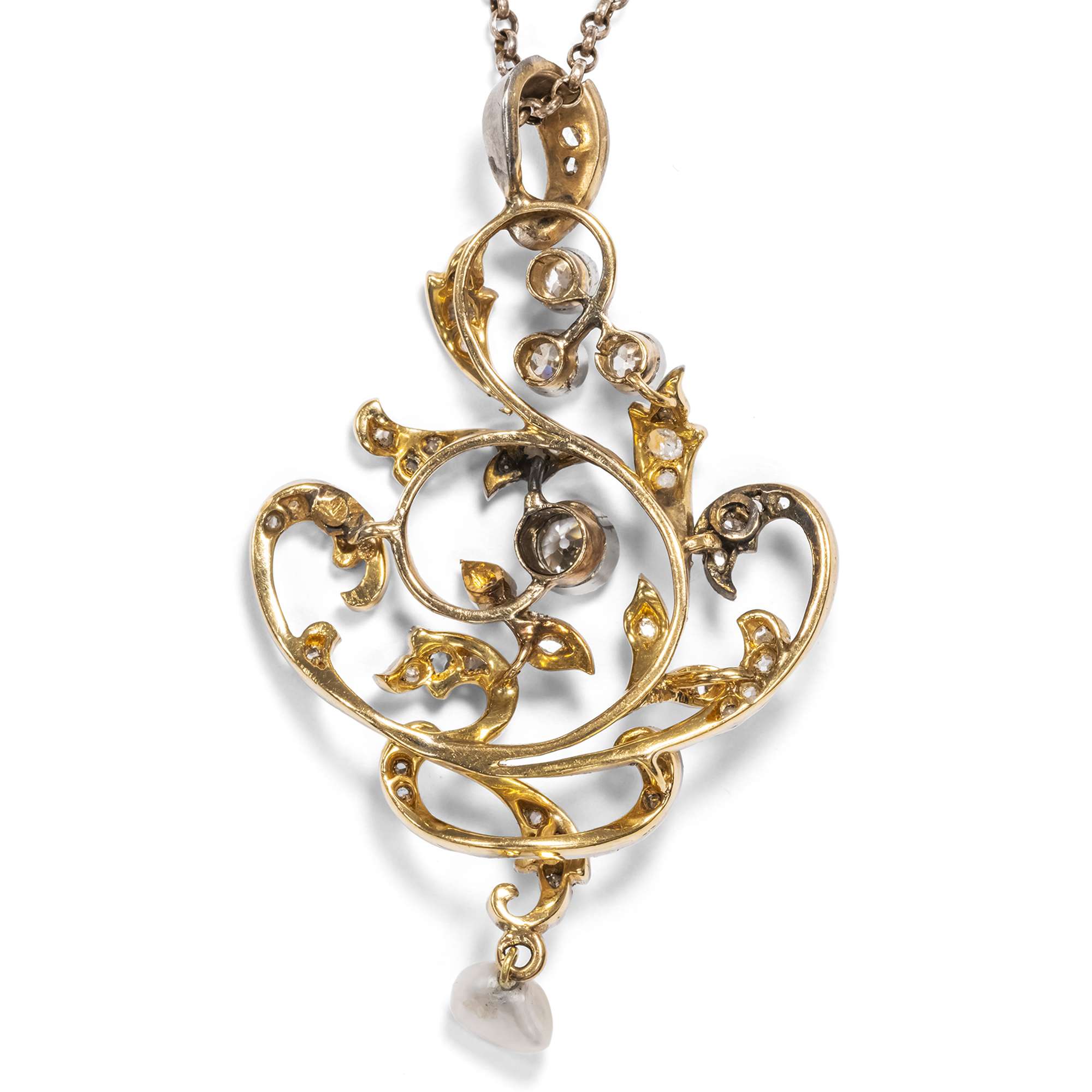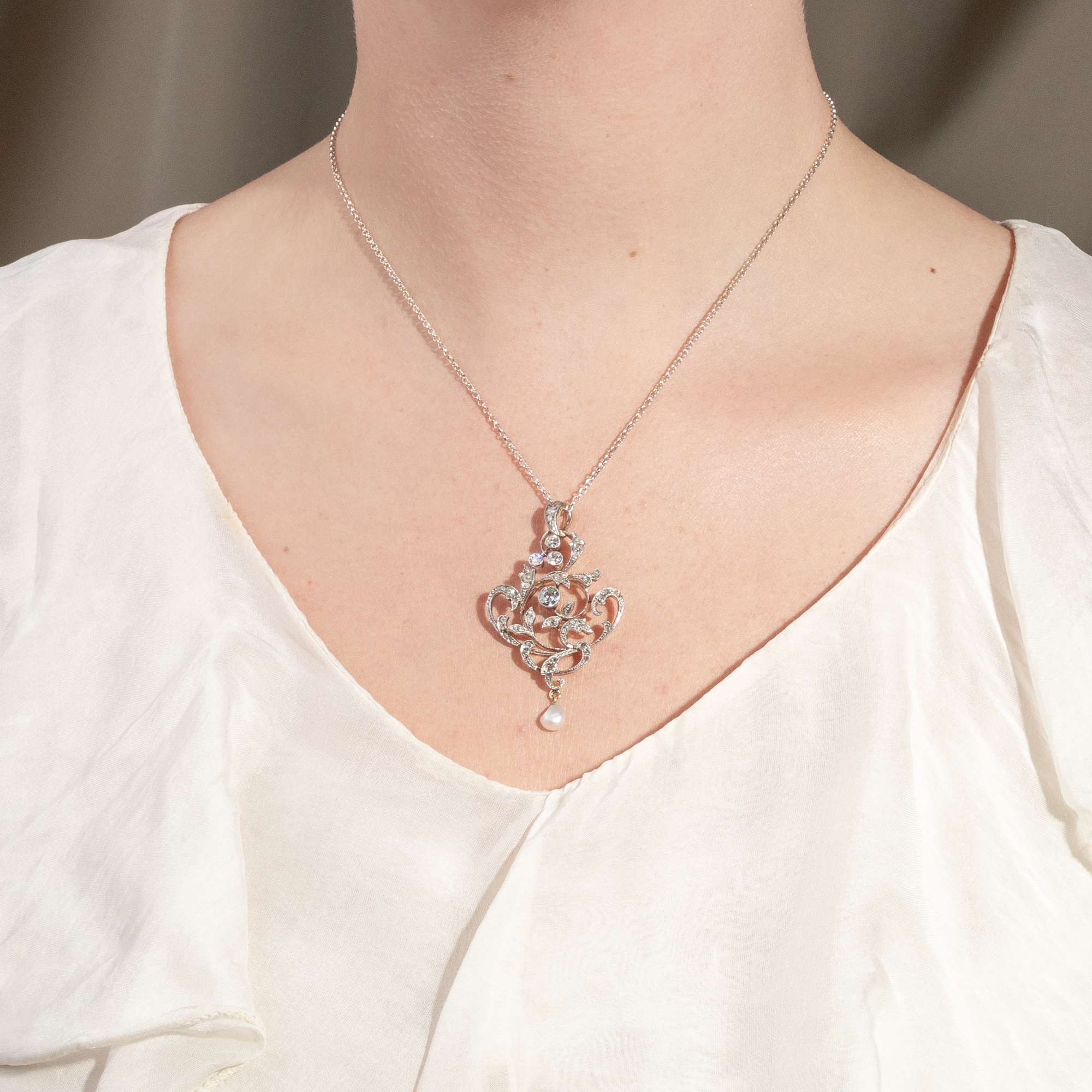Knapp ein Karat Diamanten besetzt das feine Schmuckstück, dessen leichte Dreidimensionalität zu seinem kunstvollen, beschwingten Eindruck beiträgt. Unten ist eine barocke Perle abgehängt. Die Form wurde mit Feingefühl ausgewählt, denn sie ist unterseitig recht flach und liegt so auf dem Dekolleté auf. Eine spätere Silberkette komplettiert das Schmuckstück.