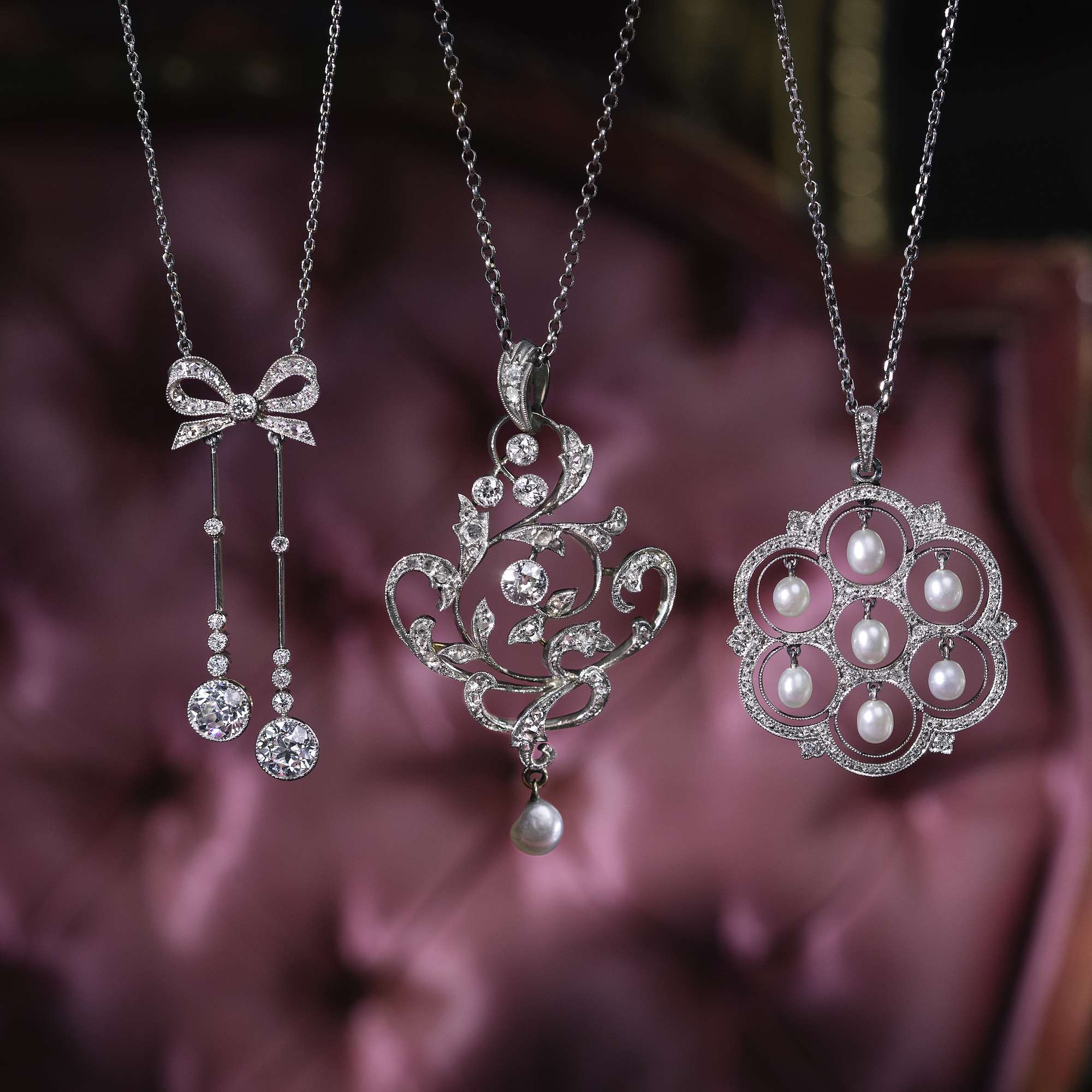 Solch ein Juwel des Neo-Rokoko, um 1900 auch als „drittes Rokoko“ bezeichnet, ist der hier vorliegende Anhänger. Seine beschwingten, asymmetrisch-vegetabilen Formen sind dem Rokoko der Mitte des 18. Jahrhunderts entlehnt – nicht allein seinen Juwelen, sondern auch Interieurdekorationen wie vergoldeten Kerzenhaltern. Die Eigenständigkeit des Entwurfs besteht in der zeitgenössischen Neuinterpretation dieser Formen, kombiniert mit den damals ganz modernen, runden Altschliff-Brillanten und in der damals völlig neuen Technik von Platin auf Gold.