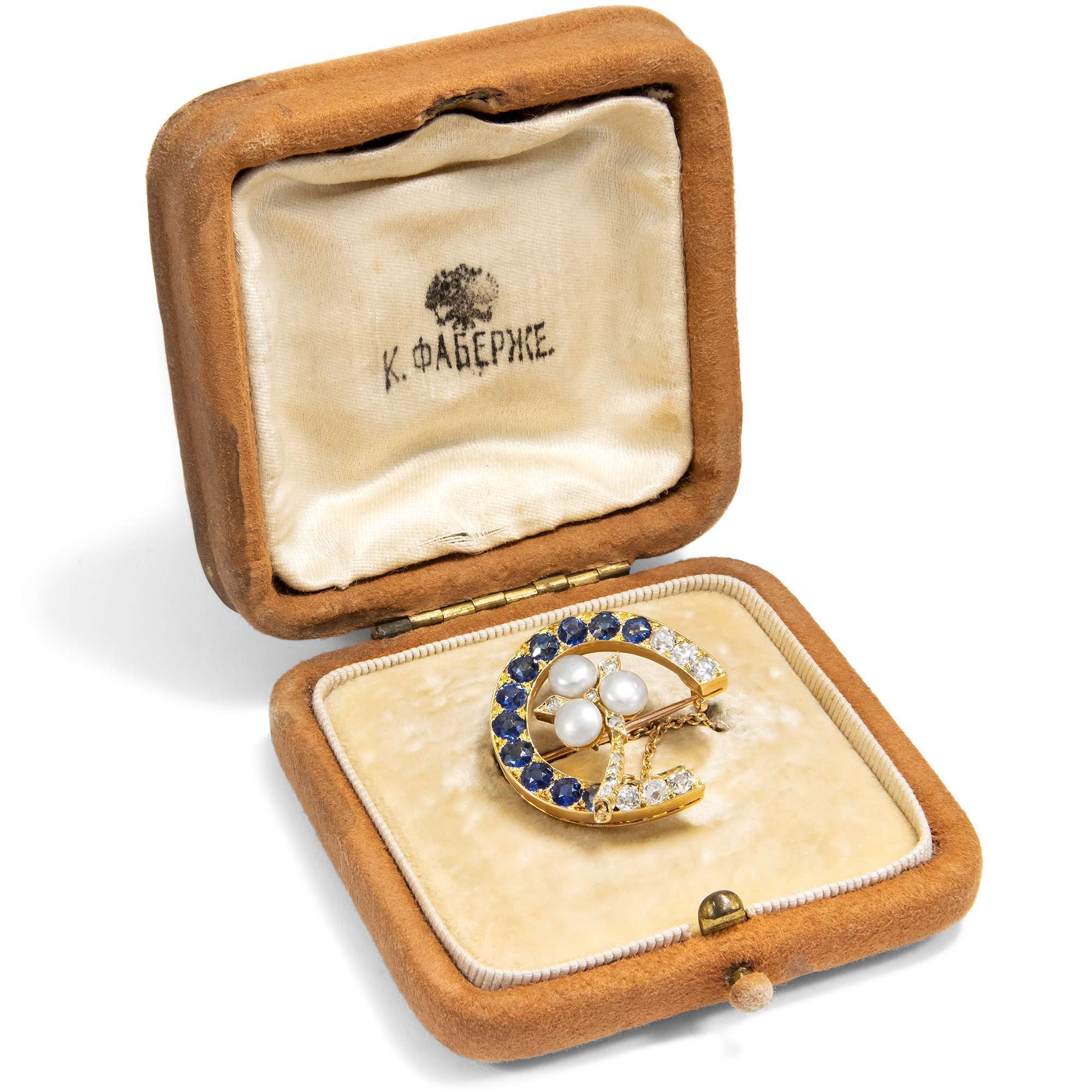 | Weiteres: | Lieferung in dem abgebildeten, passend eingerichteten Etui mit eingestempelten Schriftzug „К.ФАБЕРЖЕ.“ Dazu liegt eine Rechnung der Antique Collector Galerie in Zürich zur Brosche vom März 1997 vor über 28.000,00 Schweizer Franken. |