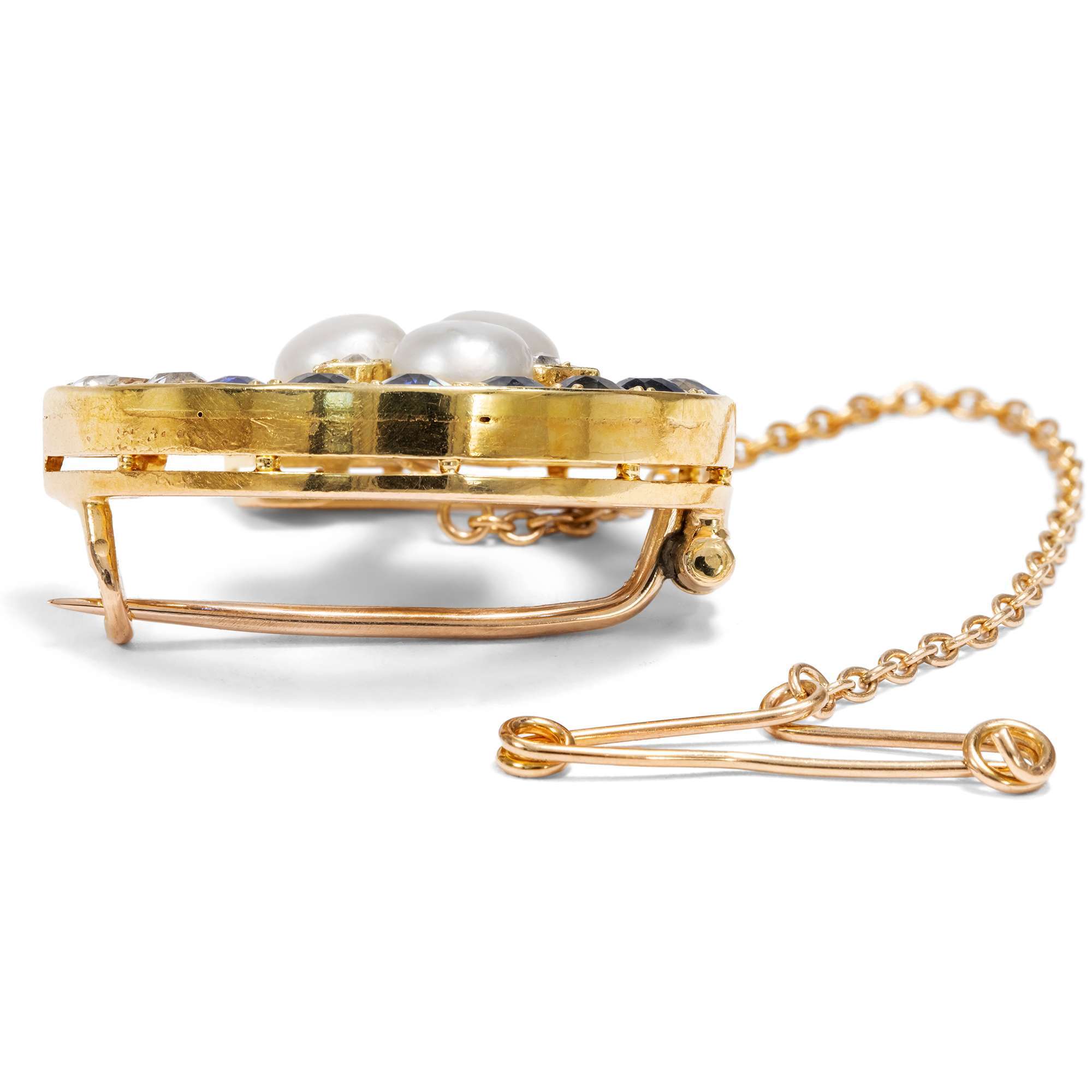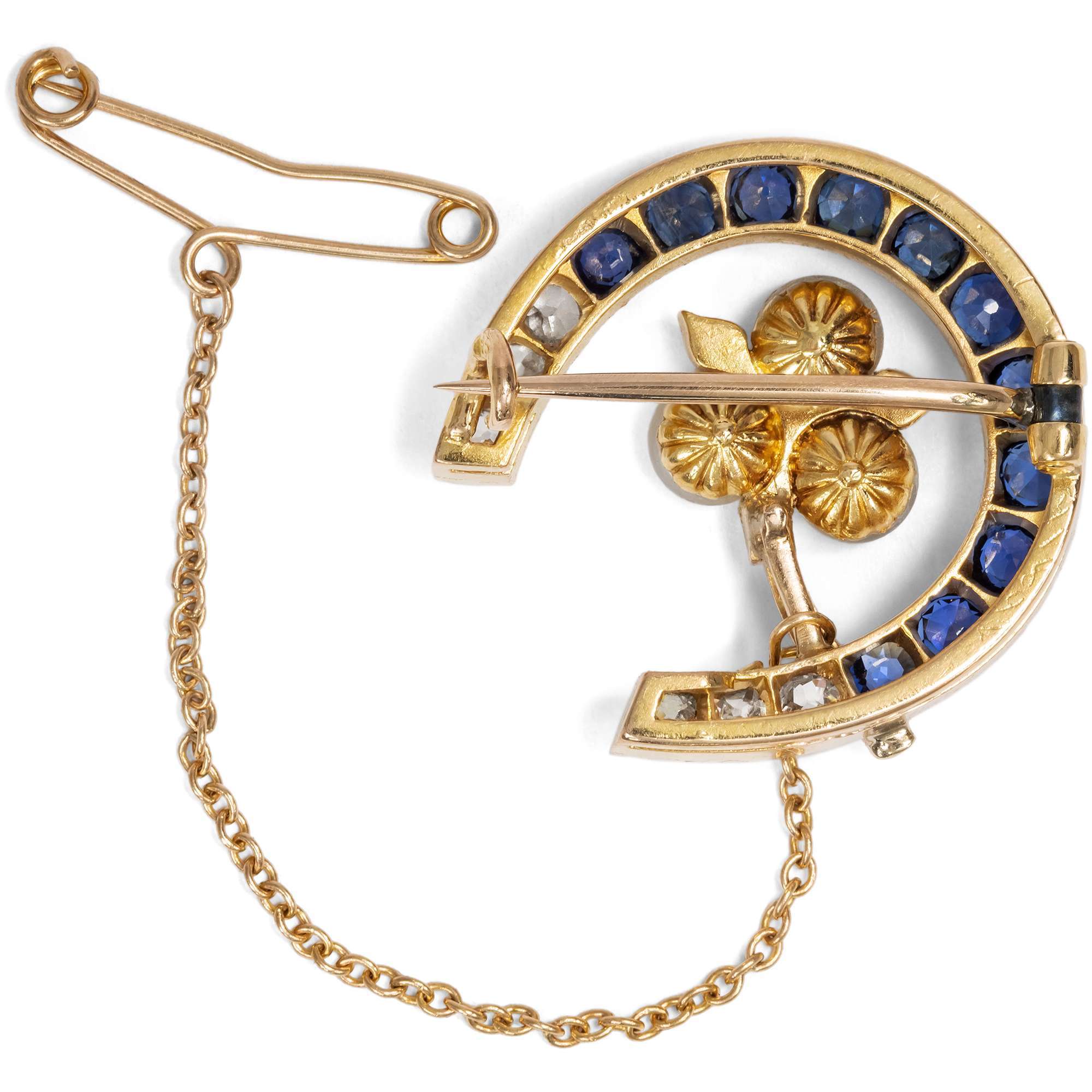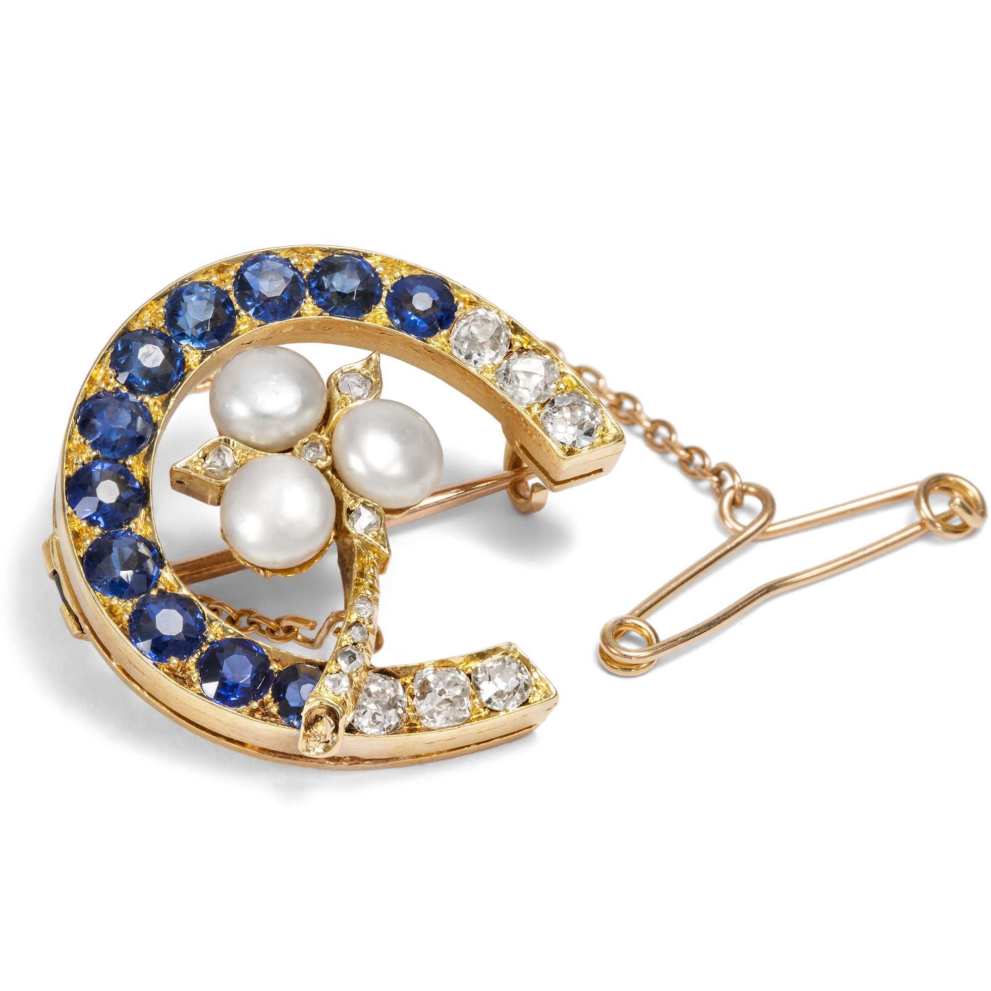 Die hier vorliegende Brosche aus Gold ist in Form eines Hufeisens entworfen. Dabei zeigt das Eisen nach unten und hält das Glück somit fest. Leuchtende Diamanten und funkelnde Saphire von sehr guter Qualität besetzen das Hufeisen. Zudem umfasst es eine kleine Blume, die aus drei natürlichen Orientperlen und kleinen Diamanten gebildet wird.